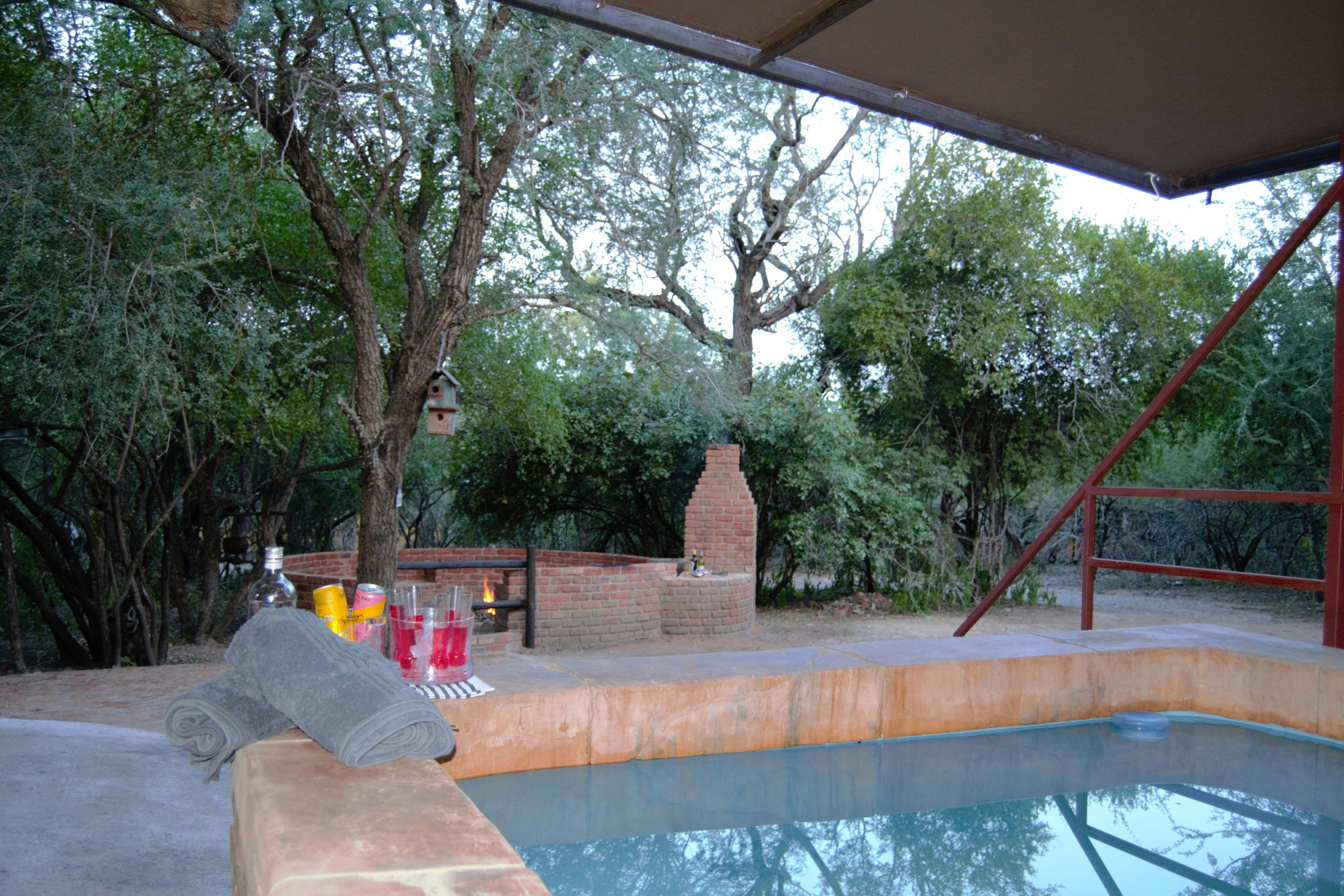 Guests can enjoy a splash pool, as well as a big boma with a braai and a fire pit. During the day a wide variety of animals are lingering around and visit the small pond next to patio to quench their thirst. There is a thatched carport for 2 vehicles. After sunset bushbabies will visit their feeding station their favourite is bananas and honey.