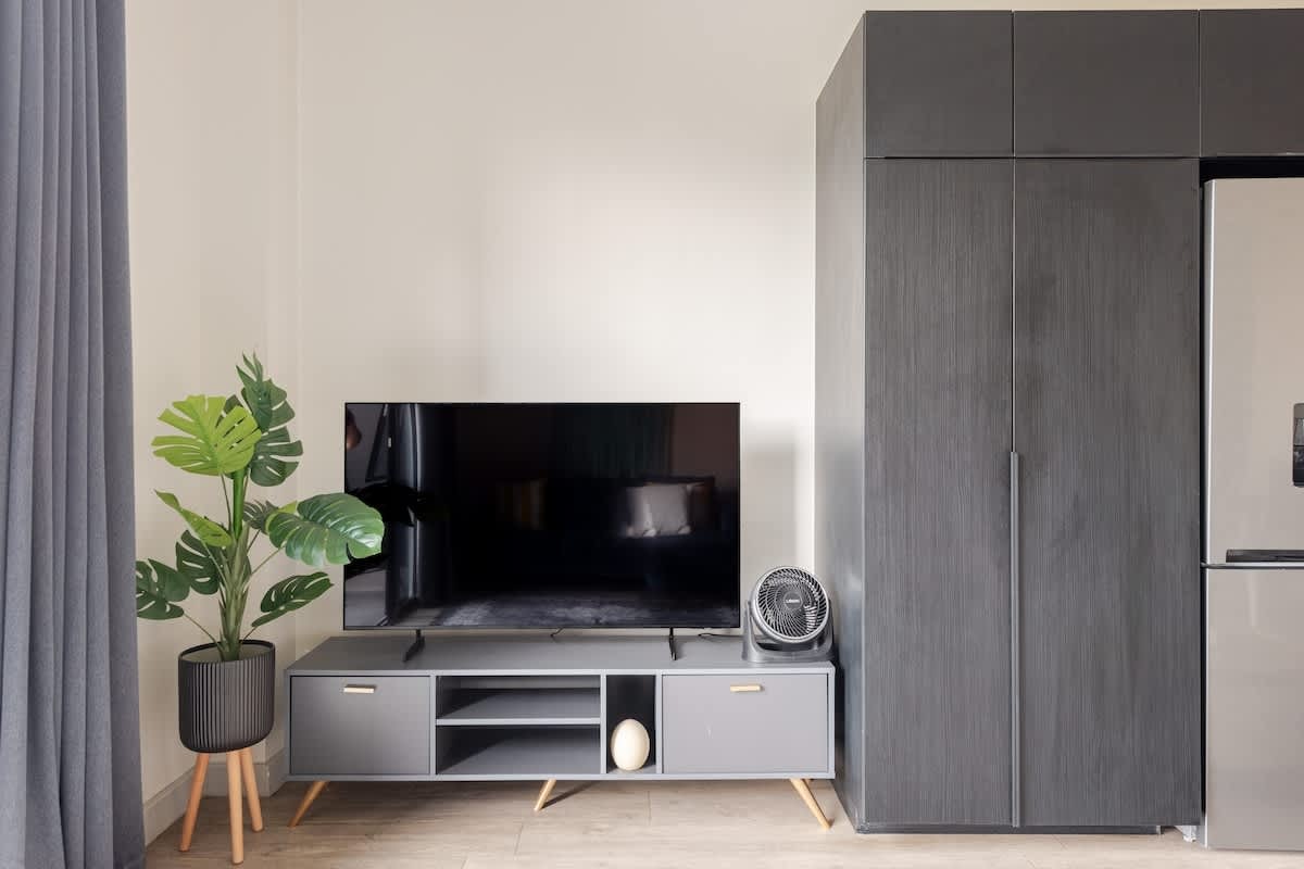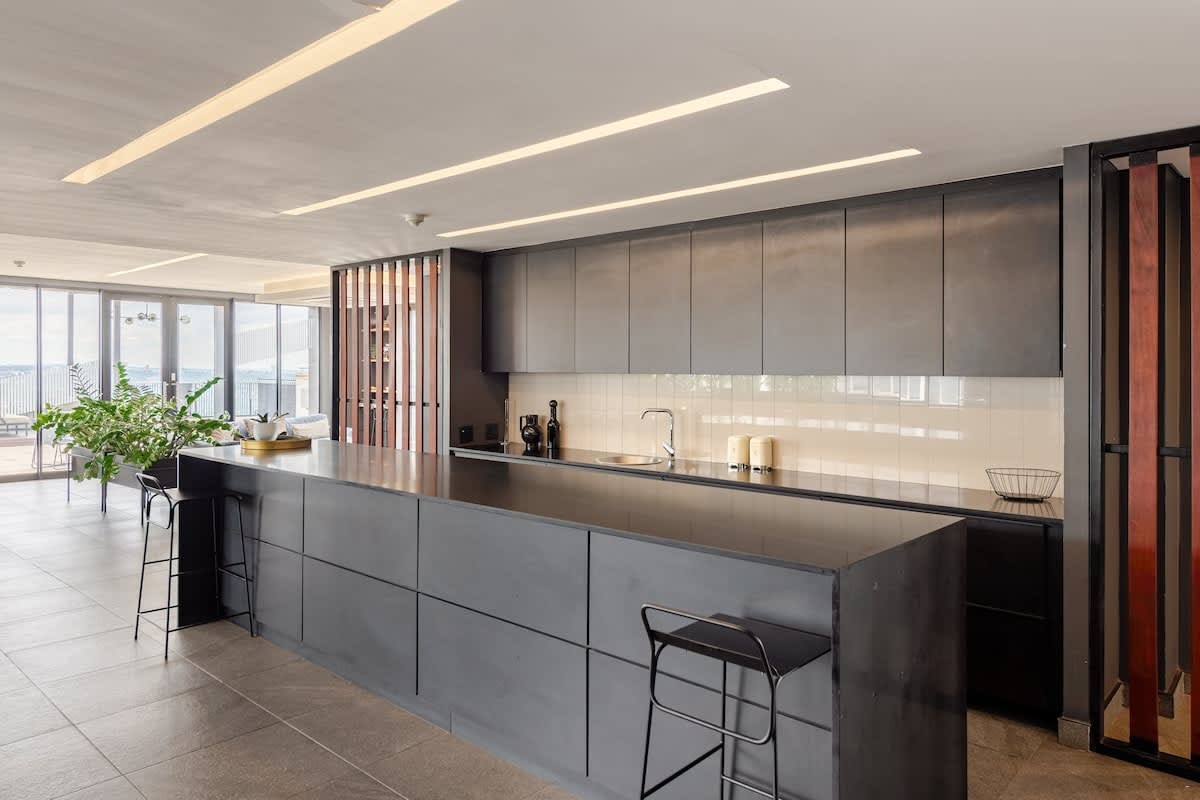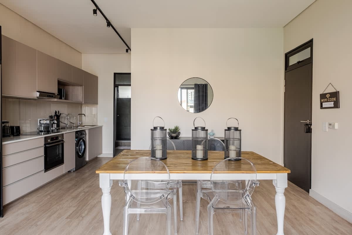Die kombuis is toegerus met 'n yskas-vrieskas, mikrogolfoond, oond, stoof, koffiemasjien en tee- en koffiemaakgeriewe. Gaste kan maaltye geniet by die eetkamertafel met vier sitplekke. Die sitkamer is gemeubileer met 'n gemaklike rusbank en 'n slim-TV met stromingsdienste en DStv. Lugversorging en WiFi is ook beskikbaar. Die leefarea lei na 'n privaat balkon met buitemeubels en pragtige uitsigte oor die stad.