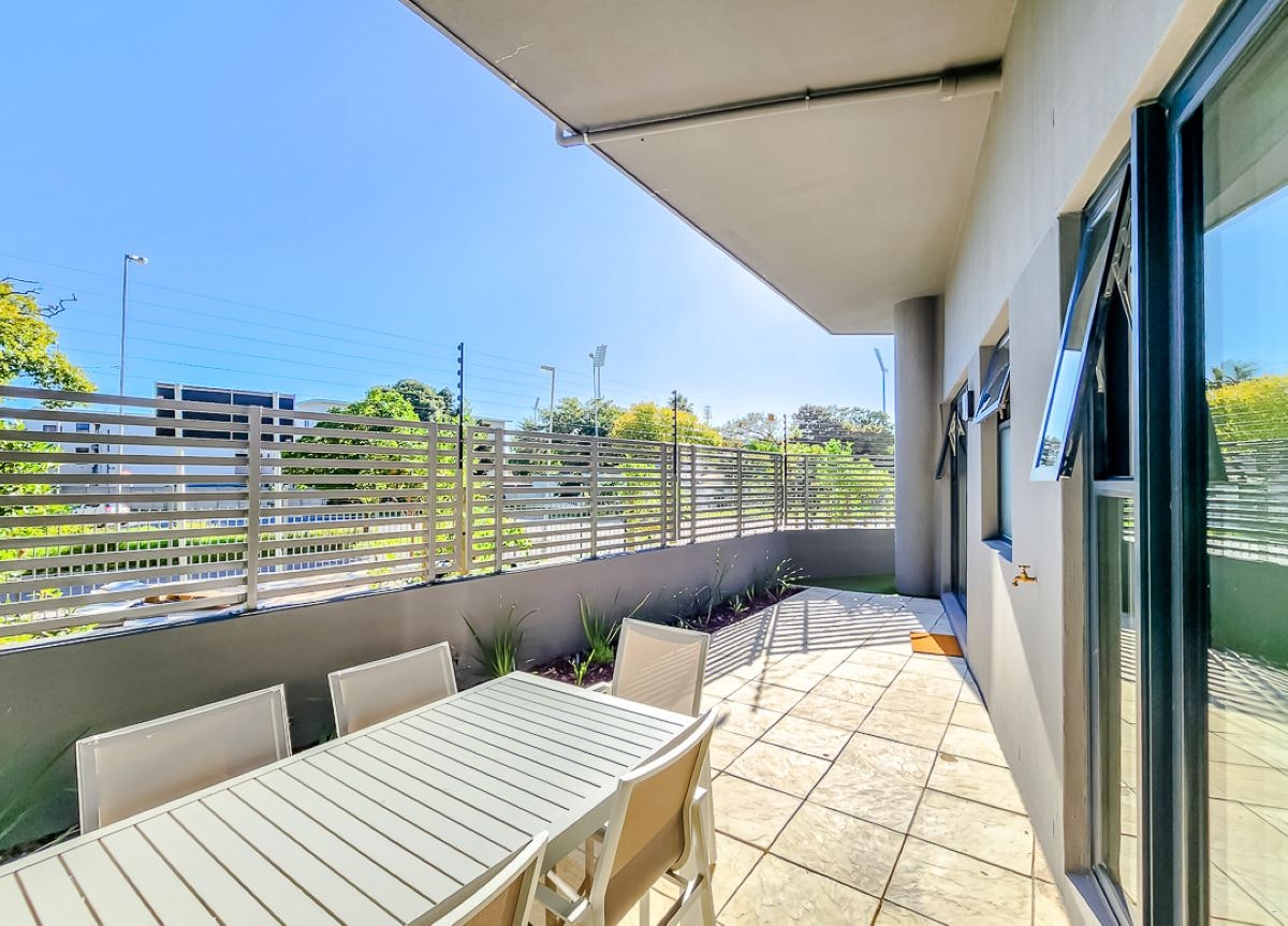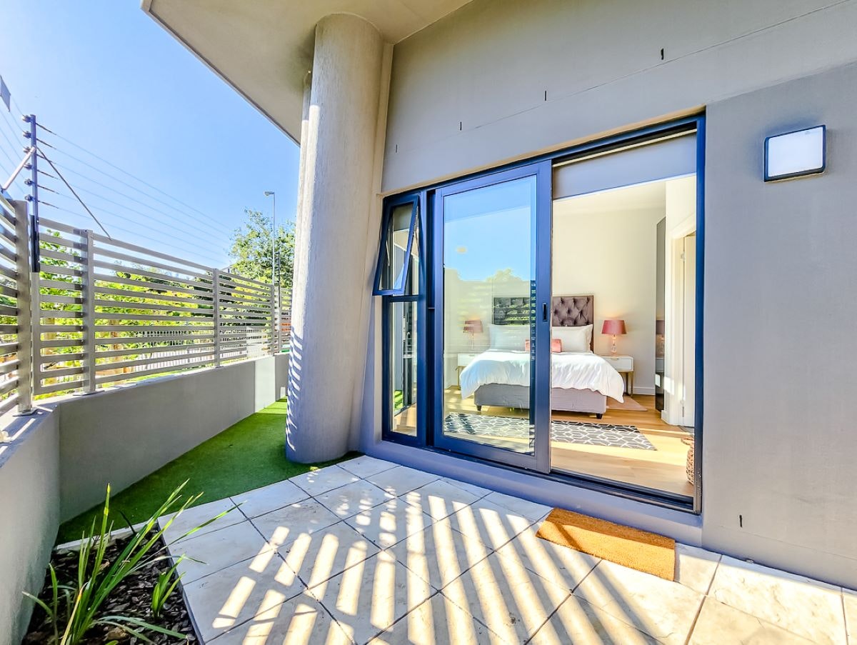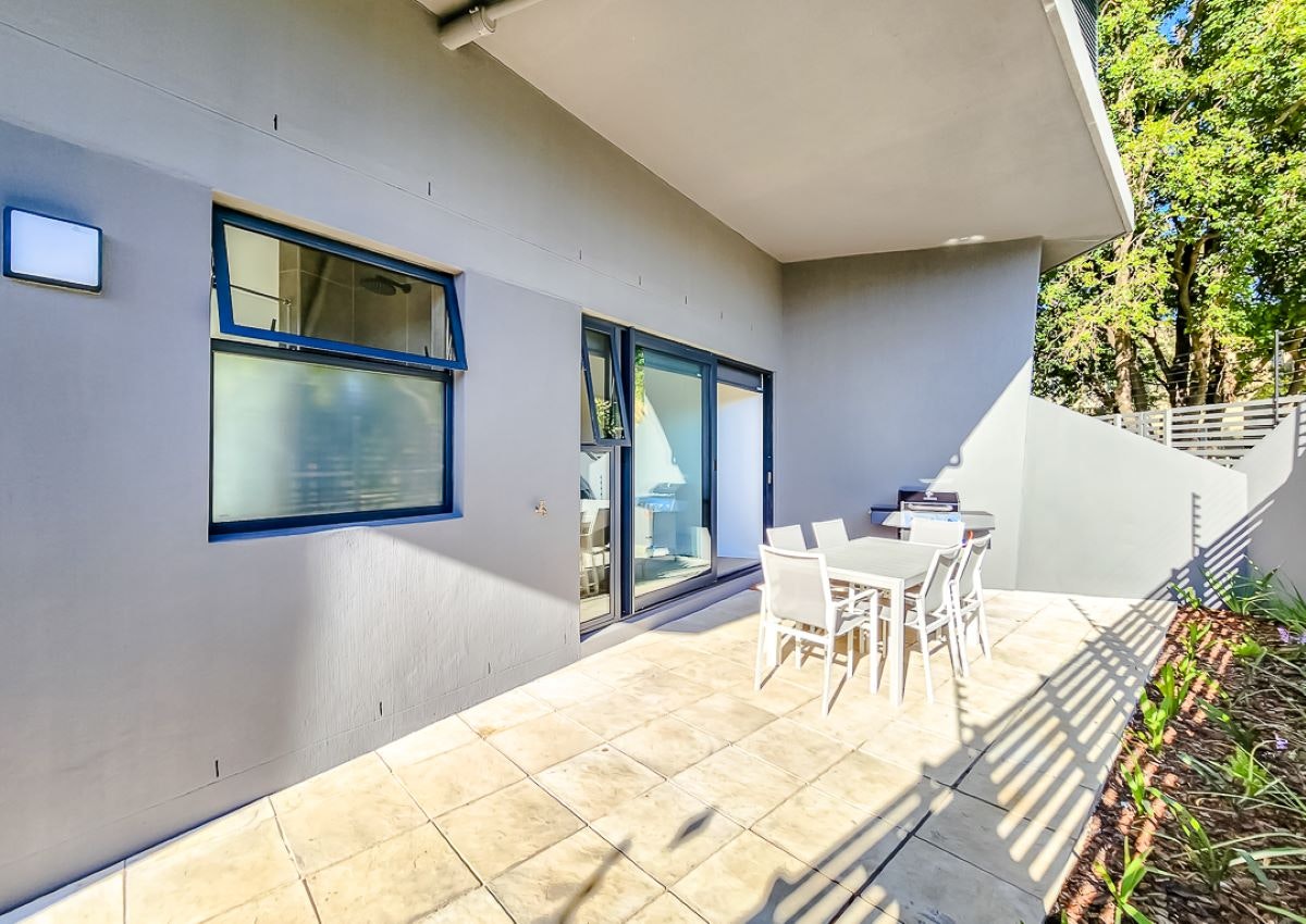 The living area opens onto a patio, featuring a dining area and a free-standing gas braai. Guests have access to communal facilities like a swimming pool, gym, restaurant and picnic area. Access to secure parking is available.