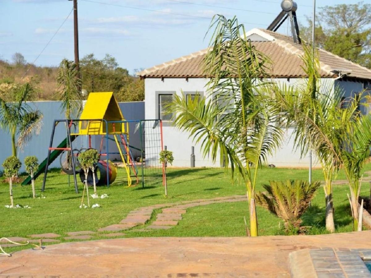 The lodge has a large dining room with a bar, outdoor swimming pools, braai facilities, a children’s jungle gym, and a garden. Parking is available.