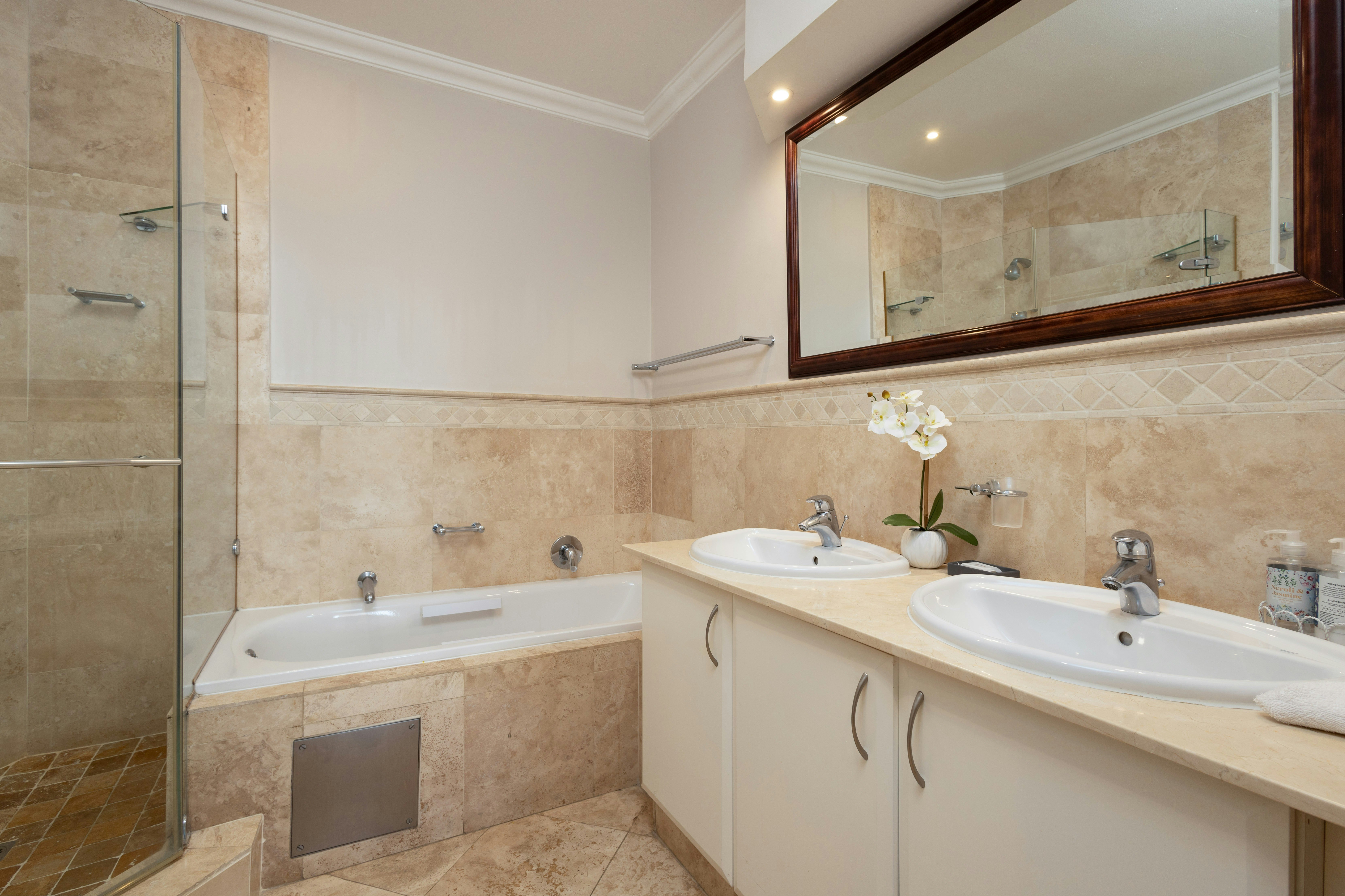The kitchen is fully equipped for self-catering with a fridge-freezer, stove and oven, a microwave, dishwasher, washing machine, and a tumble-dryer. The lounge area contains a TV with selected DStv channels.