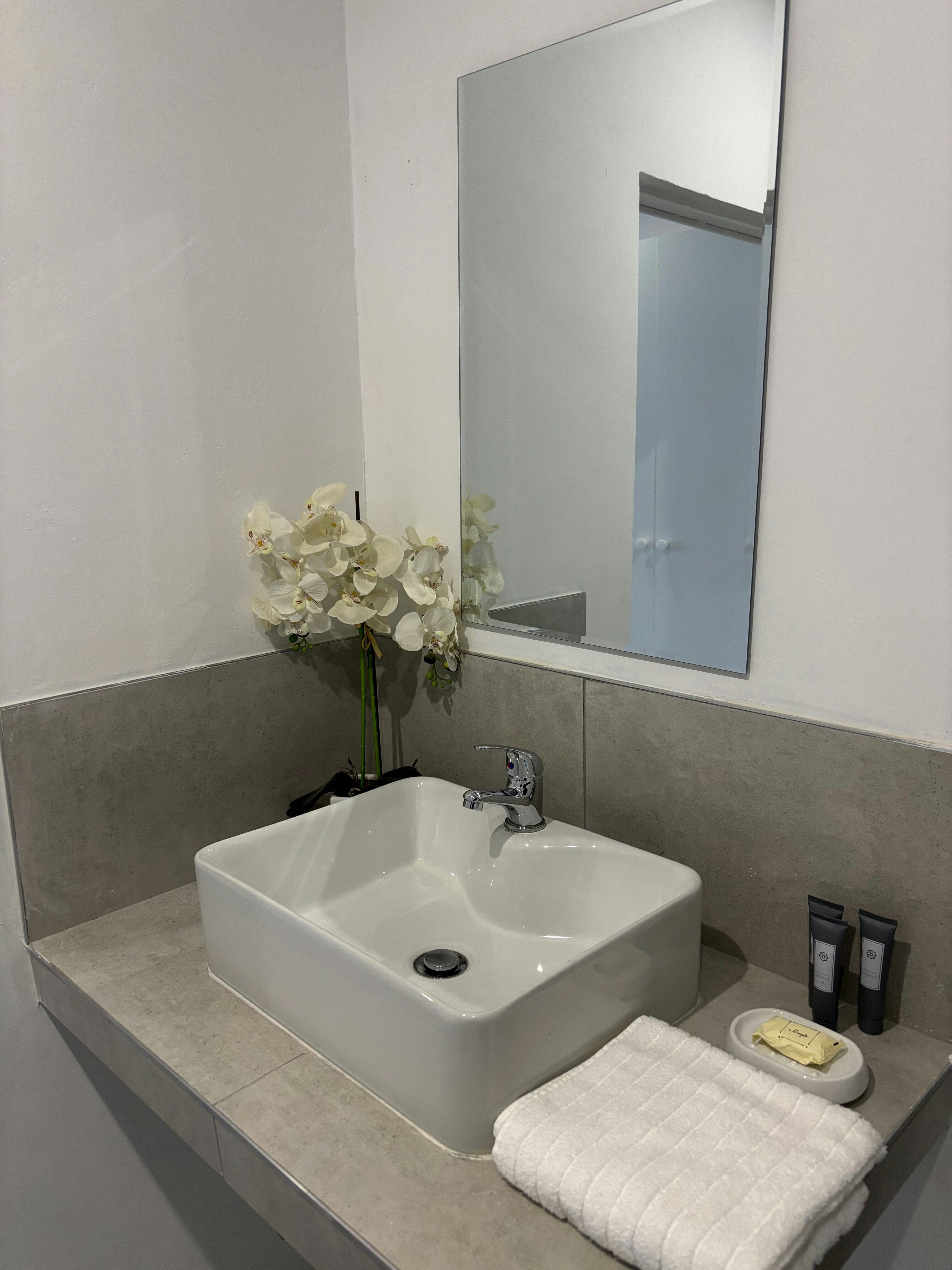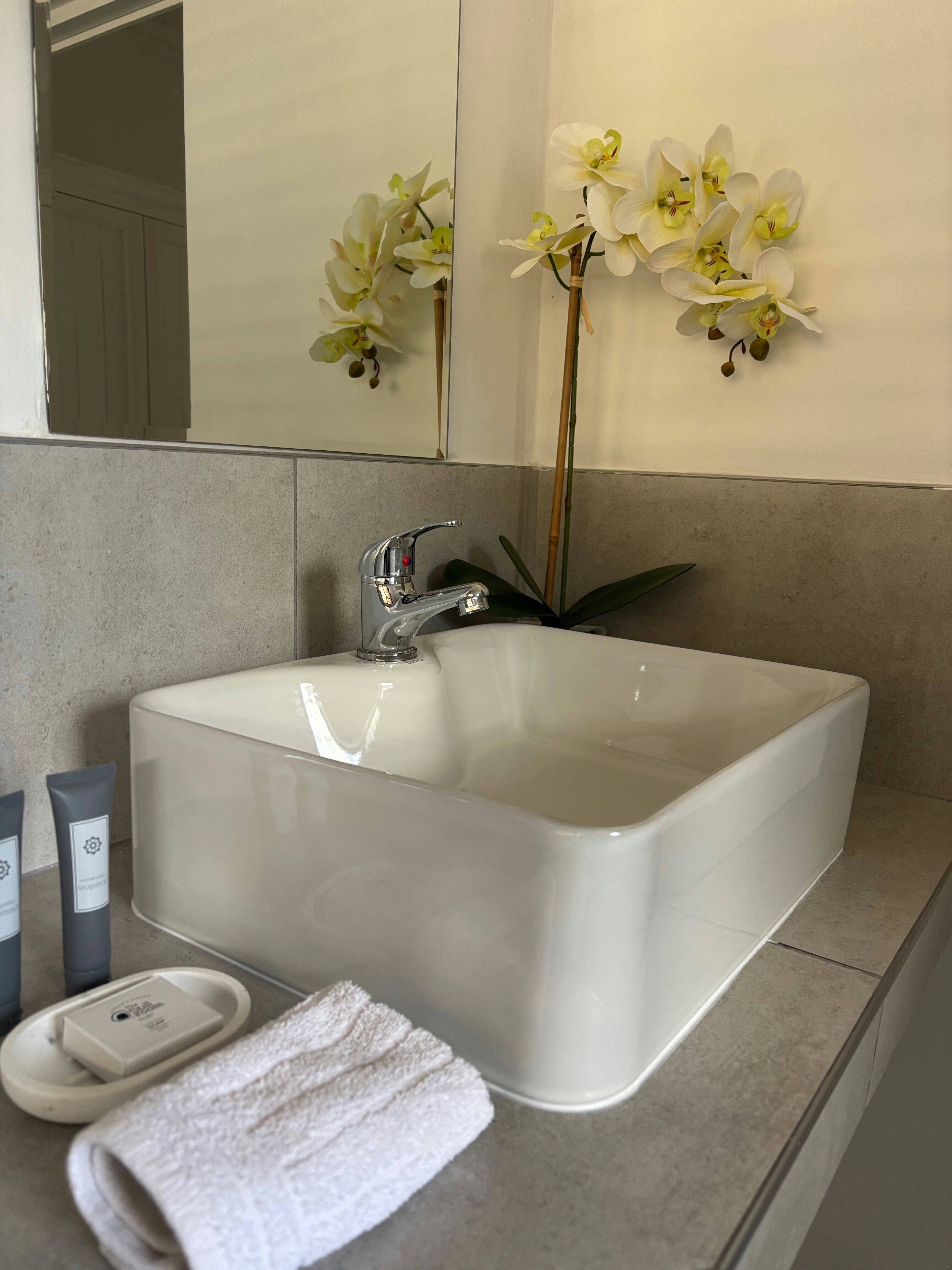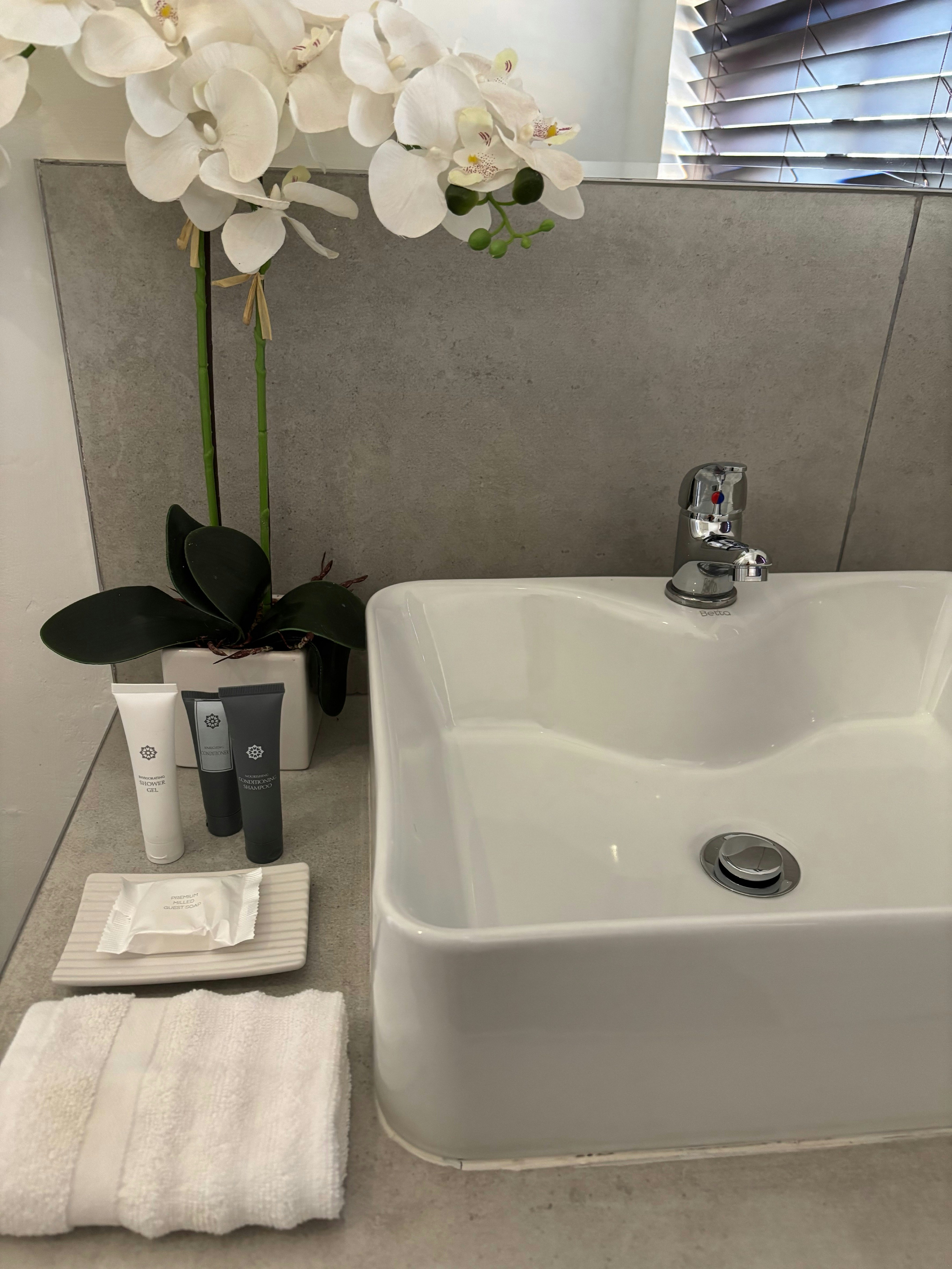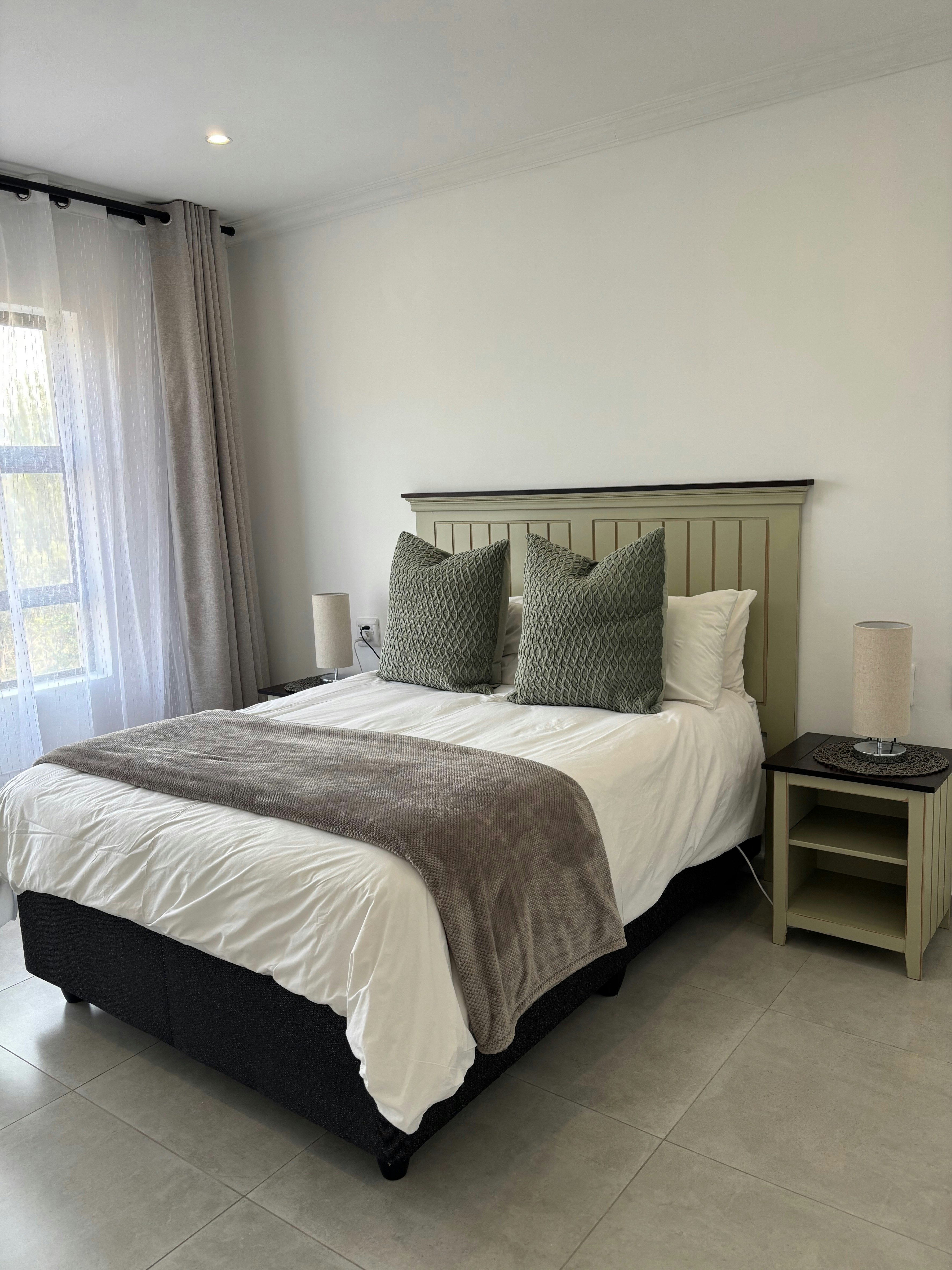The unit can accommodate up to six guests and comprises three bedrooms and three bathrooms. Each bedroom is furnished with a queen-size bed and has an en-suite bathroom fitted with a shower, washbasin, and toilet—one of which also includes a bath.