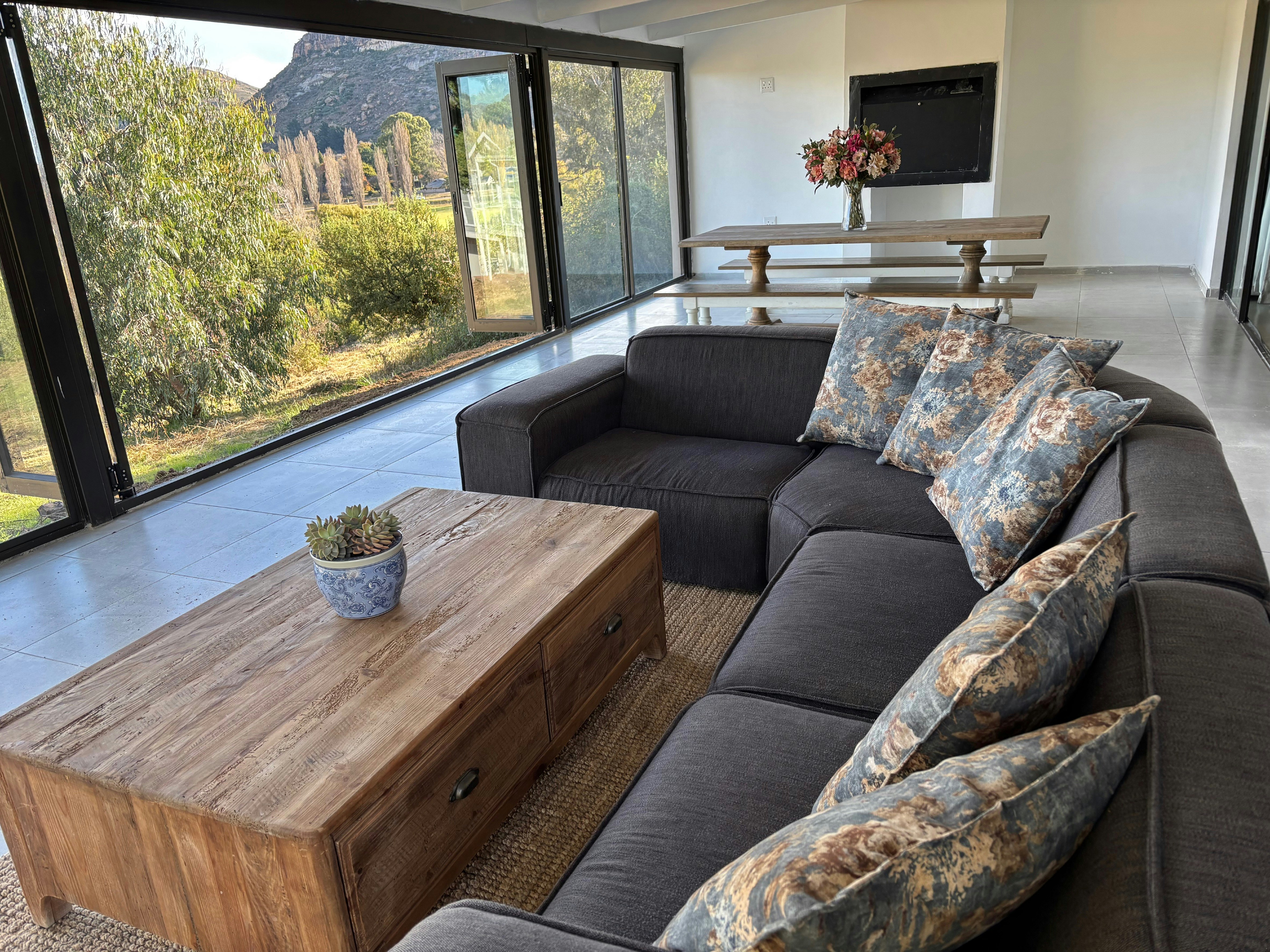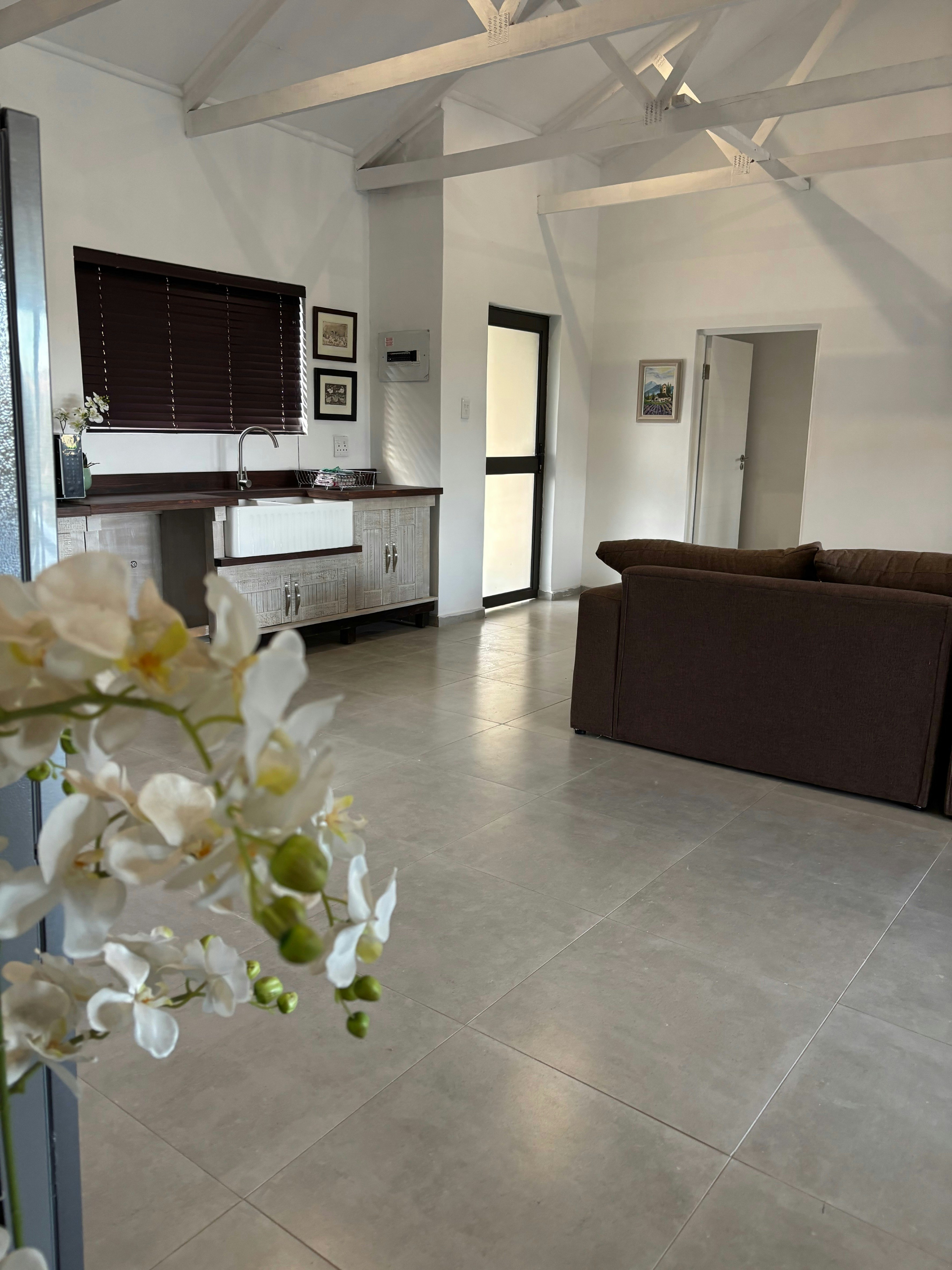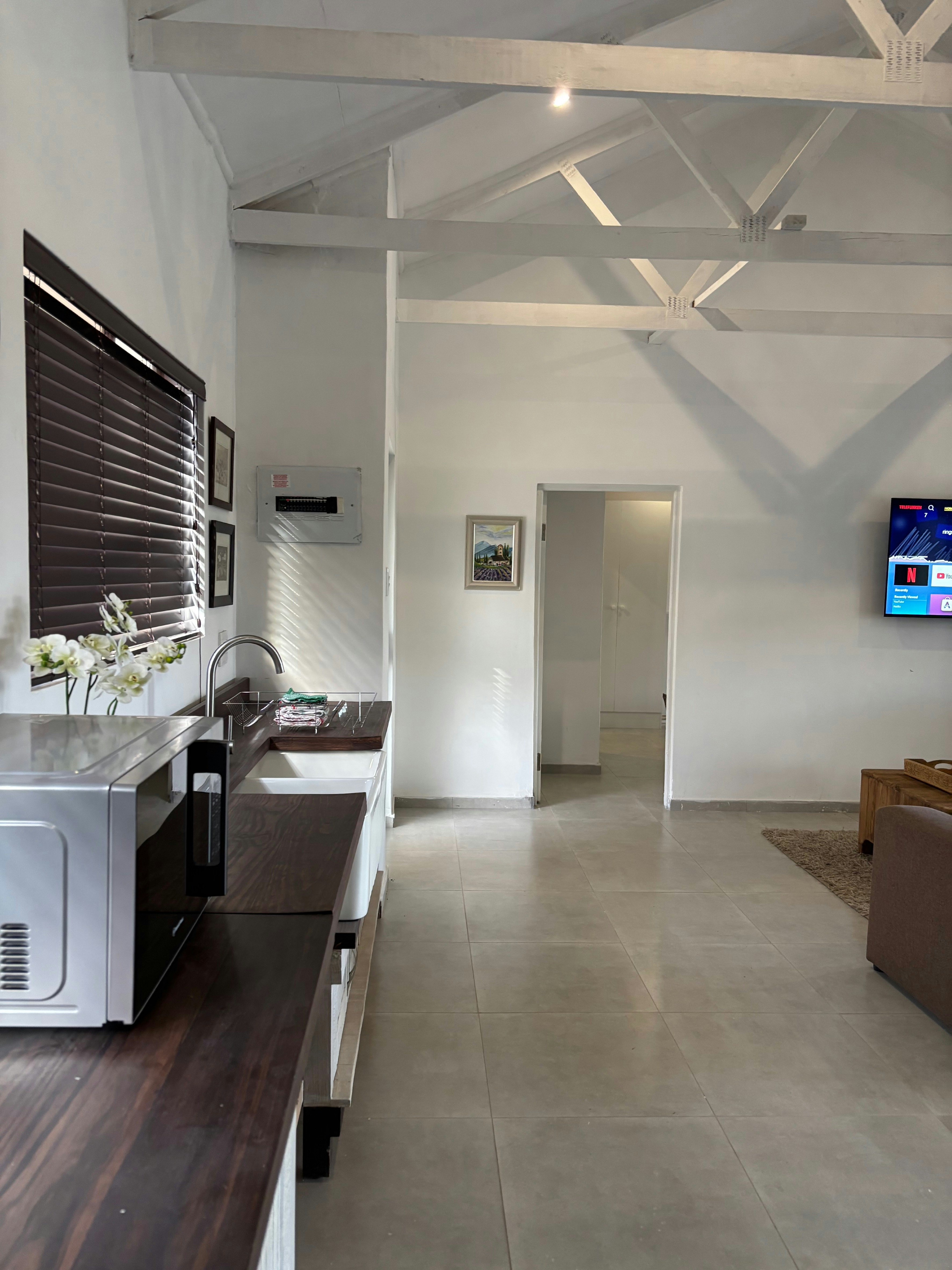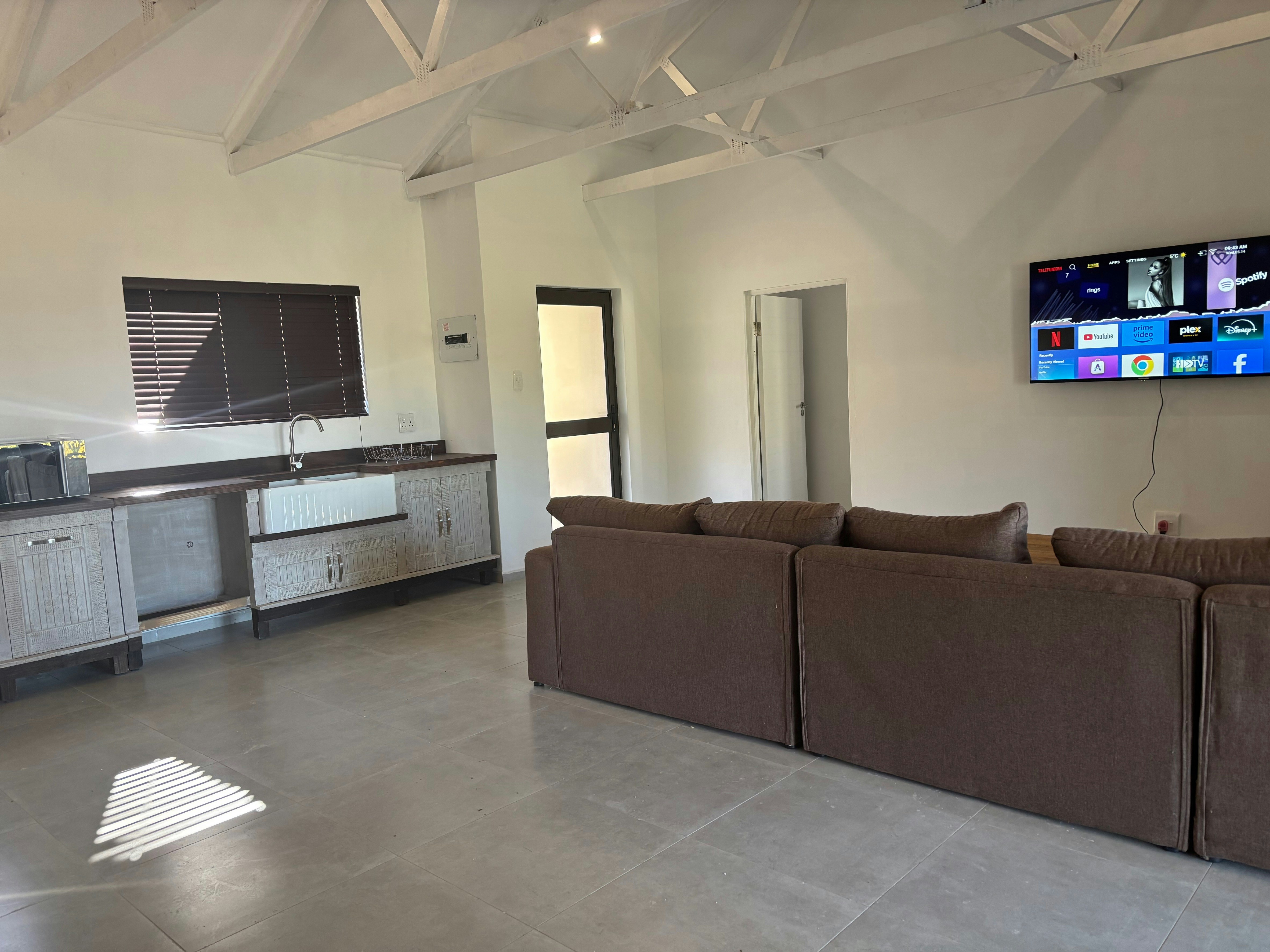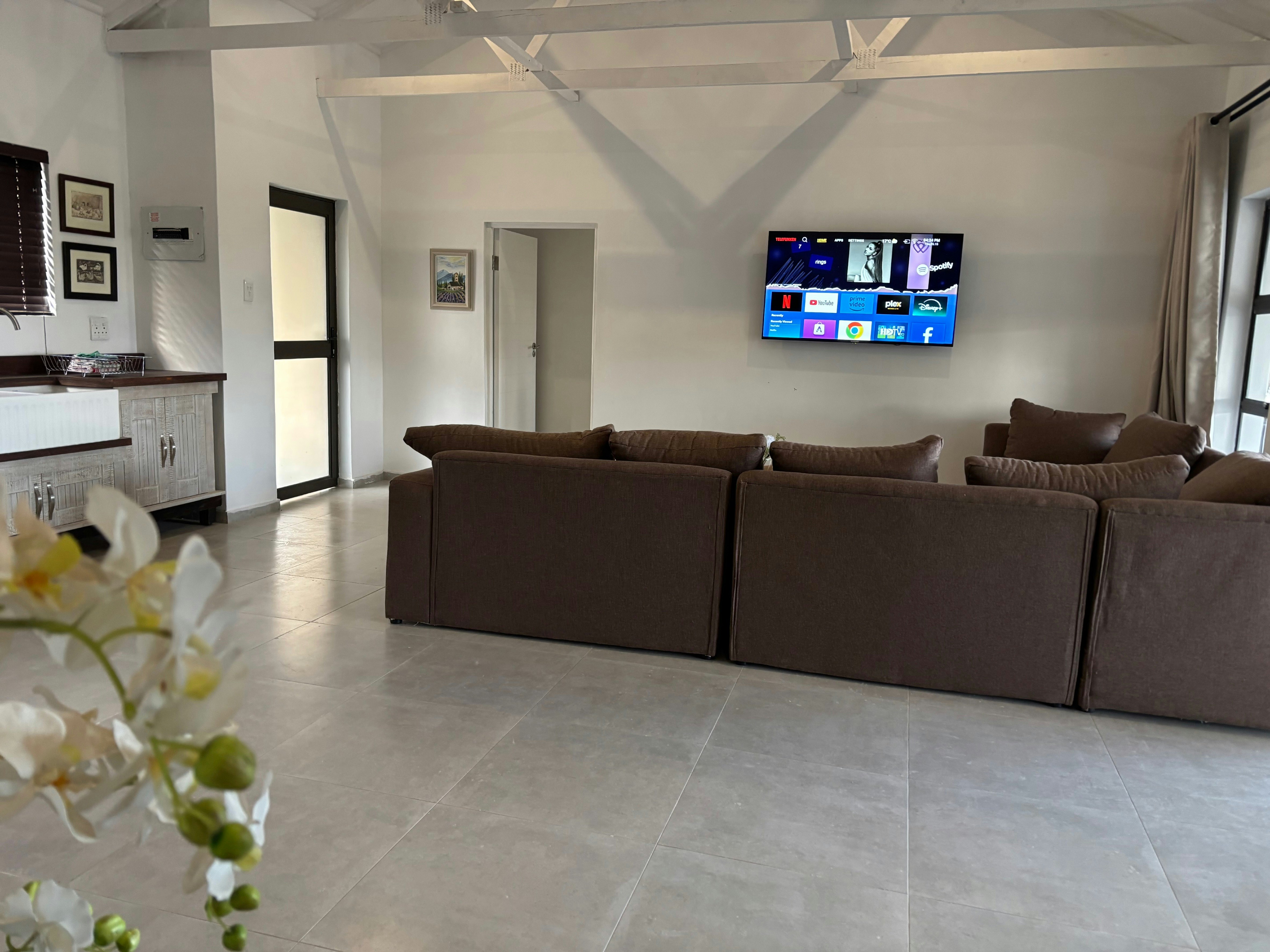 The open-plan living area features a fully equipped kitchen, including a gas stove, oven, microwave, Nespresso machine, fridge-freezer, cutlery, and crockery. The lounge area offers comfortable seating, a smart TV with Netflix and Showmax, free Wi-Fi, and breathtaking views from every angle.