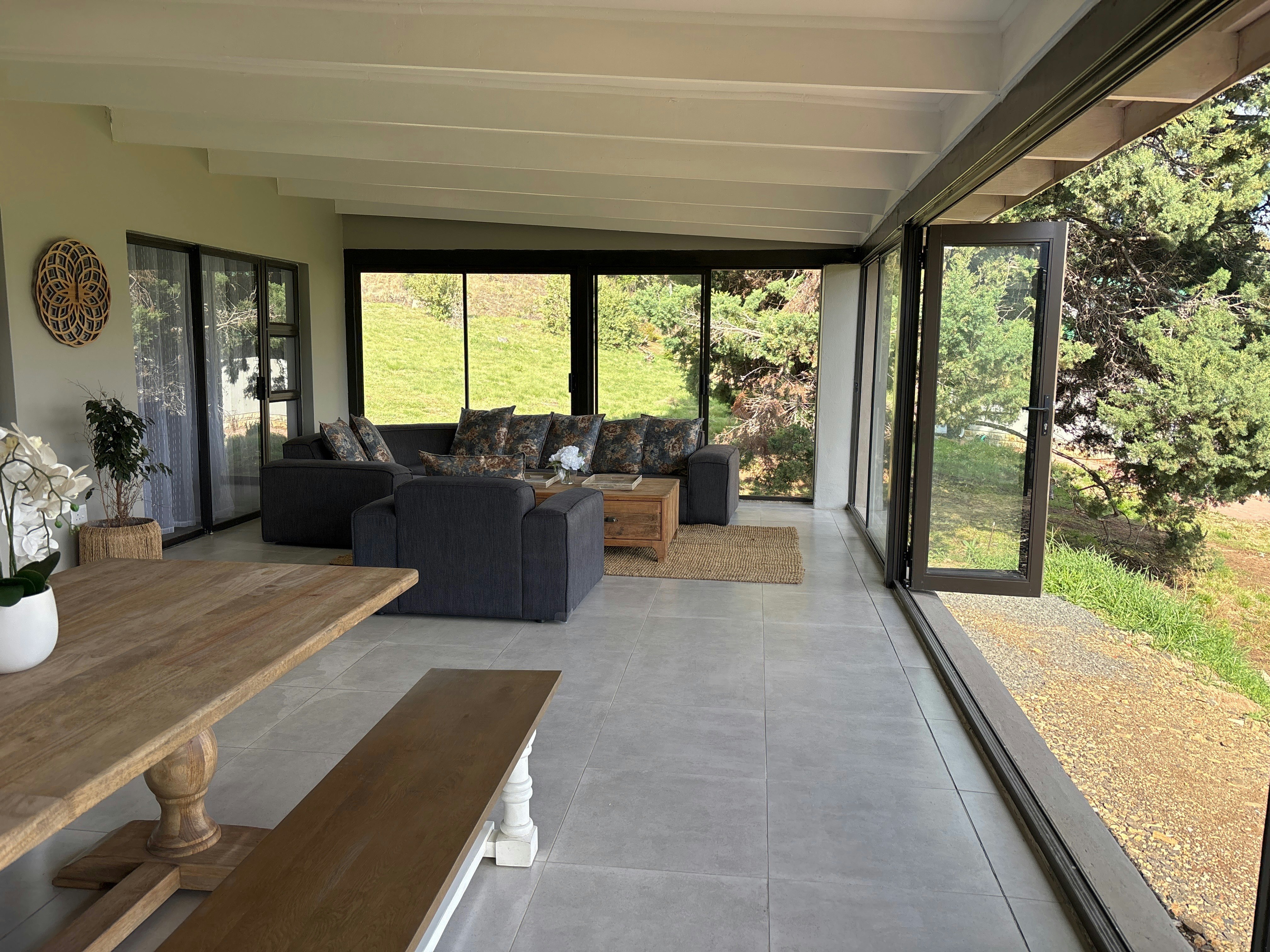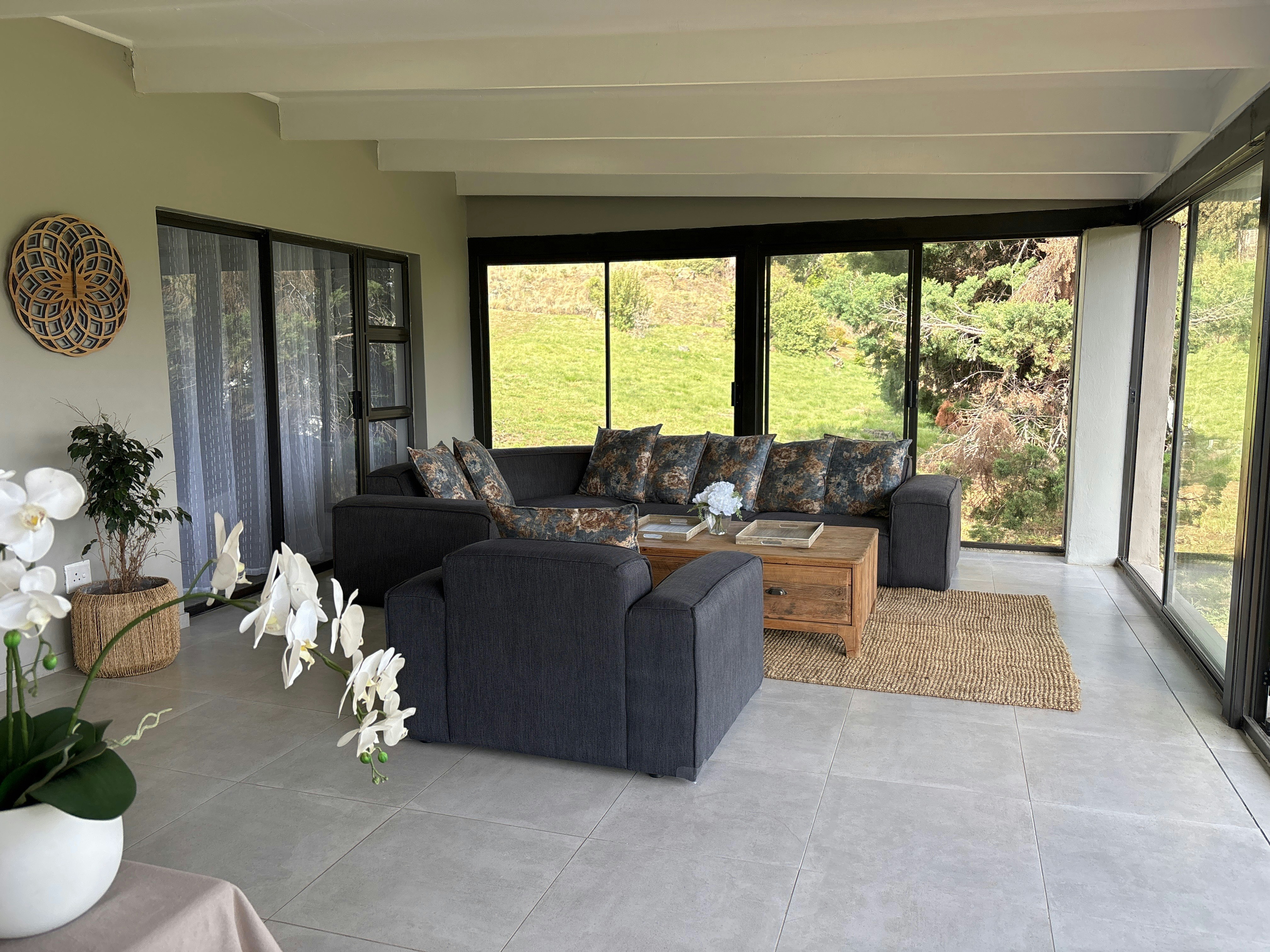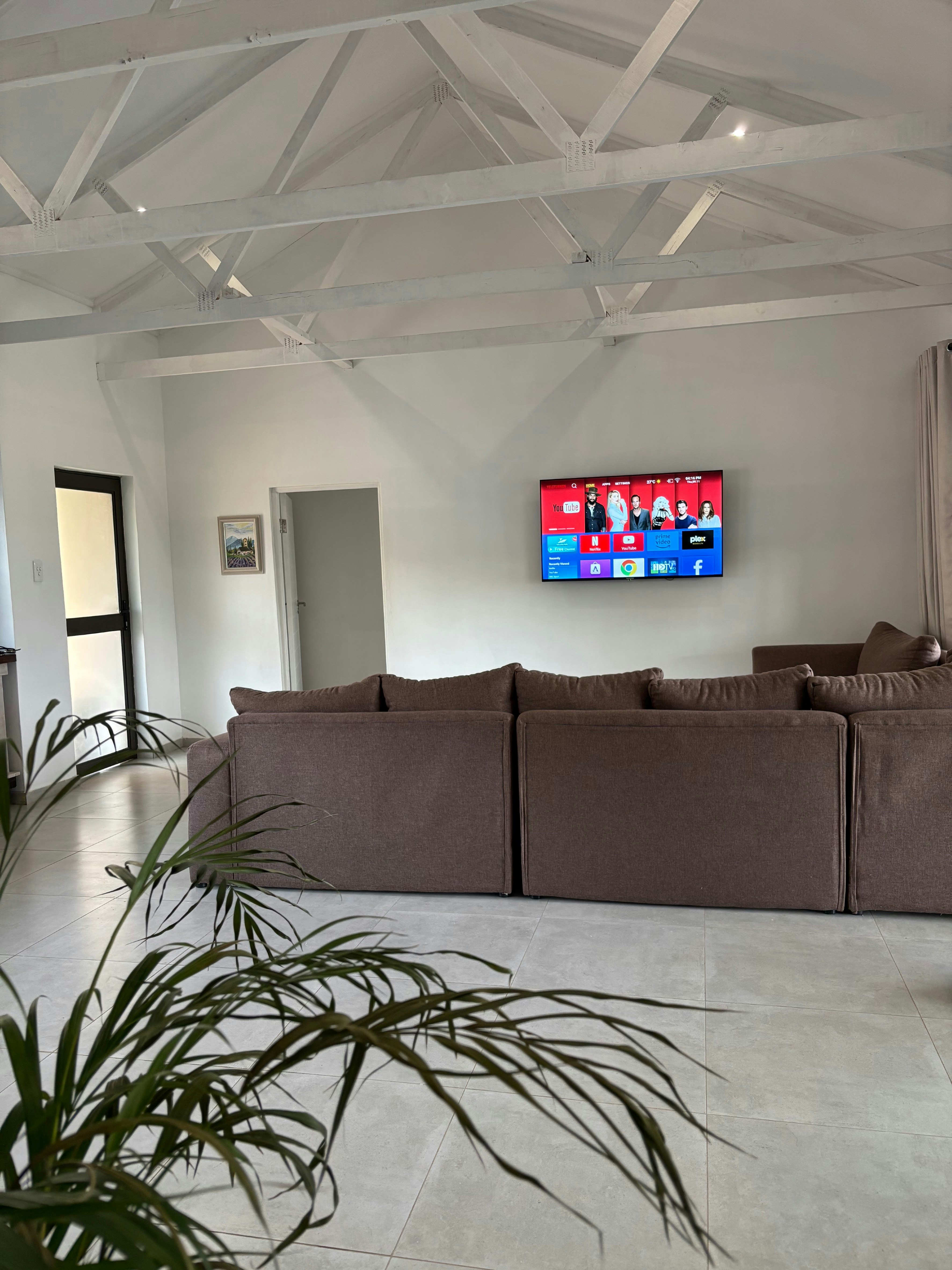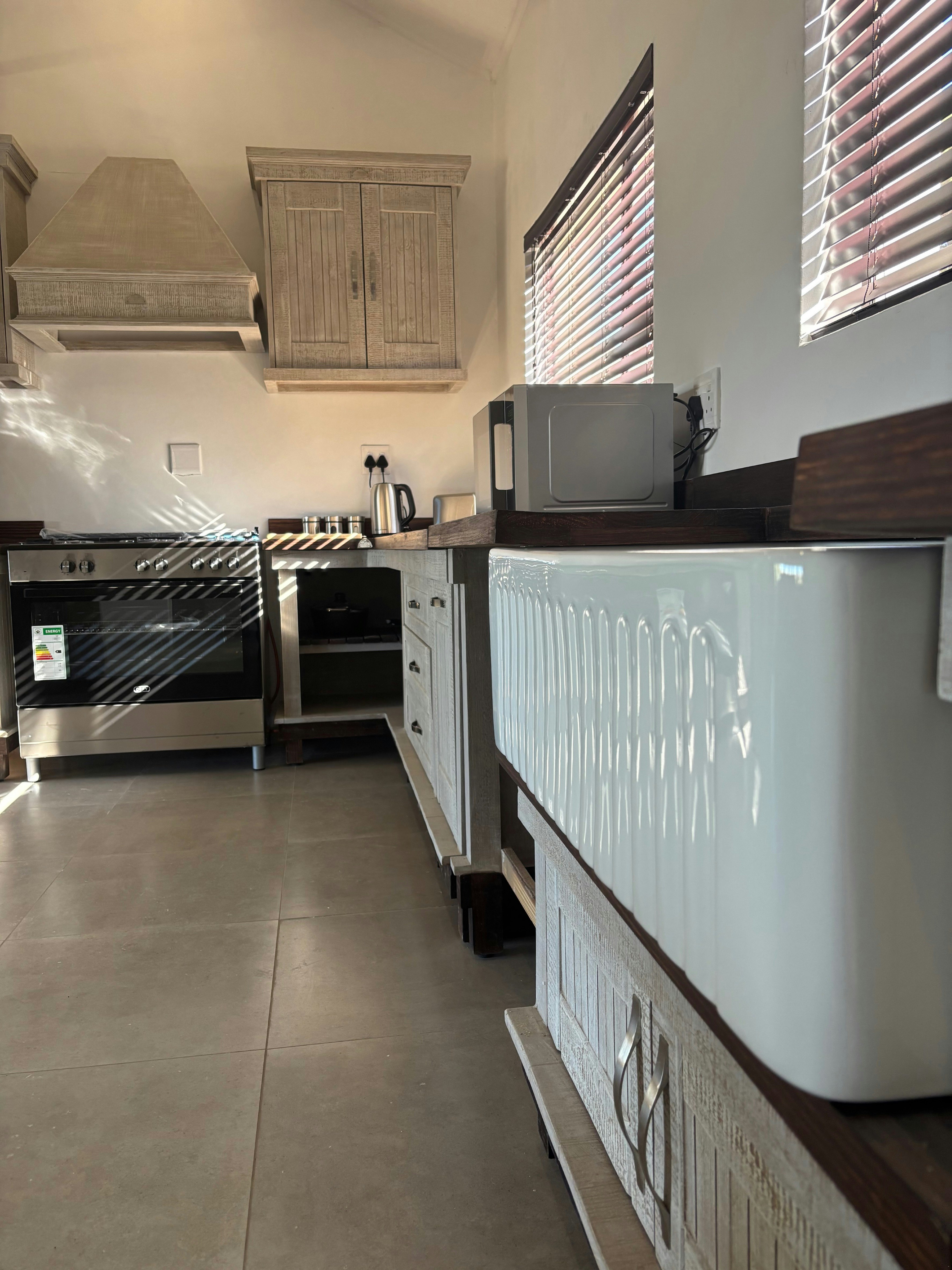 The open-plan living area features a fully equipped kitchen, including a gas stove, oven, microwave, Nespresso machine, fridge-freezer, cutlery, and crockery. The lounge area offers comfortable seating, a smart TV with Netflix and Showmax, free Wi-Fi, and breathtaking views from every angle.