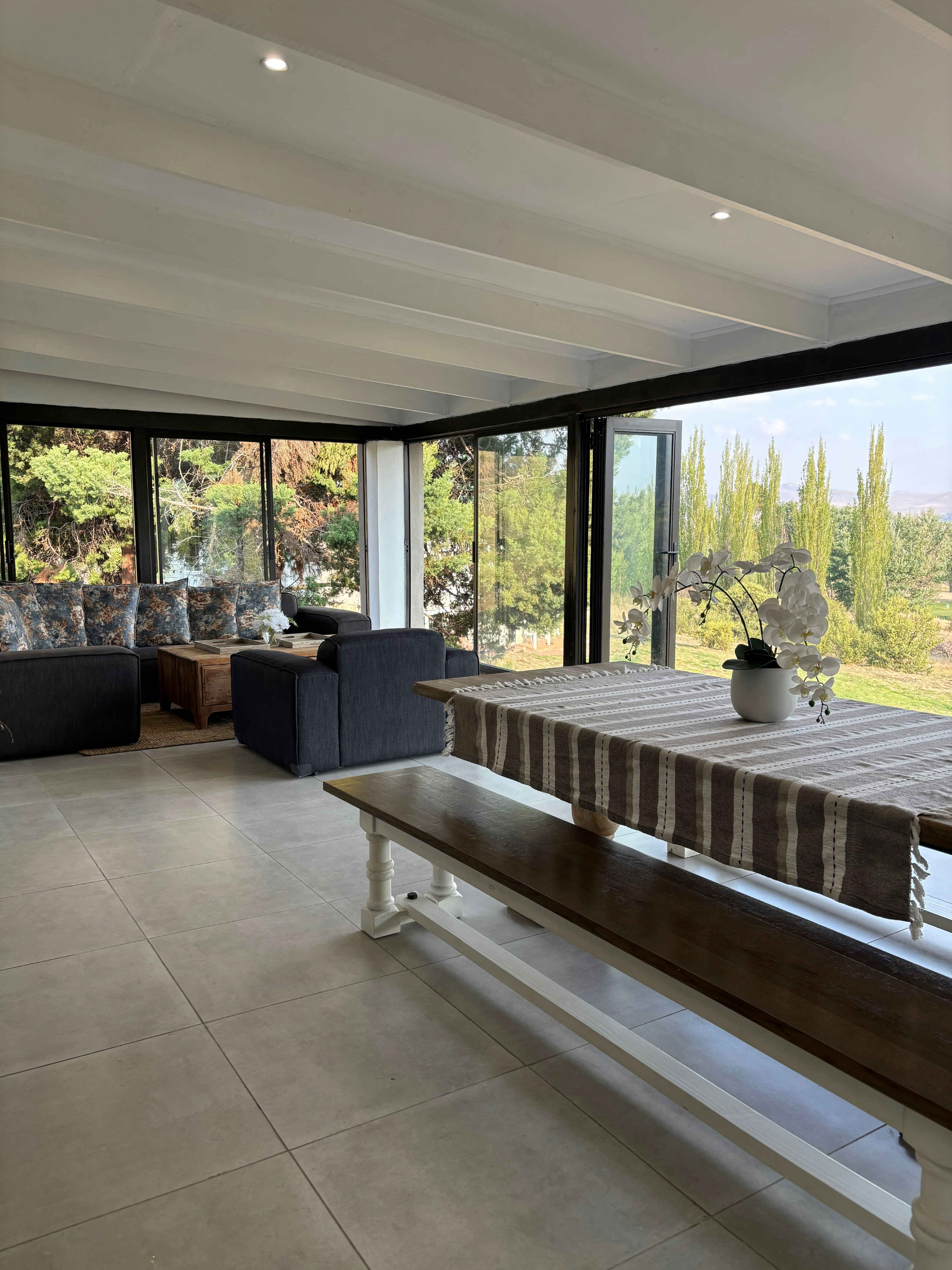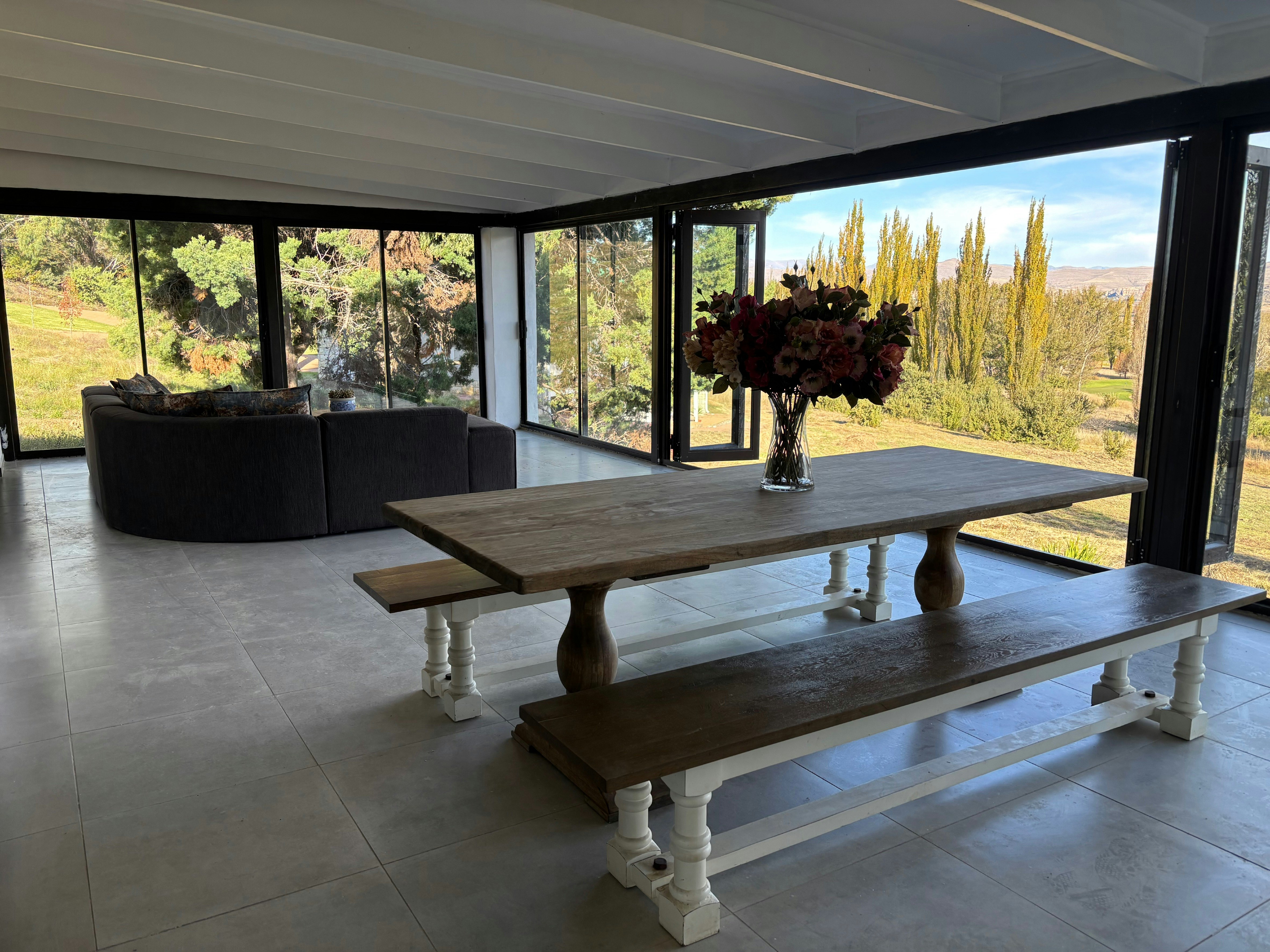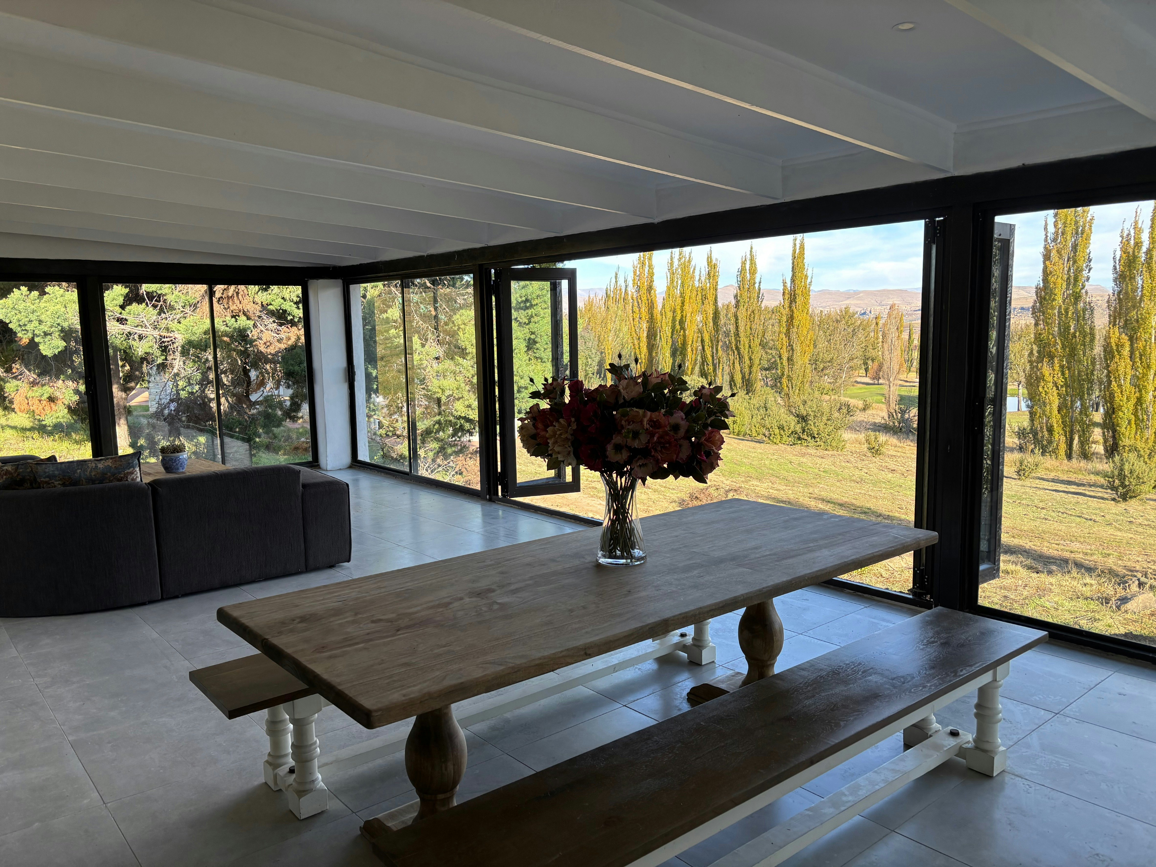Guests can relax on the spacious enclosed patio, which includes a six-seater dining table—perfect for enjoying meals while taking in the scenery.