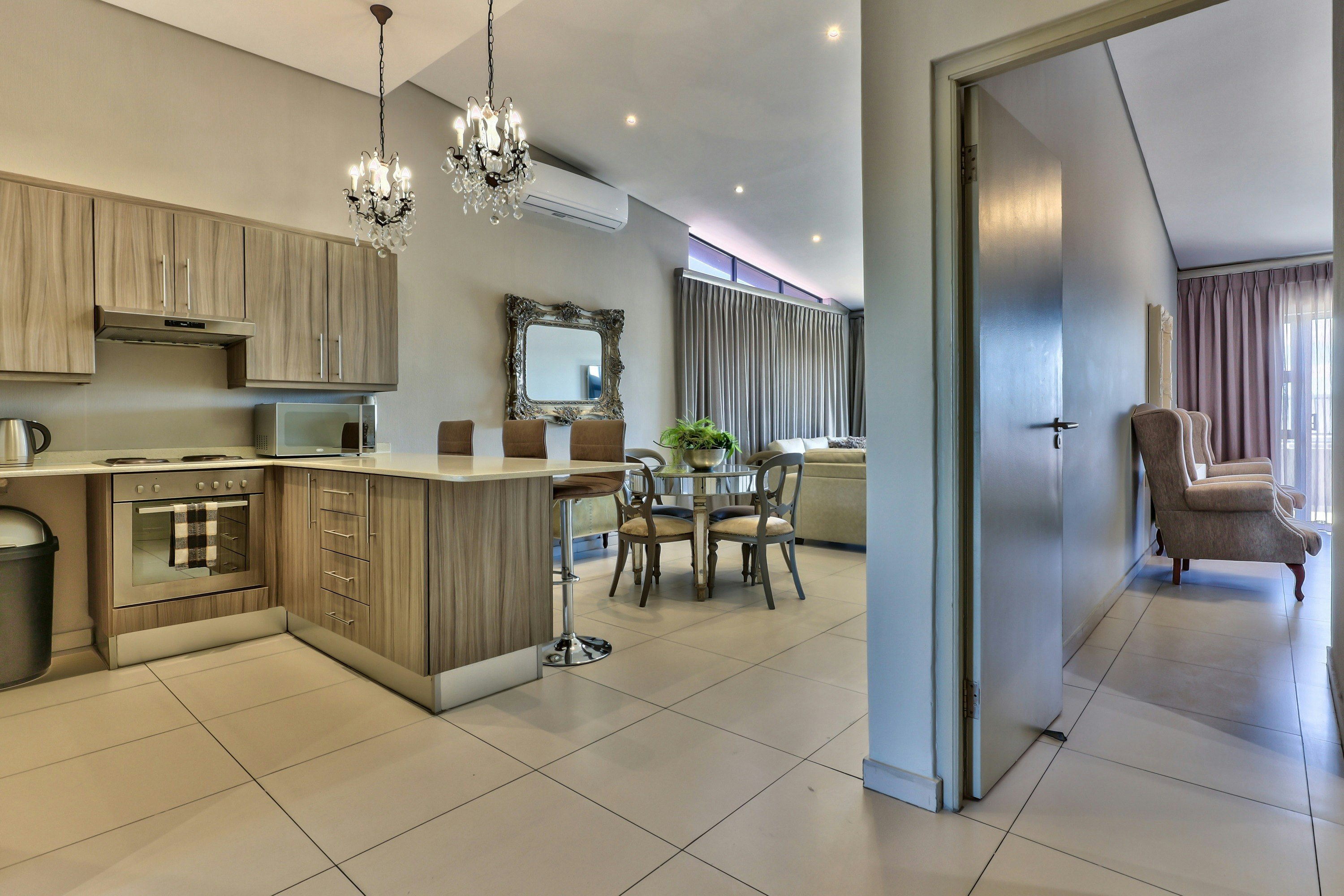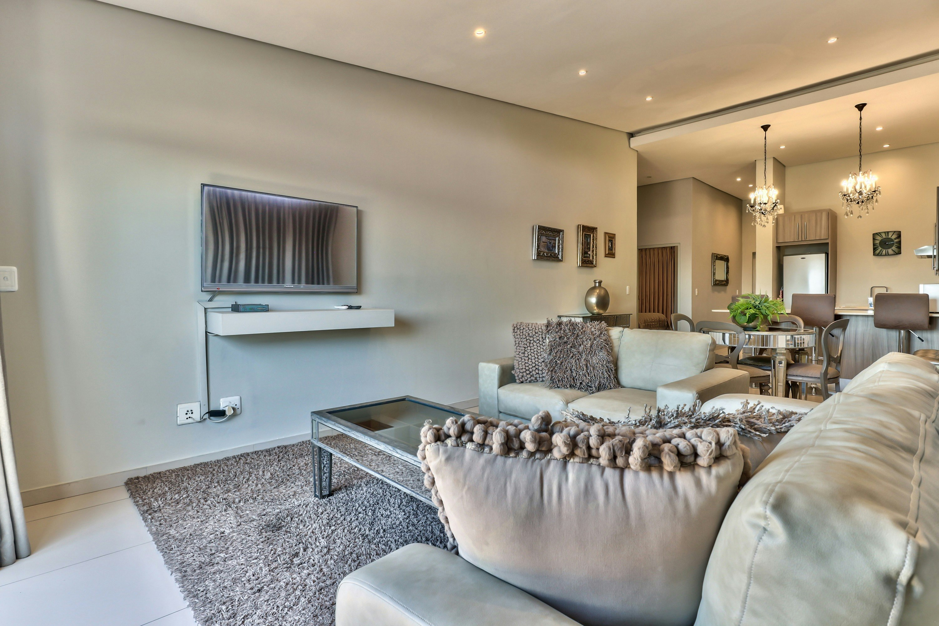 The unit features a well-equipped kitchen that includes a stove, oven, microwave, toaster, kettle, fridge-freezer, and a breakfast bar with stools. The lounge and dining area has comfortable seating for guests to dine and relax. For guests' entertainment, a flat-screen TV with selected DStv channels and access to free Wi-Fi are available.