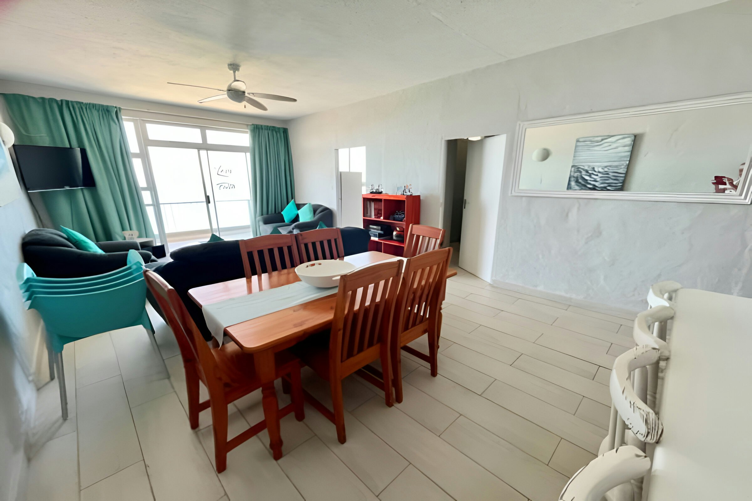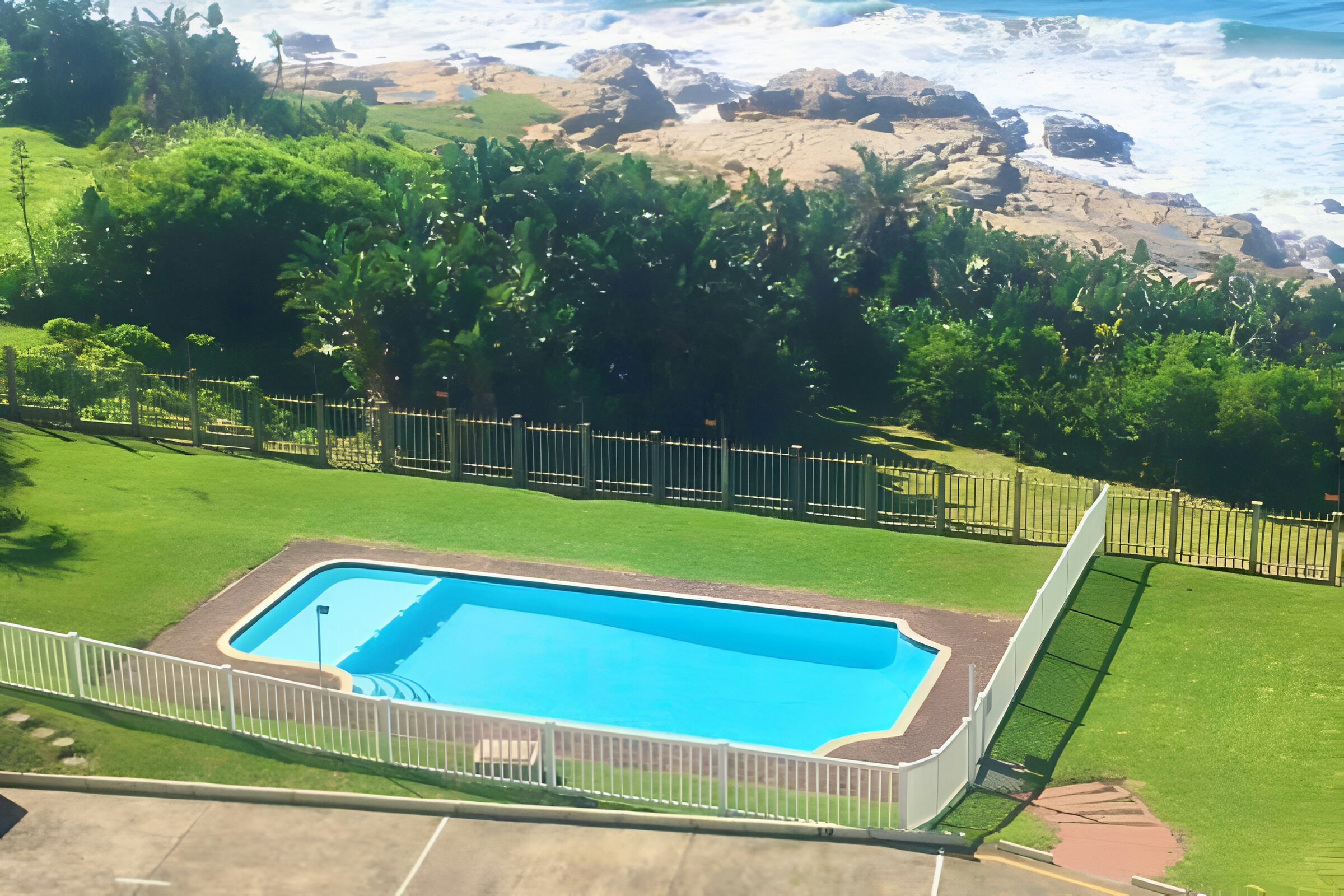 The open-plan living area features comfortable seating, a TV, a dining table, and a kitchen. The kitchen is well equipped with a fridge-freezer, stove, oven, microwave, and coffee- and tea-making facilities. Guests can admire and enjoy the ocean panoramas from the balcony. The complex offers additional amenities including a communal swimming pool and braai facilities, with allocated garage parking provided for added convenience.