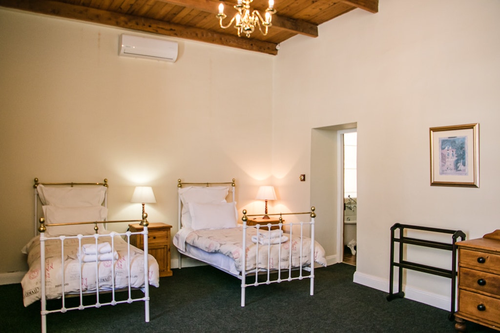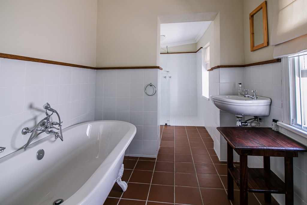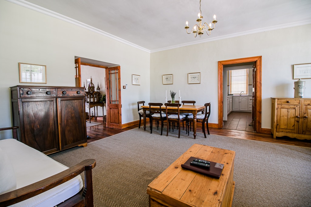 The cottage is furnished with several Cape-country antiques and prints and comprises 3 bedrooms, 3 bathrooms, a kitchen, a dining area, and a lounge. The main bedroom contains a king-size bed, while the second bedroom is furnished with a double bed. Twin single beds are available in the third bedroom, and each bedroom has an en-suite bathroom fitted with a bath, and a shower.