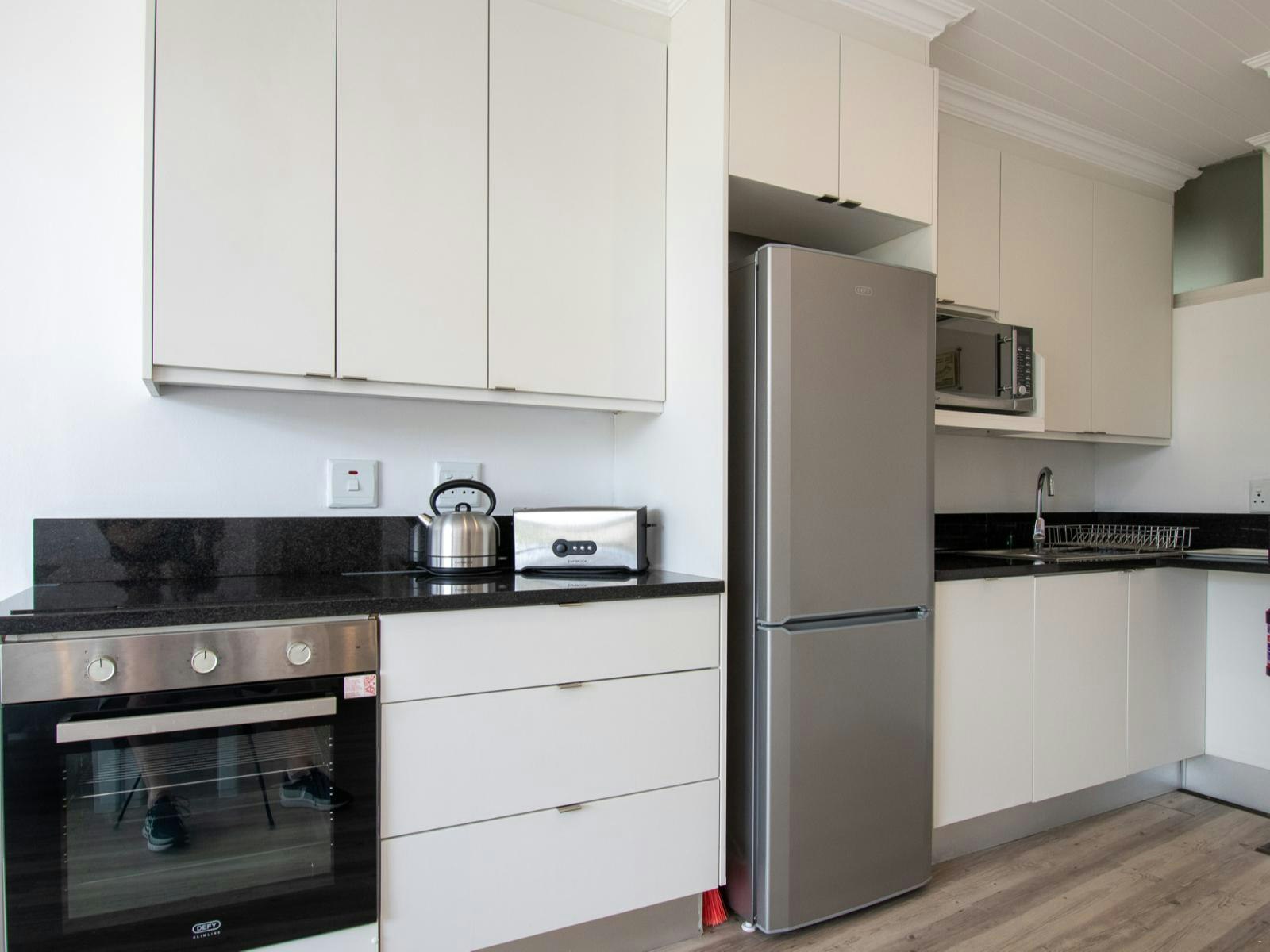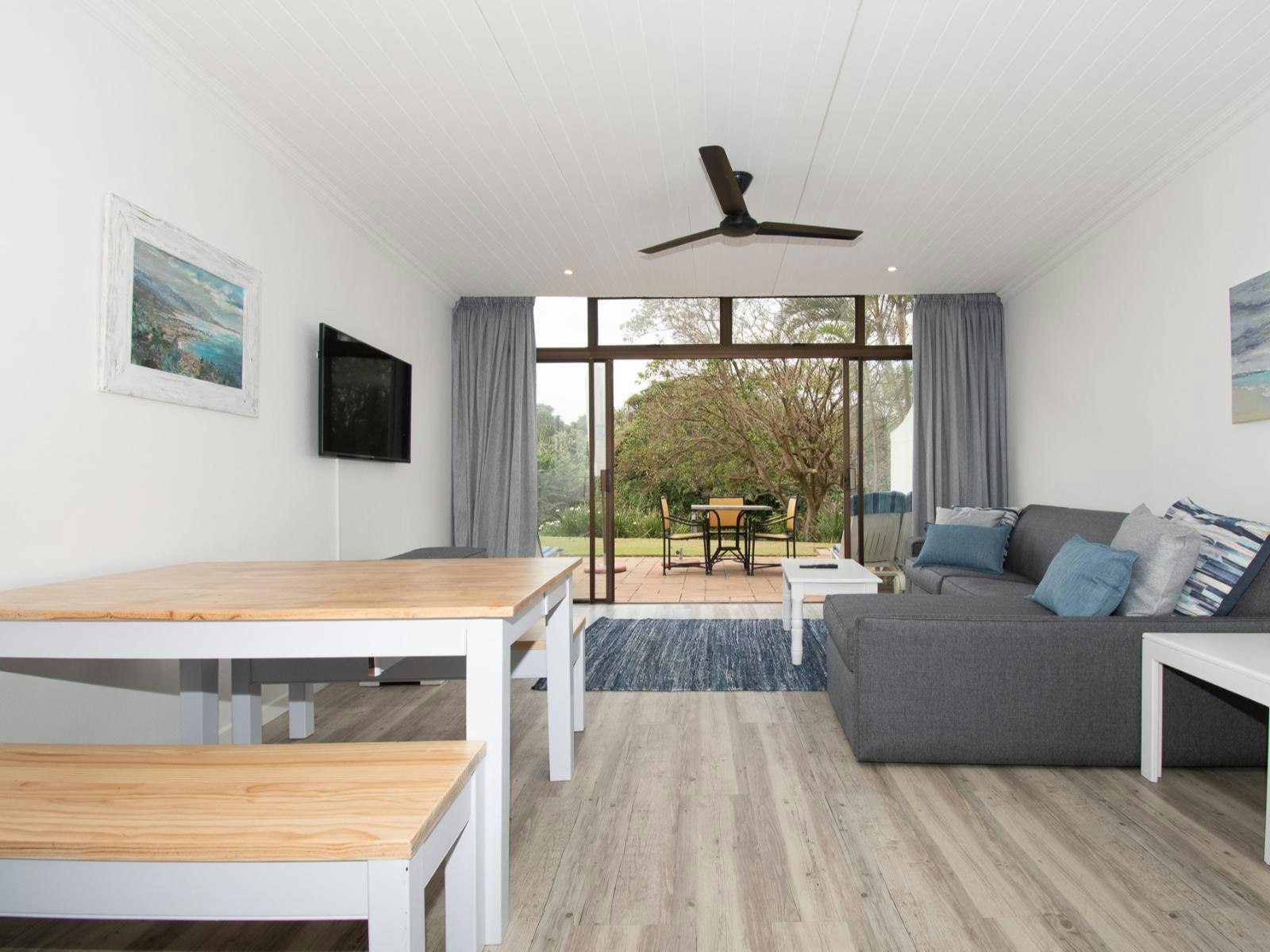 The open-plan living area features a kitchen fully equipped with a stove, oven, microwave, fridge-freezer, cutlery and crockery. Leading from the kitchen is a dining table where guests can enjoy their meals together. The lounge has comfy seating and a TV with DStv.