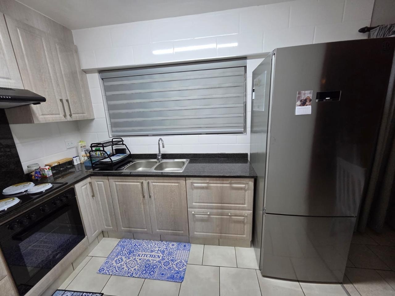 The kitchen is well-equipped for self-catering with a stove and oven, fridge-freezer, kettle, microwave and toaster. The dining area contains a 6-seater dining table and chairs. The lounge contains a flat-screen Smart TV with a selection of DStv channels.