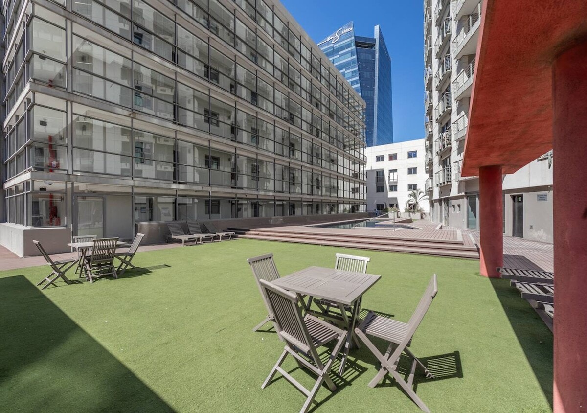 The living area opens onto a quaint balcony with outdoor seating. Guests have full access to the building amenities, including the gym and swimming pool. Secure parking is available for those with a vehicle.