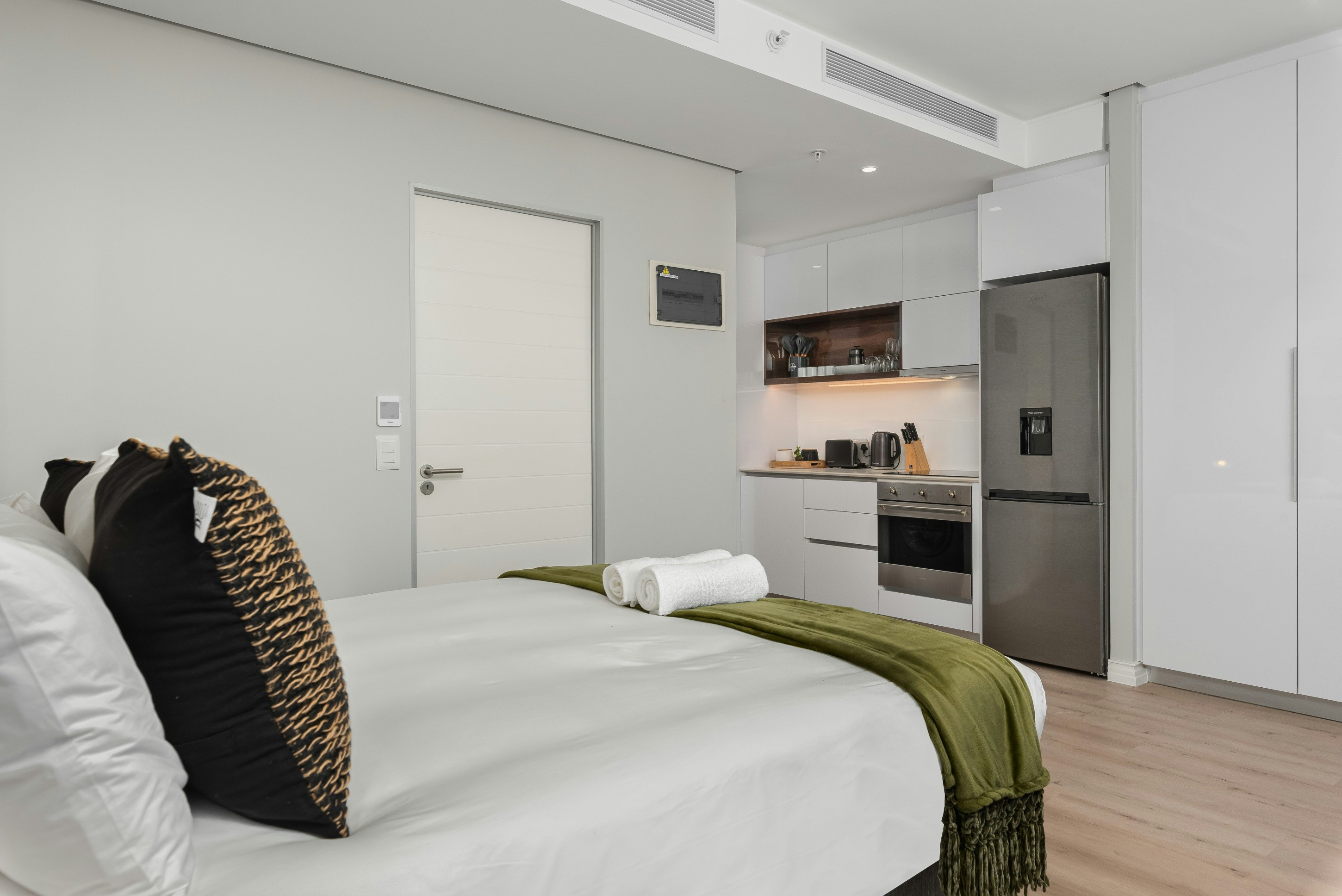 This studio apartment can accommodate up to 2 guests and features an open-plan layout. The bedroom area is furnished with a queen-size bed. The bathroom is fitted with a shower, washbasin, and toilet. Quality linen and bath towels are provided; however, guests are required to bring their own swimming towels.