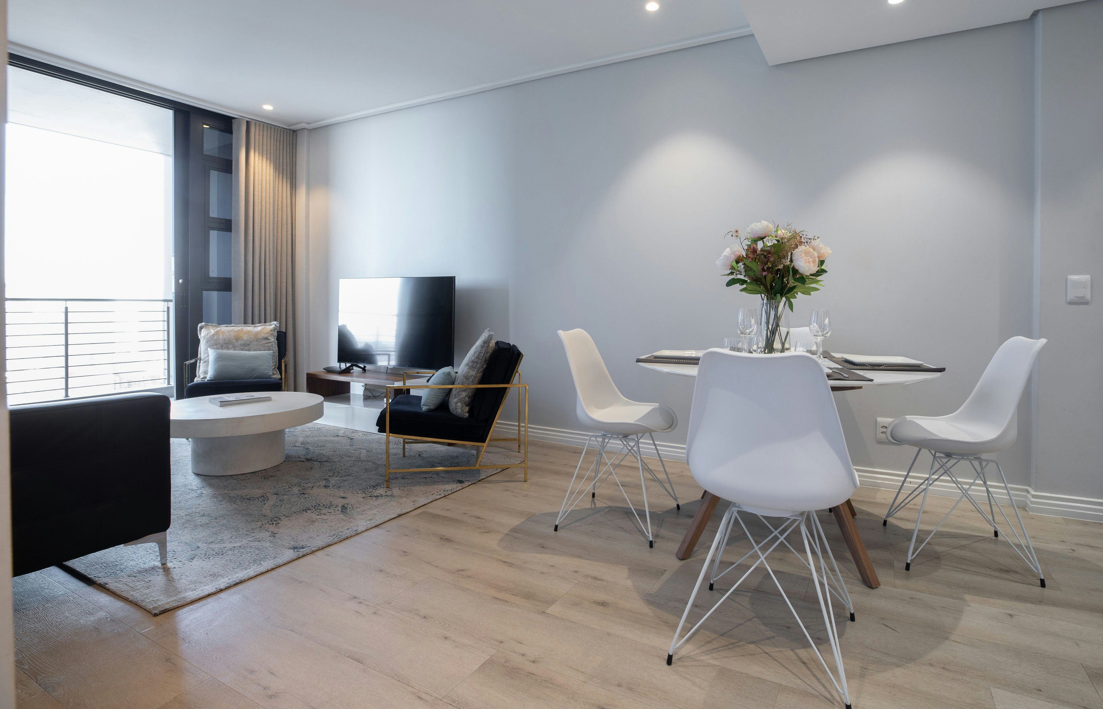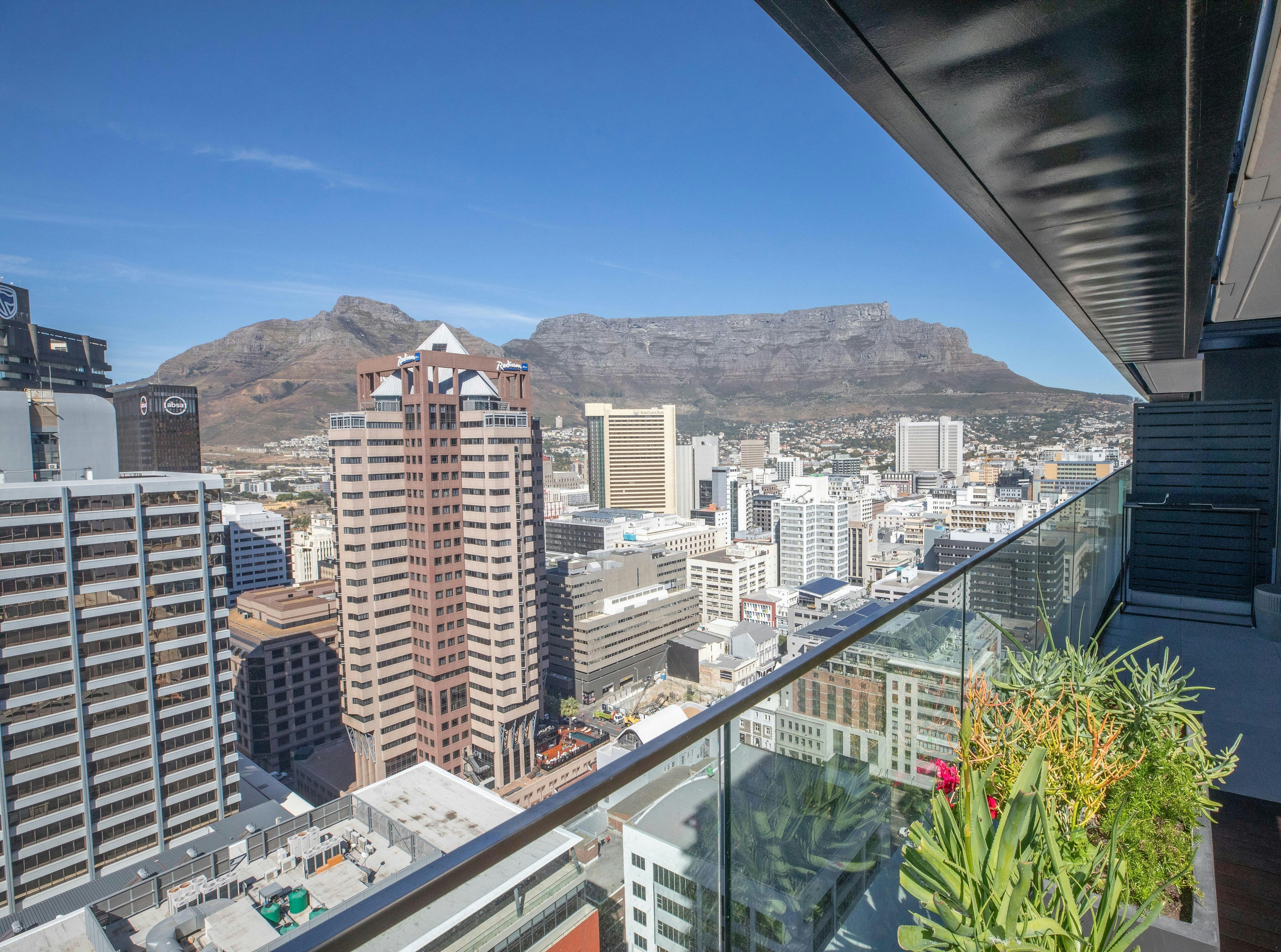 The living area opens onto a quaint balcony. Guests have access to top-class amenities, including Cape Town’s highest rooftop pool, an outdoor gym, and a private bar on the twenty-seventh floor. Additional features include valet parking, electric car charging, and secure bicycle storage.