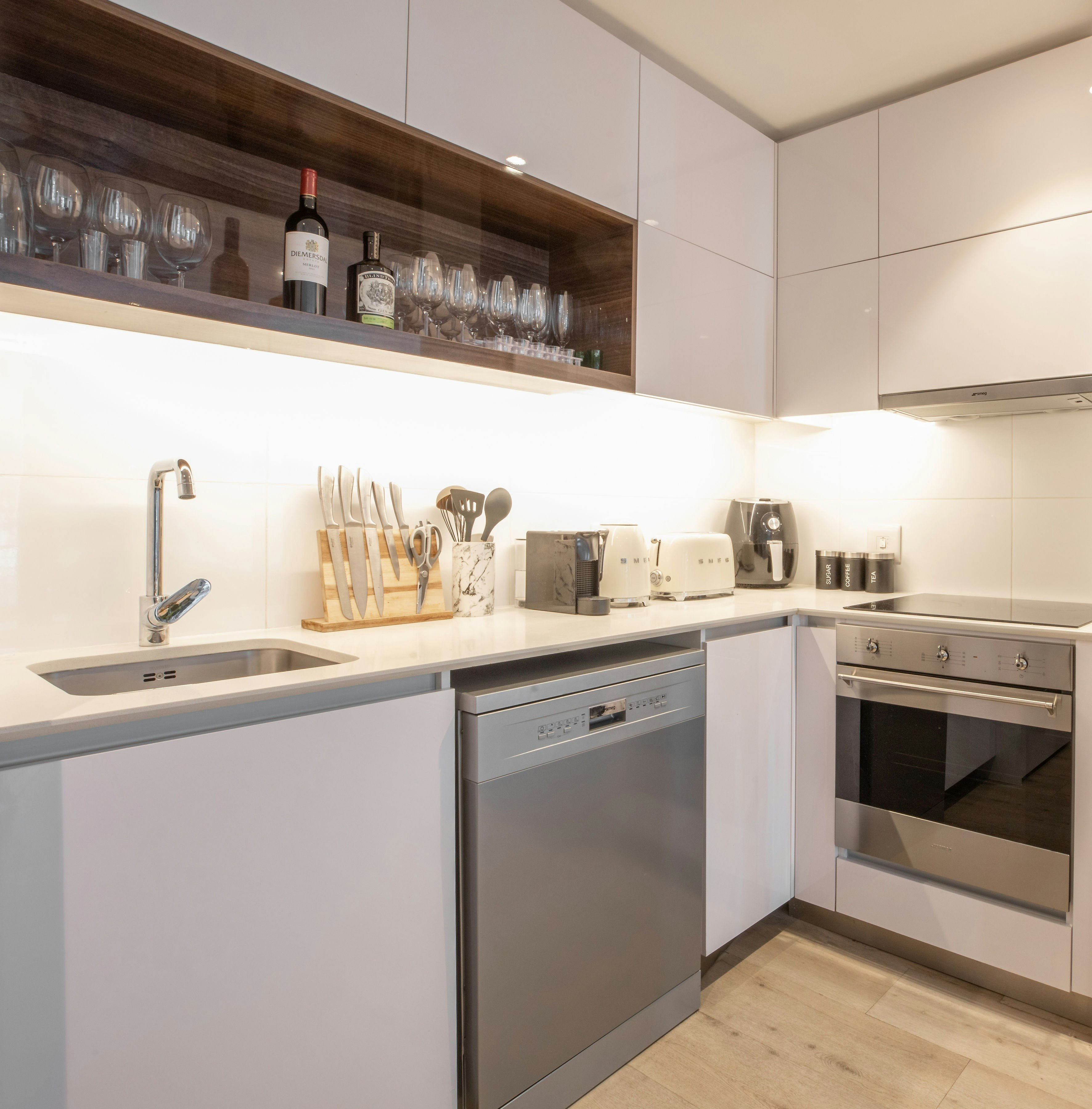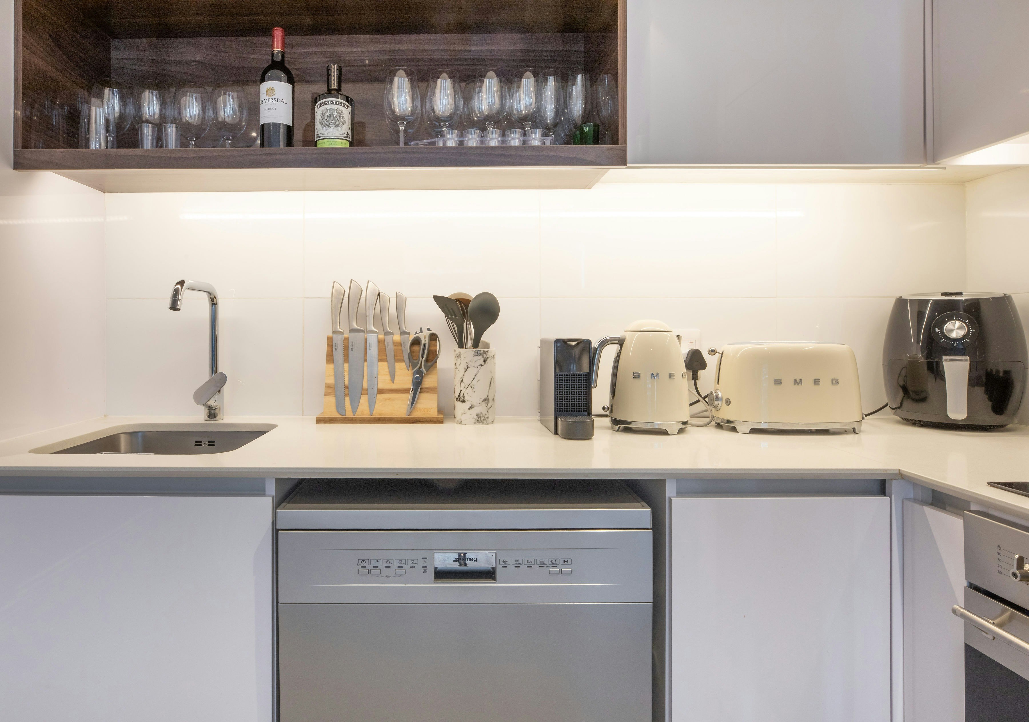 The unit features a fully equipped kitchen including a stove, oven, microwave, kettle, air fryer, toaster, coffee machine, fridge-freezer, and dishwasher. The lounge and dining area offers comfortable seating for guests to dine and relax. For entertainment, a smart TV with DStv channels and free Wi-Fi are available.