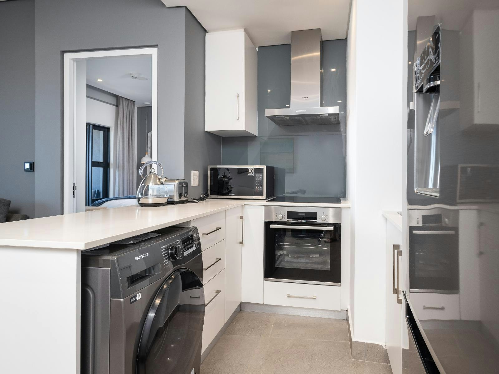 The kitchen is well-equipped with a fridge-freezer, microwave, oven, stove, washing machine, and tea- and coffee-making facilities. The open-plan living area features a TV with DStv, comfortable seating, and a sliding door leading to the balcony with outdoor seating.