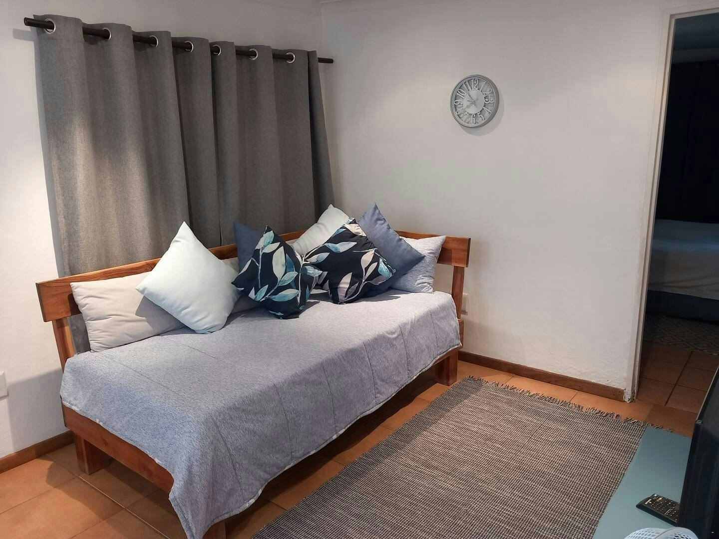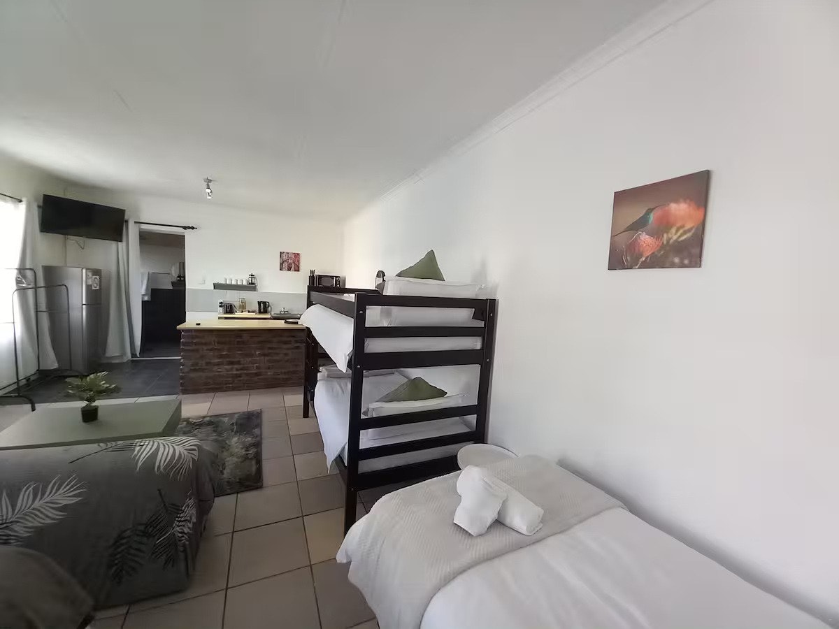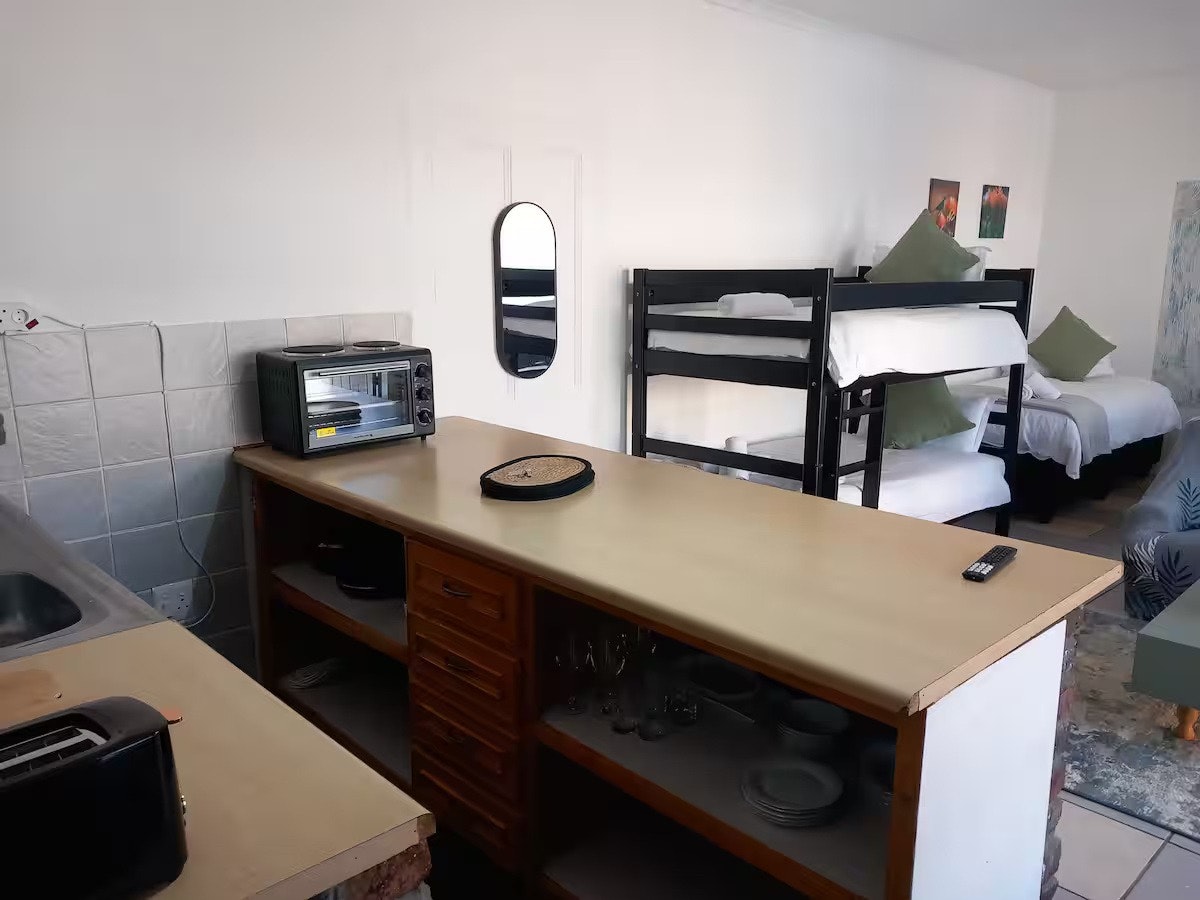 Accommodation is offered in 2 self-catering apartments, accommodating between 3 and 5 guests. Each apartment has a private entrance, comfortable beds, and a private bathroom, with linen and bath towels provided. Each unit features a well-equipped kitchen and lounging area, a smart TV with streaming channels, and access to free Wi-Fi. There is also a private outdoor area with seating and braai facilities, as well as secure parking.