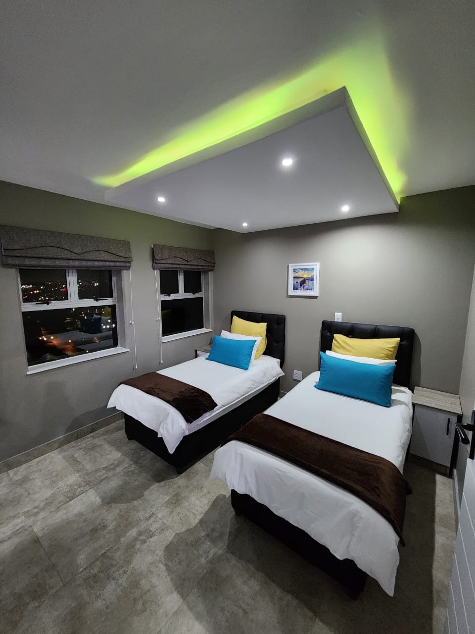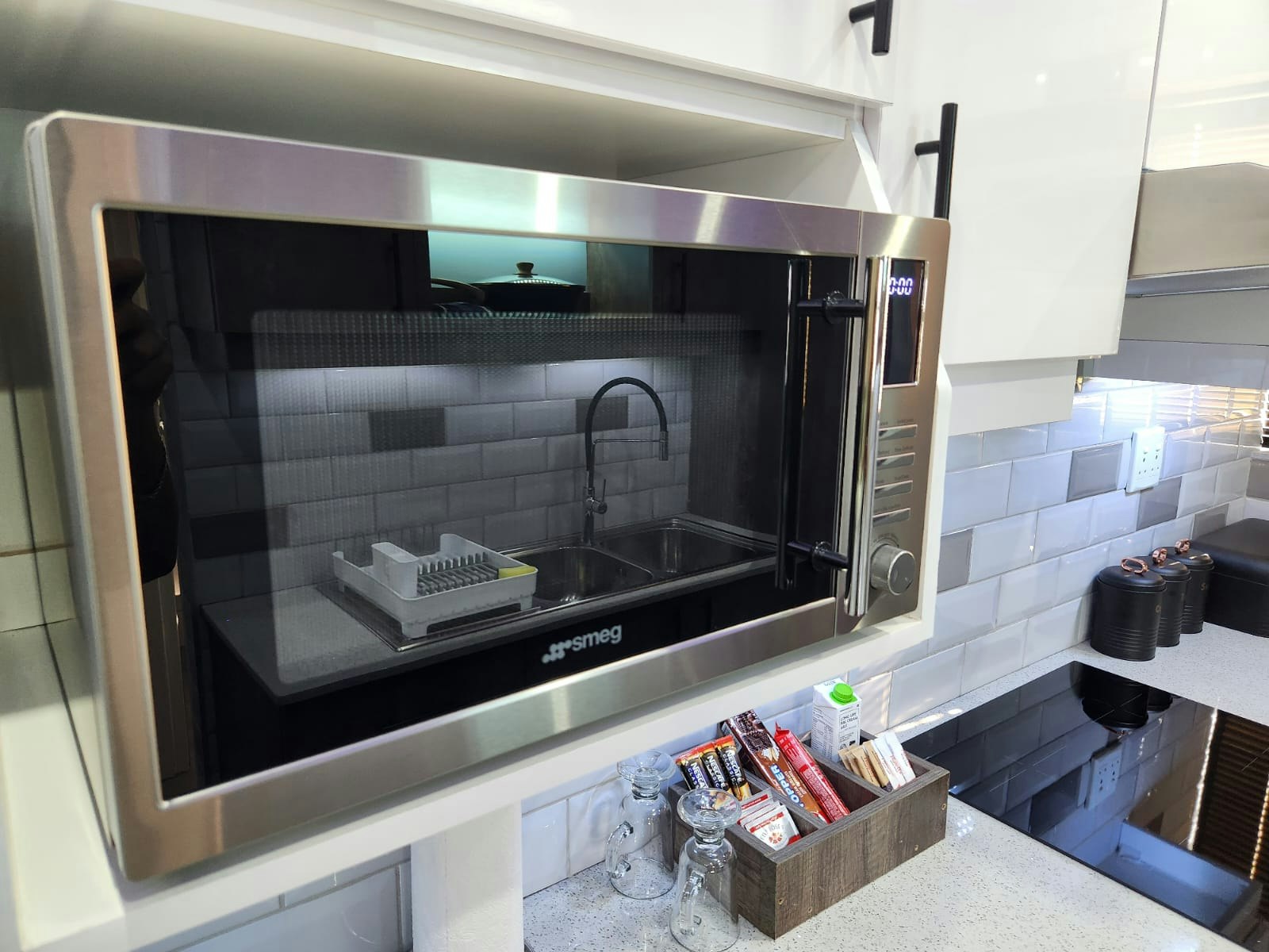 The open-plan kitchen is equipped with a fridge-freezer, stove, oven, toaster, microwave, basic cutlery and crockery, as well as tea- and coffee-making facilities. There’s a small dining table with chairs where guests can enjoy their meals together and the living area is furnished with a couch and a flat-screen TV installed with streaming services such as Netflix, Showmax, Disney+ and Amazon Prime Video. Free Wi-Fi is also available. Guests are afforded secure parking on the premises.