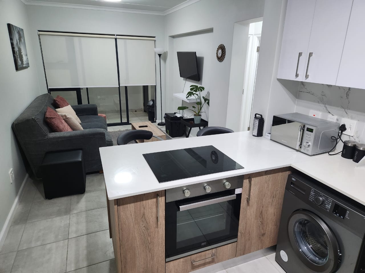 The kitchen is equipped with a fridge-freezer, stove, oven, microwave, and washing machine. A comfy couch and a TV are available in the living area, which opens onto a private balcony.