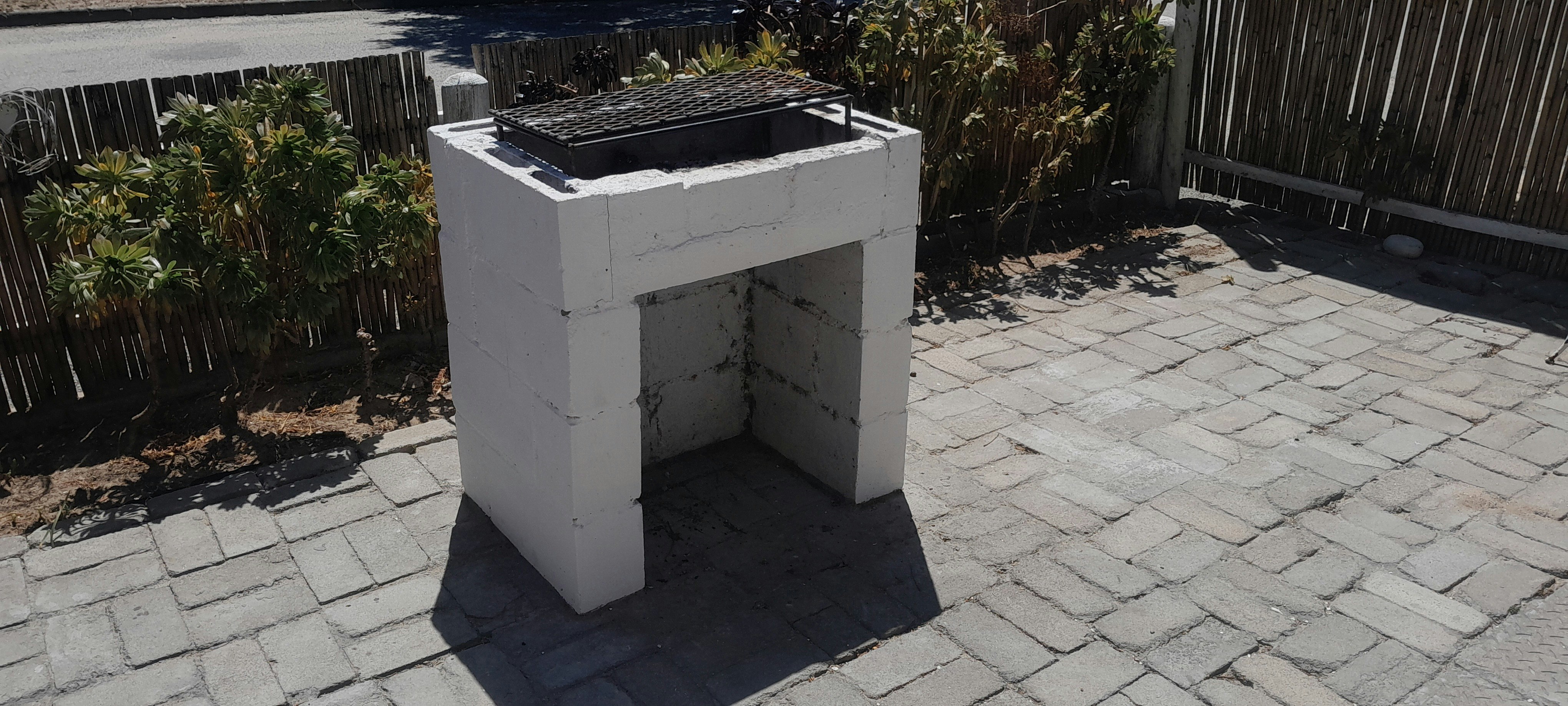 Die buite-area het 'n braai, 'n bankie, 'n tafel en 2 stoele op die klein patio. Daar is 'n sambreel wat onder die dagbed gebêre word.