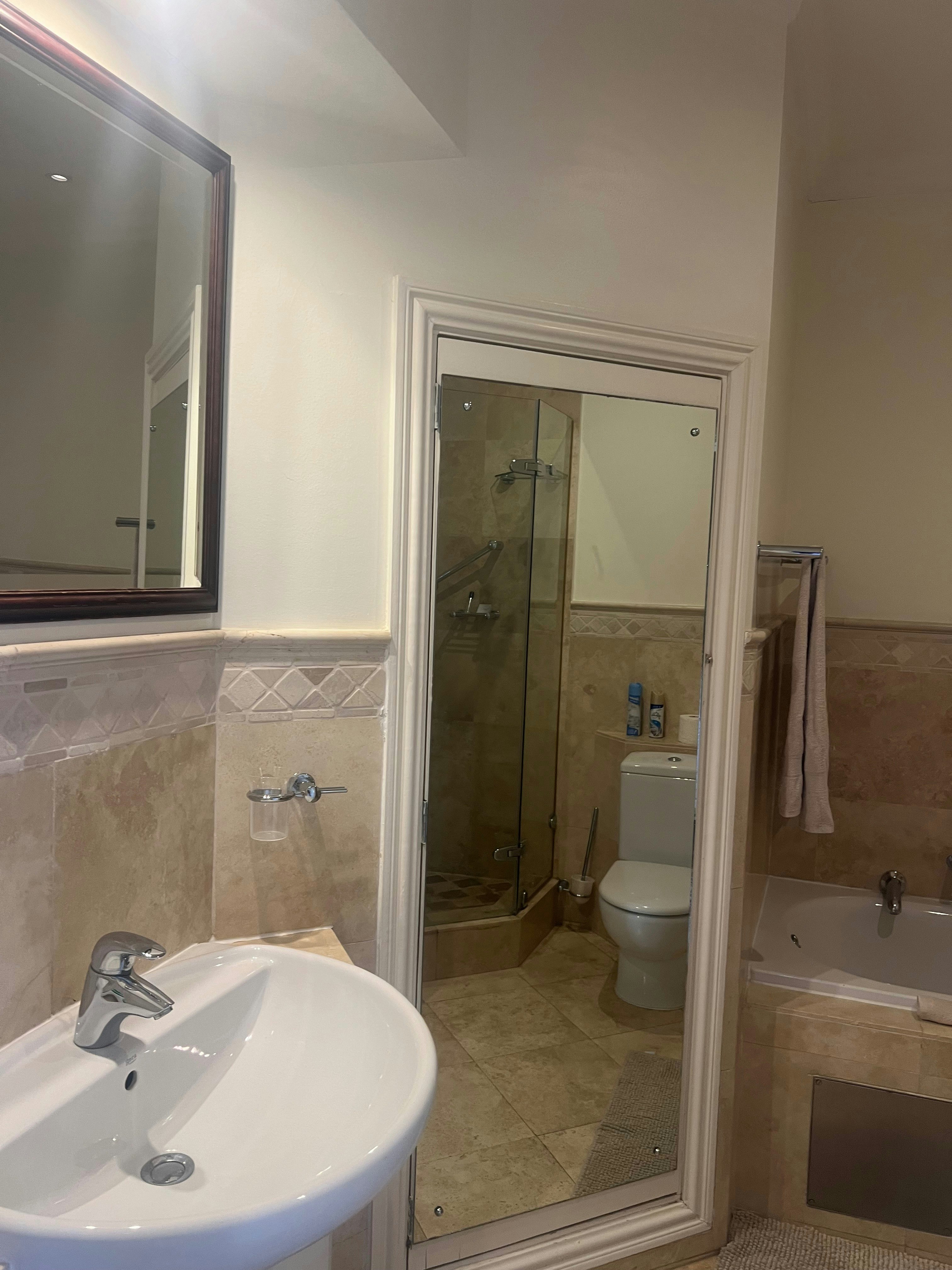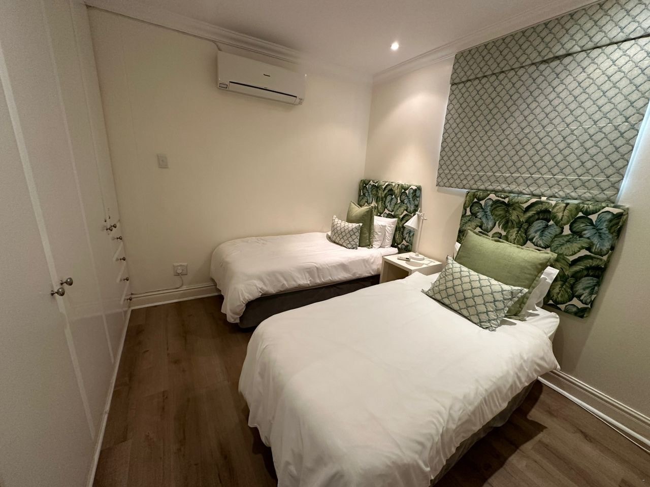 This apartment can accommodate 4 guests and comprises 2 bedrooms and 2 bathrooms. The main bedroom is furnished with a queen-sized bed and has an en-suite bathroom fitted with a washbasin, toilet, and shower over the bath. The second bedroom contains 2 single beds and makes use of the bathroom fitted with a shower, bath, washbasin, and toilet.