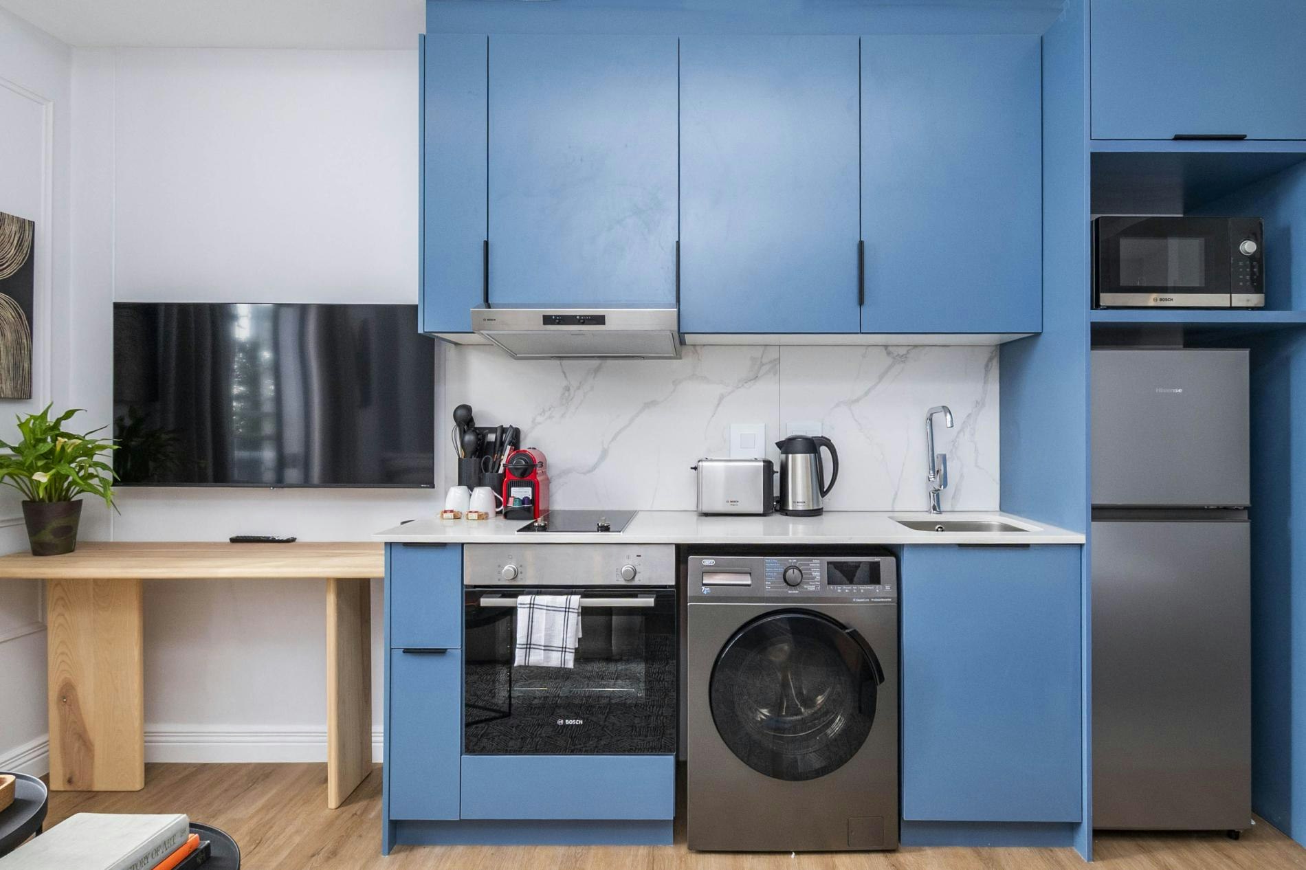 The living area features an open-plan design with a fully equipped kitchen, including a stove, oven, microwave, Nespresso machine, fridge-freezer, cutlery, and crockery. For added convenience, a washing machine is also available. The lounge area is furnished with comfortable seating and a smart TV with YouTube and Netflix, along with free Wi-Fi.