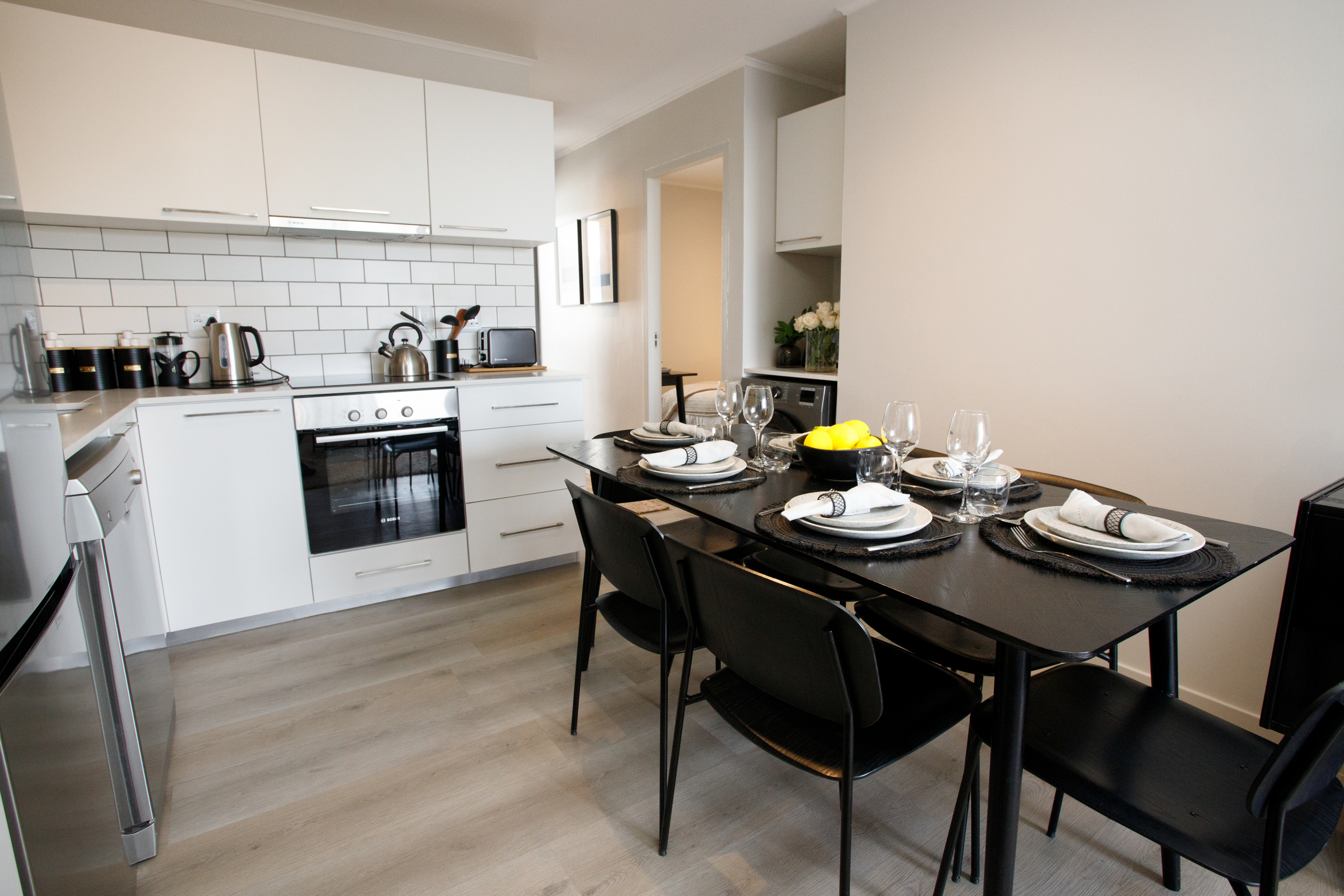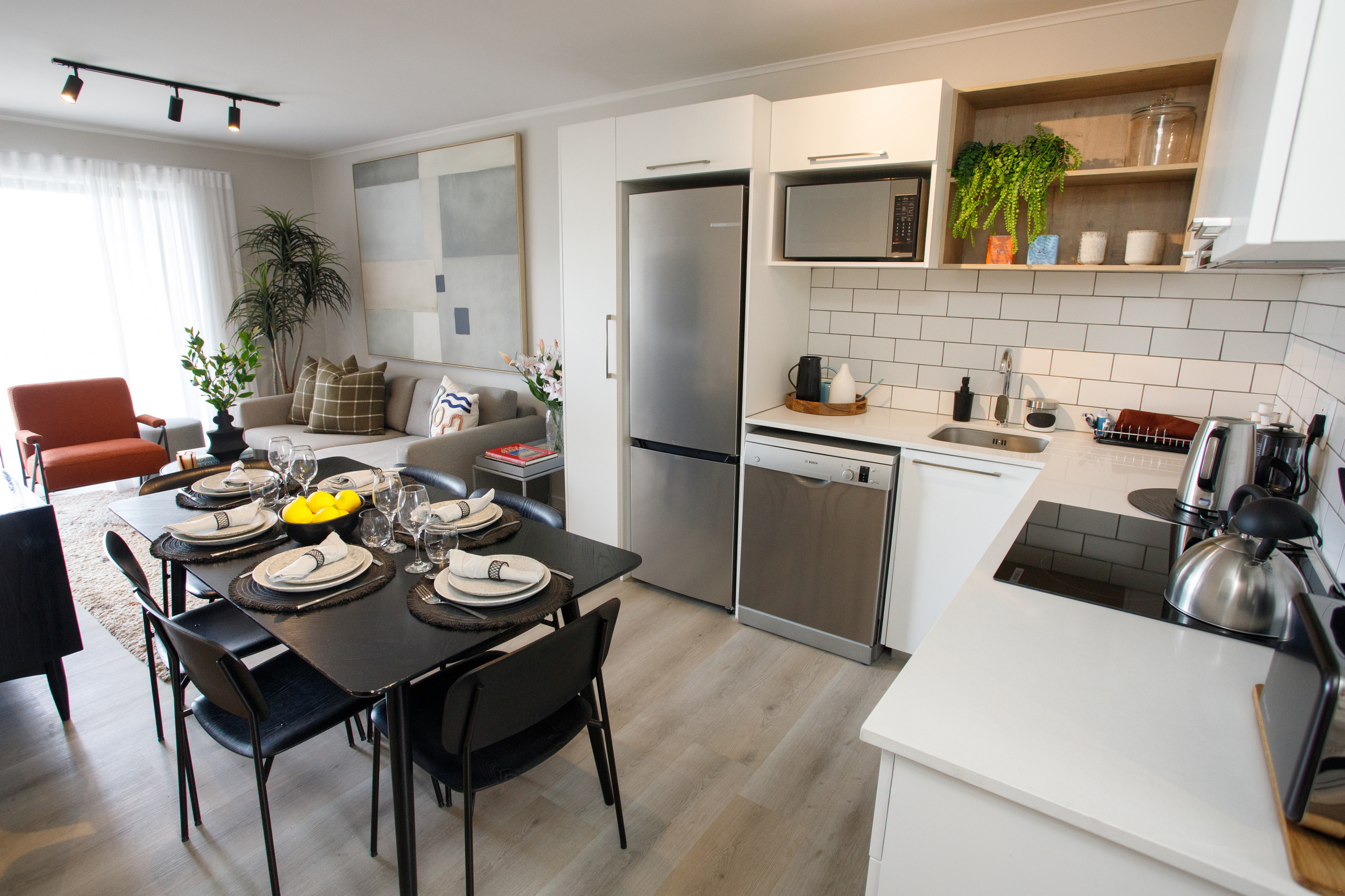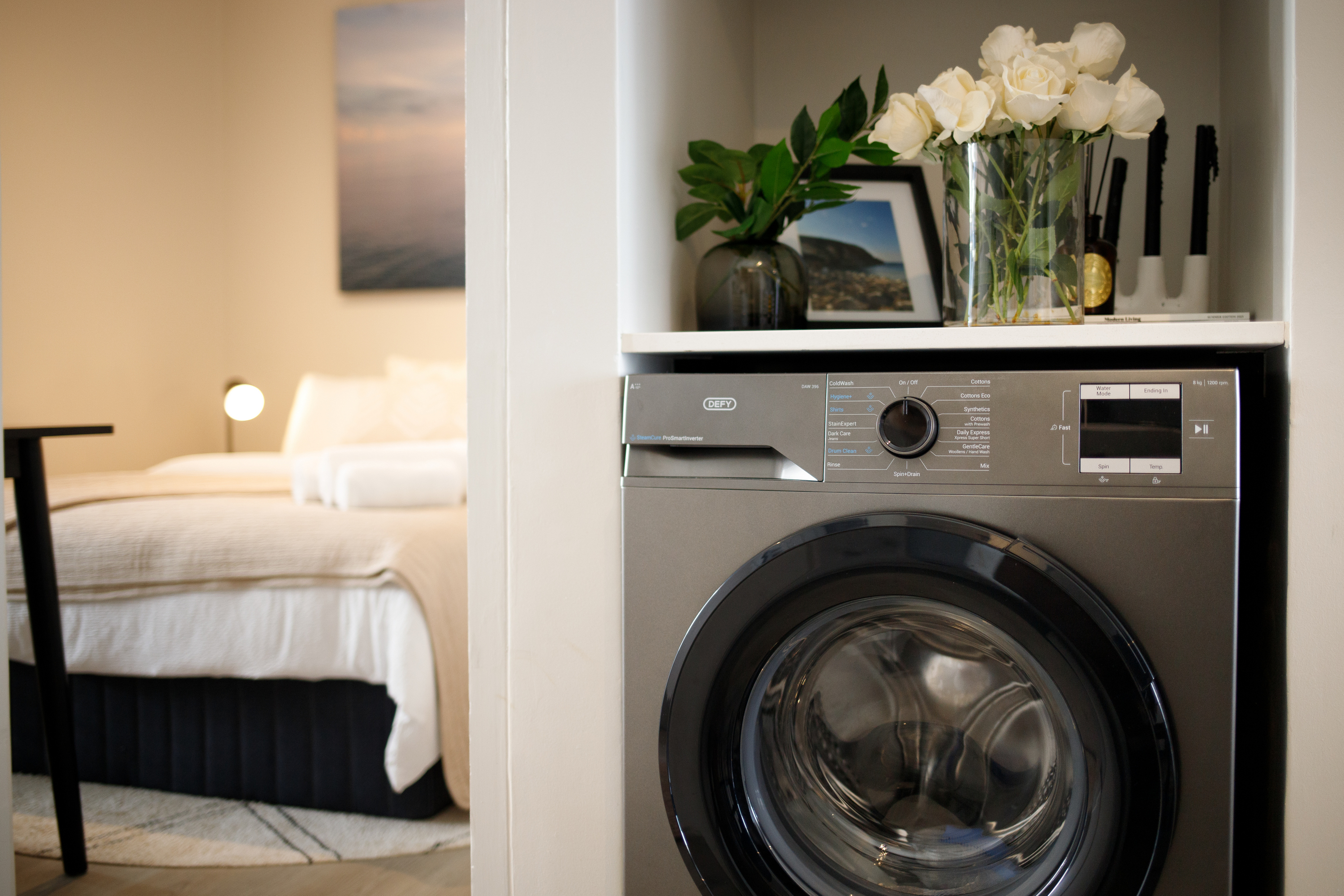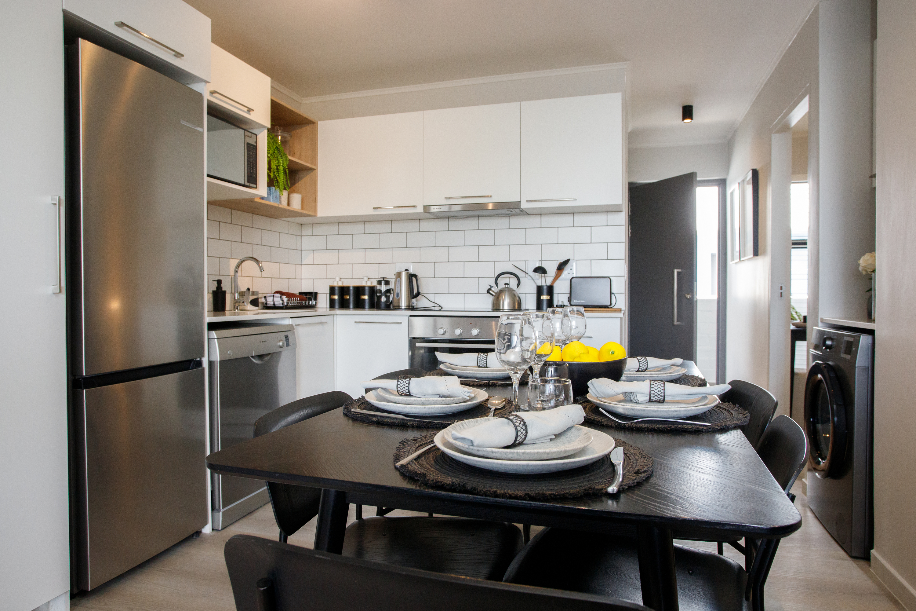 Die eenheid beskik oor 'n volledig toegeruste kombuis, insluitend 'n stoof, oond, mikrogolfoond, ketel, broodrooster, yskas-vrieskas, skottelgoedwasser en wasmasjien. Die sitkamer en eetarea bied gemaklike sitplek waar gaste kan eet en ontspan. Vir vermaak is 'n slim-TV met stromingsdienste en gratis WiFi beskikbaar.