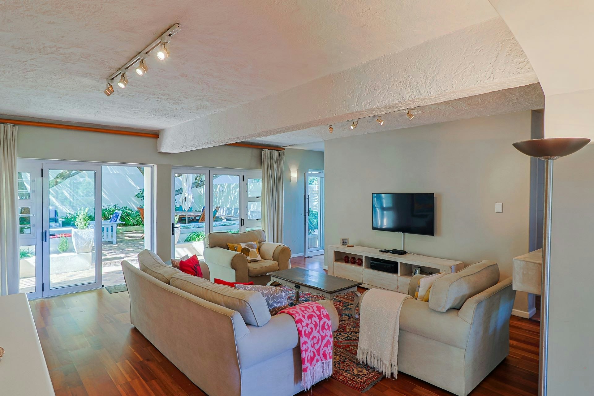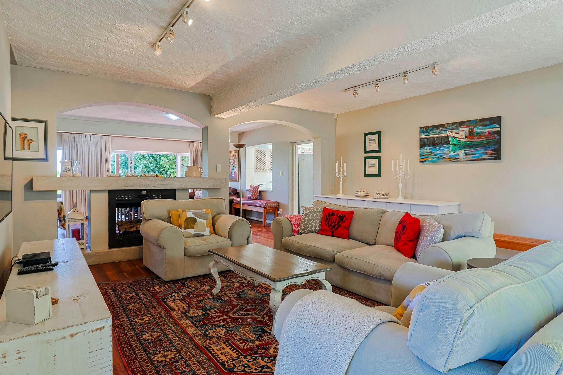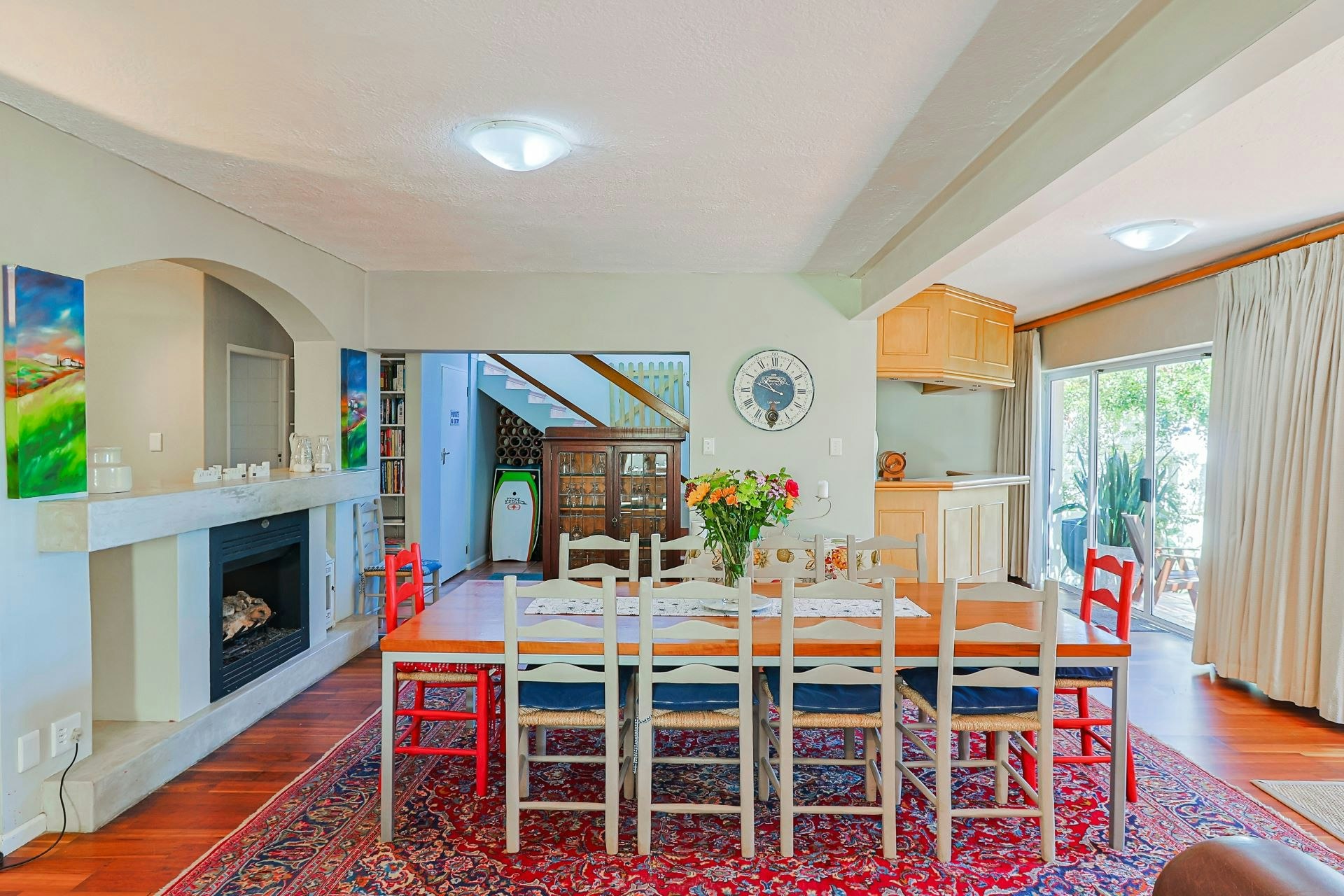 The house features 2 braai areas and a wood-burning pizza oven, as well as outdoor dining on the north and south side of the house, portable braai facilities, and secure off-street parking for 4 cars. The house is both pet friendly and child friendly.