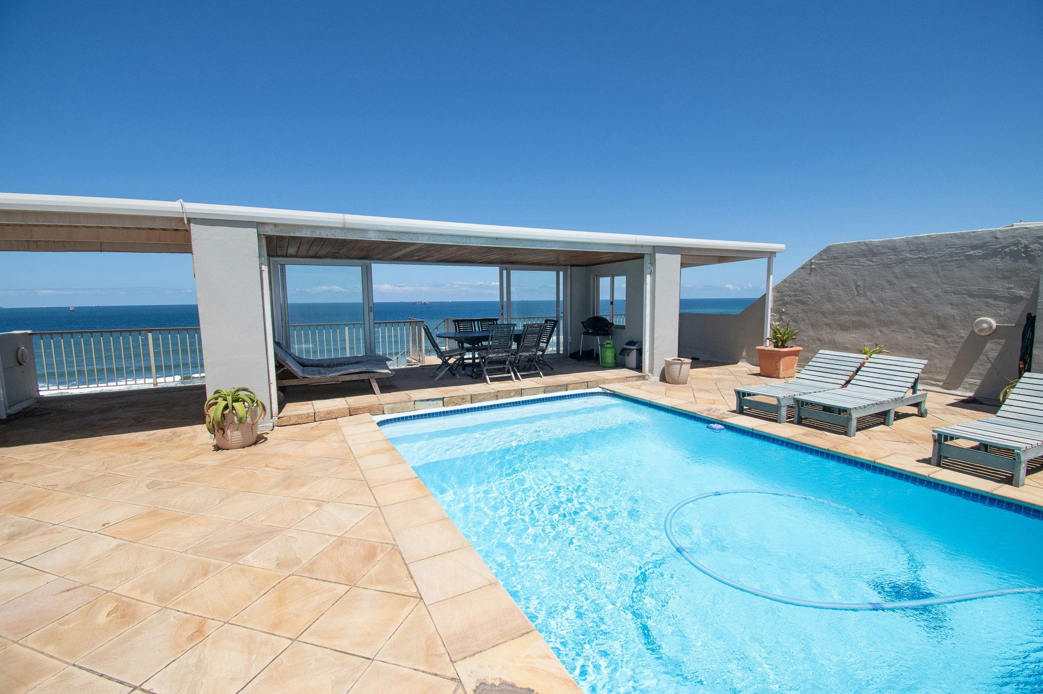 A small open-plan kitchen, opens into the dining area then lounge which is all upstairs, with lovely sea views. The kitchen is equipped with a fridge, an oven and stove, and a microwave, as well as a dishwasher and a washing machine for guests convenience. The lounge has a TV with full DStv channels. WiFi included. Off the balcony are spiral stairs leading up to the swimming pool, which has a braai and sheltered area. The swimming pool is shared with the duplex apartment next door.