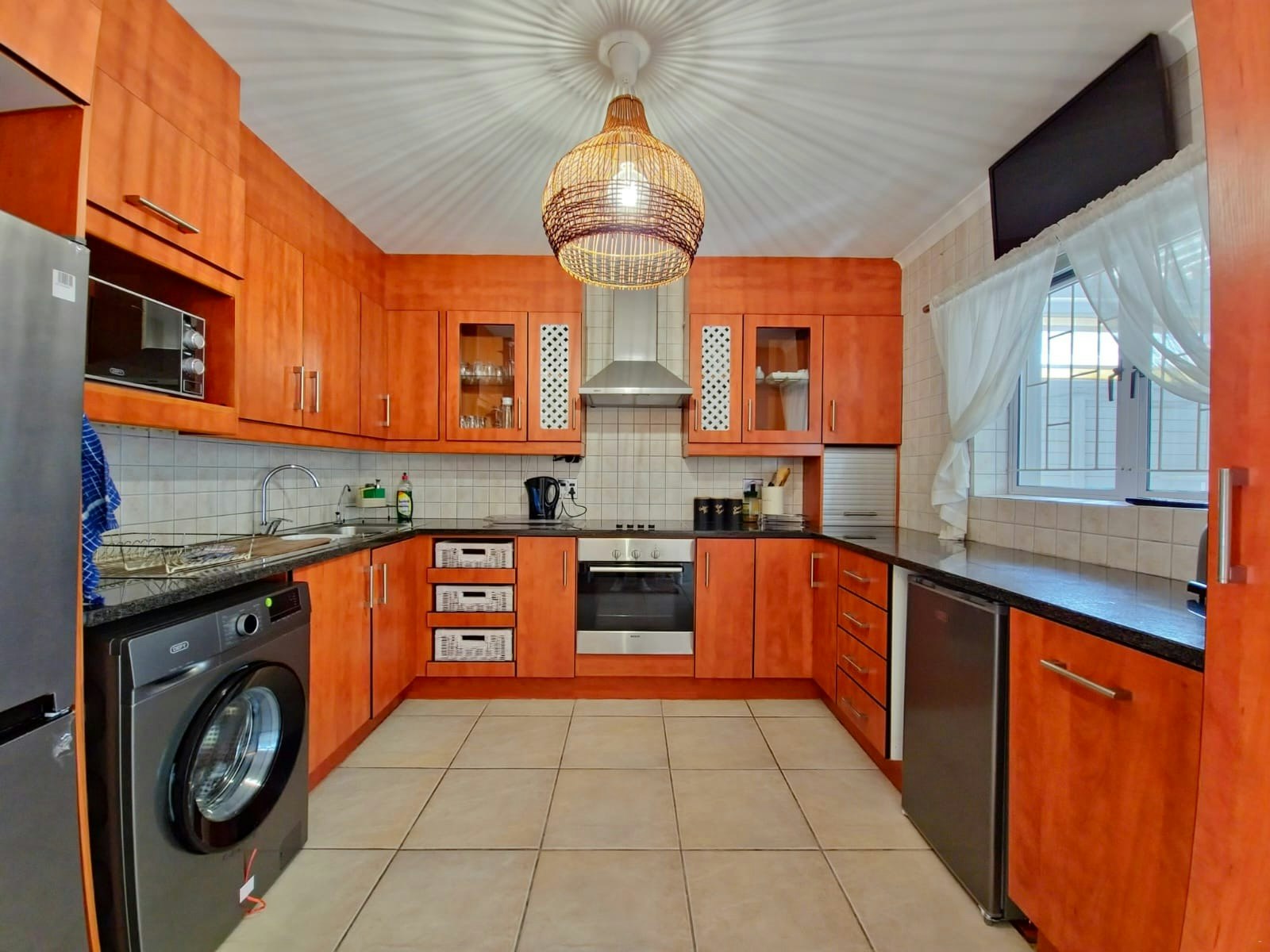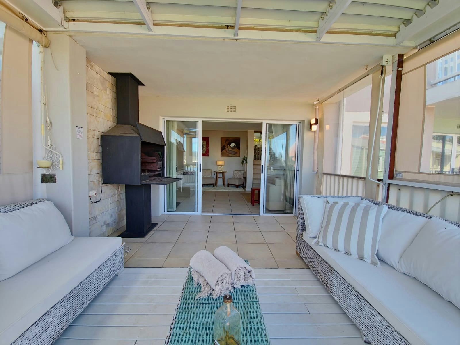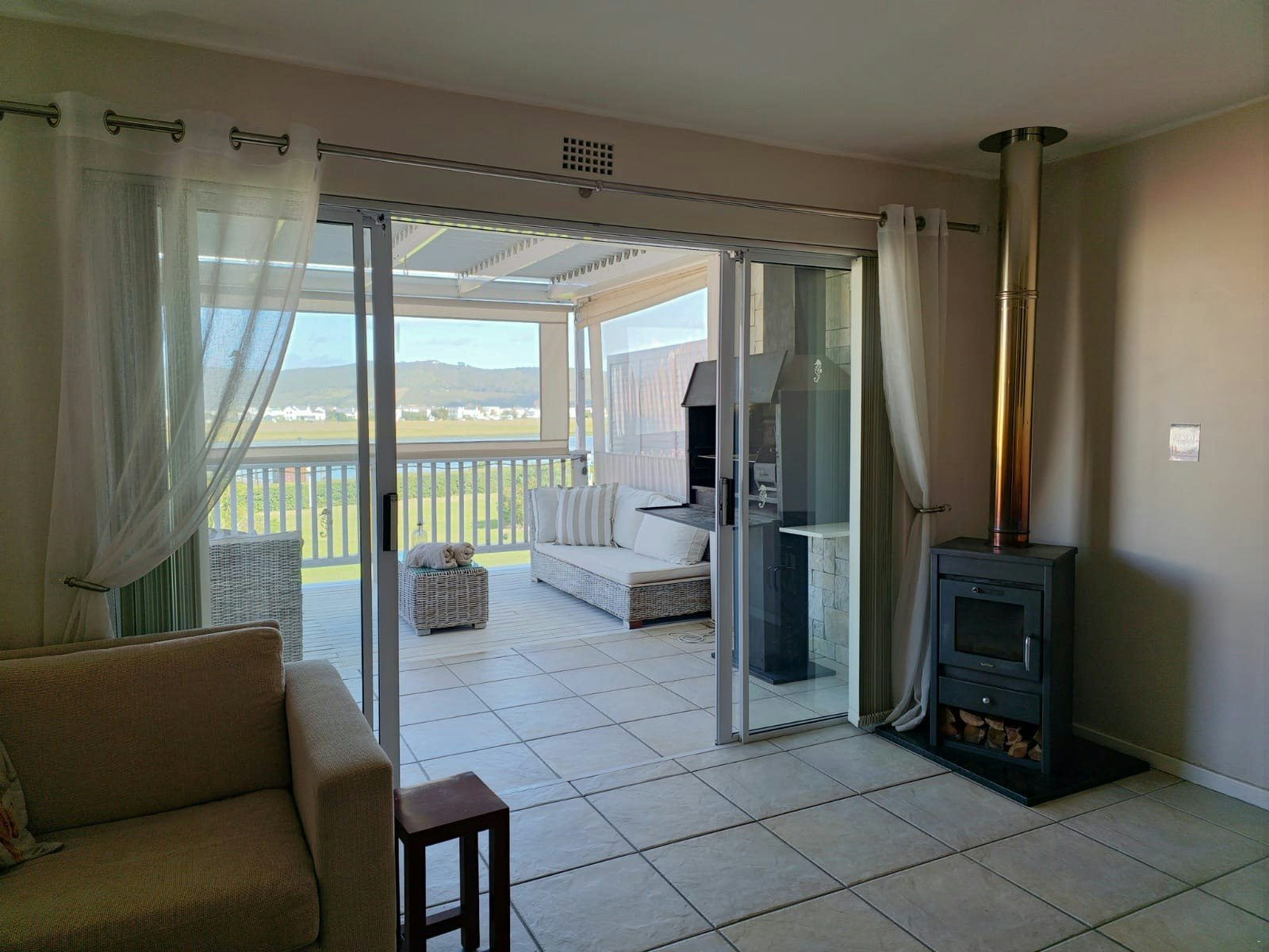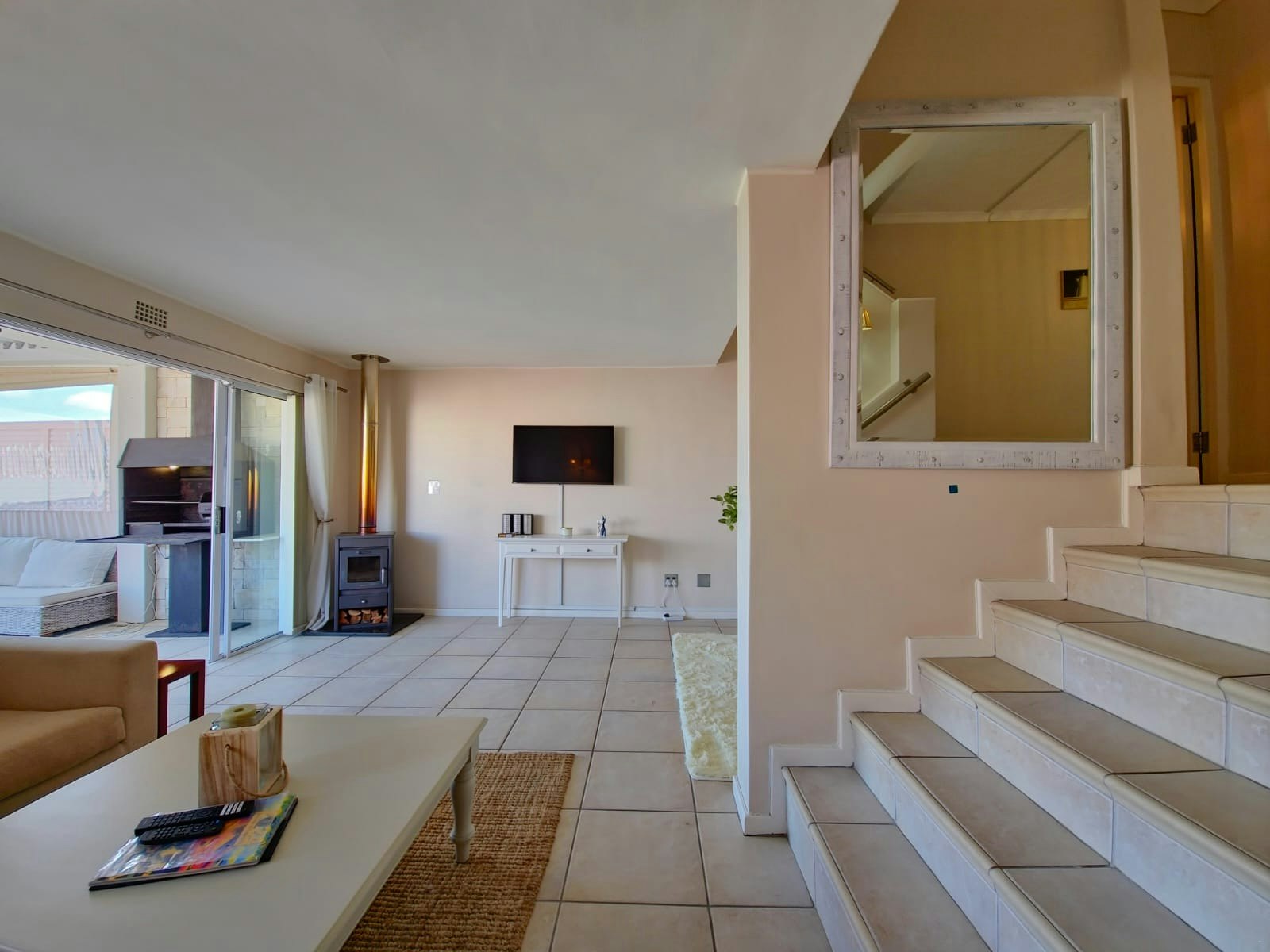 The second floor offers a fully equipped kitchen fitted with a stove, oven, cutlery, crockery, utensils, microwave, fridge-freezer, kettle, toaster, dishwasher, and a washing machine that leads to the dining area, which offers a 6-seater dining table, a separate guest toilet, and flows down the stairs to the lounge area furnished with comfortable seating, a fireplace, TV with DStv, streaming options, Wi-Fi and walks out onto a covered deck furnished with outdoor furniture and braai facilities with a view. The kitchen walks out to a separate deck with a gas braai and comfortable seating.
