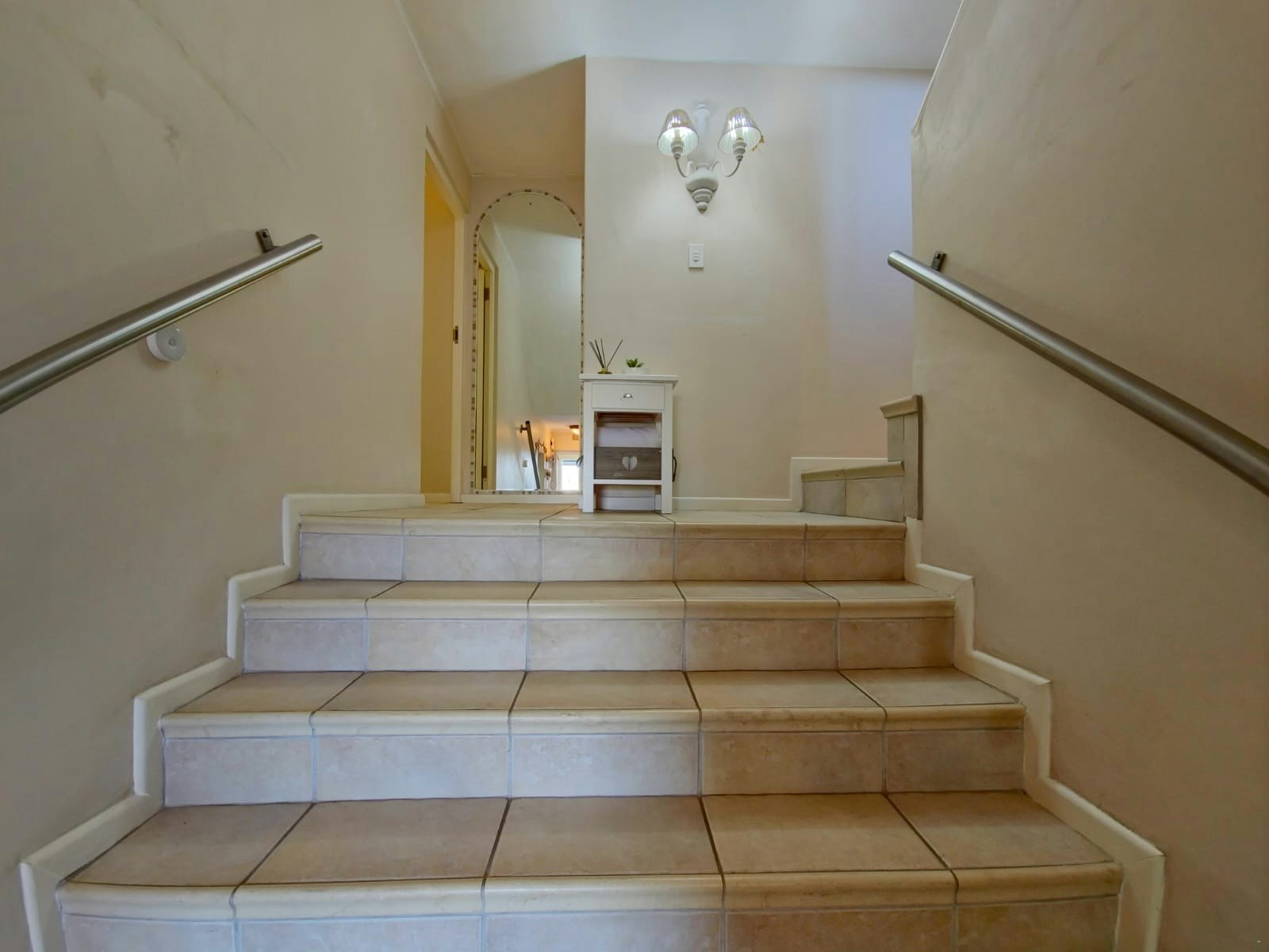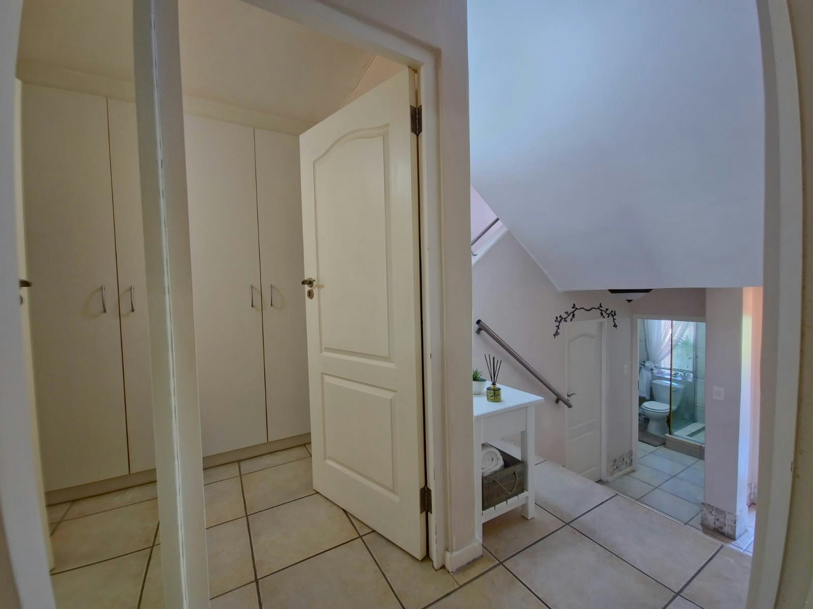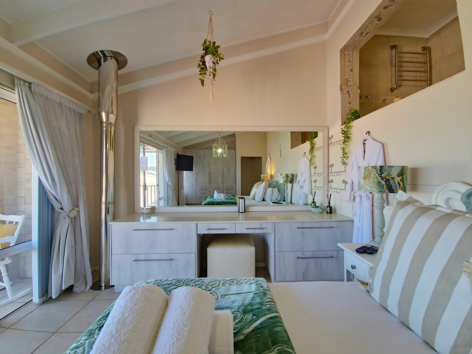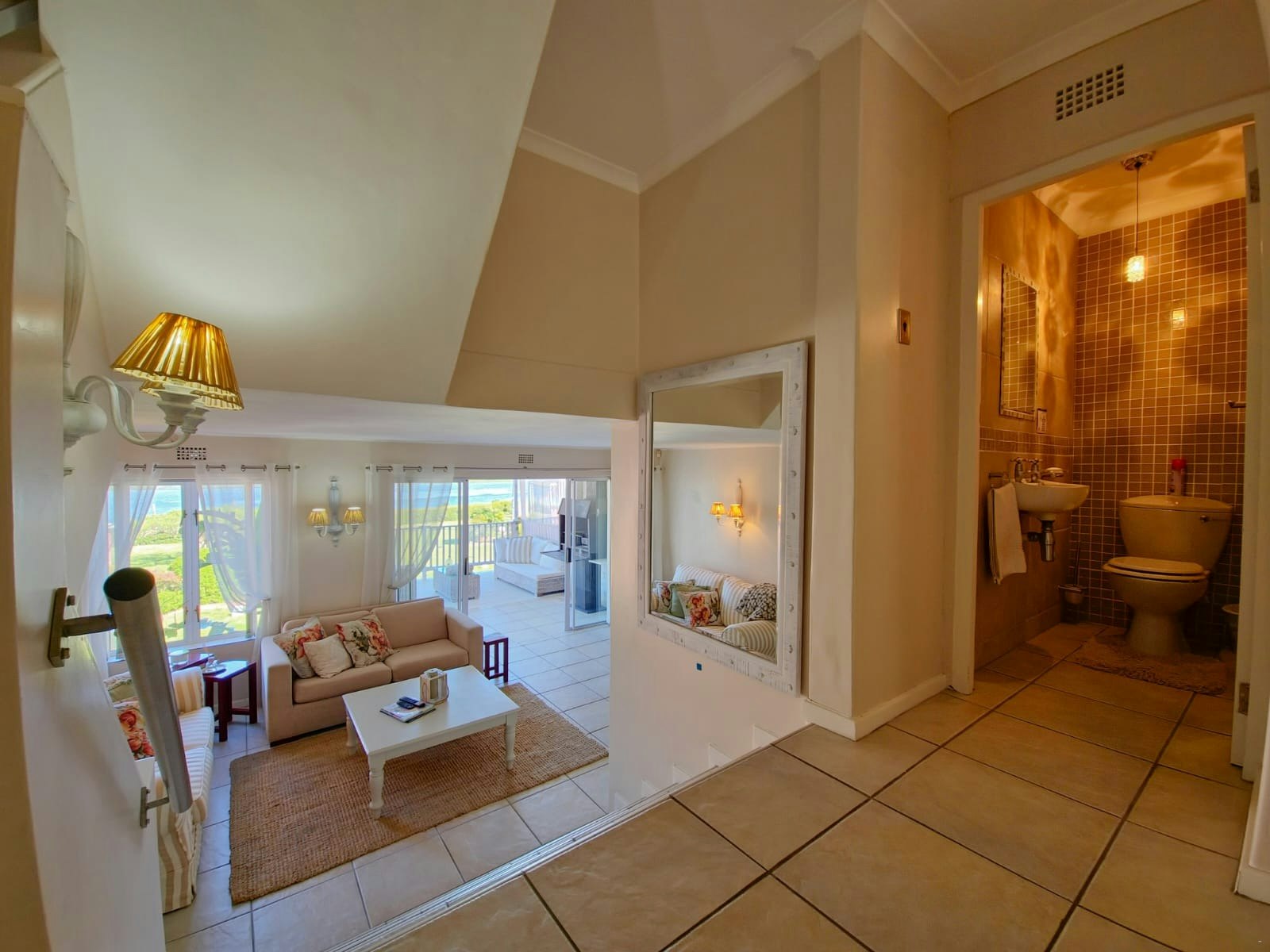 The unit comprises 3 bedrooms upstairs, the main bedroom is furnished with a king-size bed, closet space, a dressing table, TV, and walks out onto a balcony with a view. The en-suite bathroom is fitted with a bath, toilet, and basin. The second bedroom is furnished with a double bed, and the third bedroom with 2 single beds, and they share a bathroom fitted with a shower, toilet, and basin.