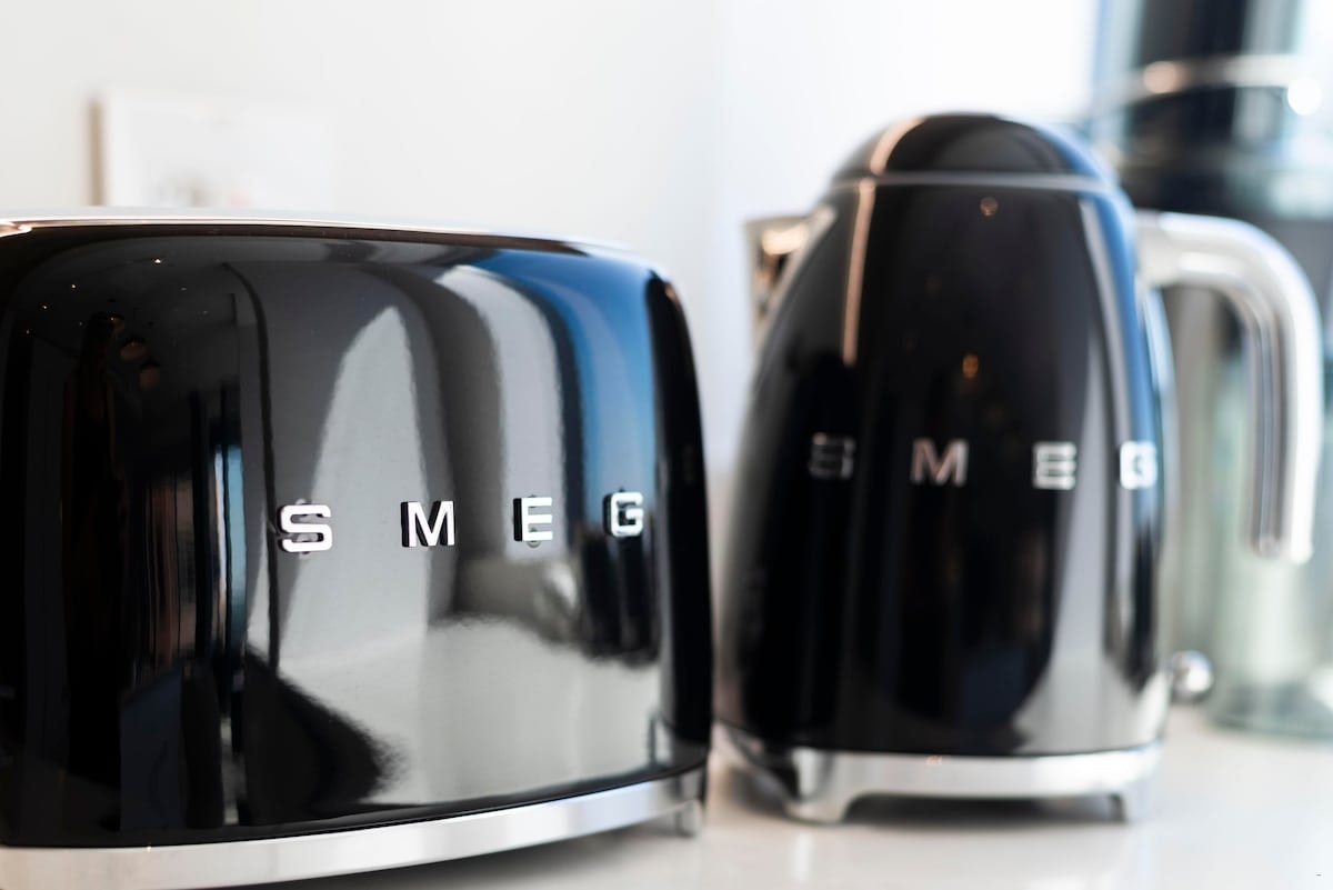 The unit boasts an open-plan living area with a fully equipped kitchen, including a stove, oven, microwave, kettle, coffee machine, toaster, fridge-freezer, washer-dryer combo, and a breakfast bar with stools. The lounging and dining areas offer comfortable seating for dining and relaxation. For entertainment, a smart TV and access to free Wi-Fi are provided.
