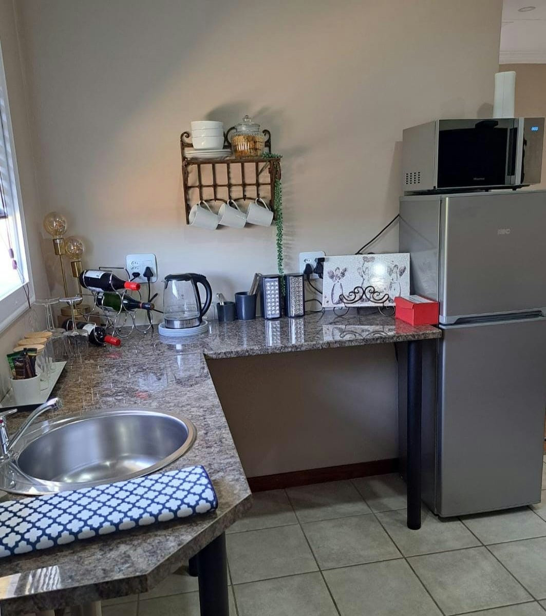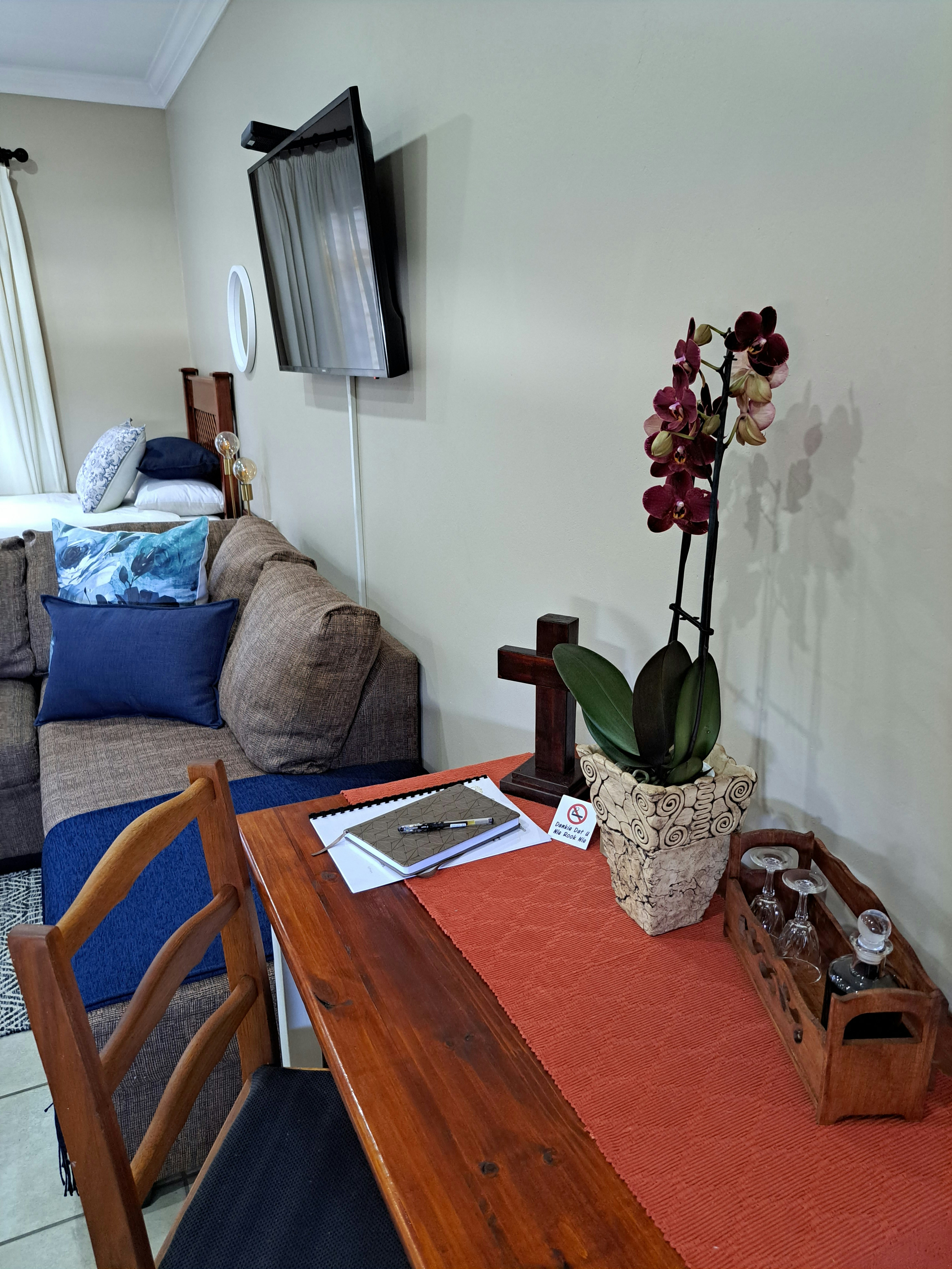 The unit boasts a kitchenette complete with a microwave, fridge-freezer, and kettle, as well as cutlery and crockery. Additionally, there are tea and coffee-making facilities along with an honesty bar. Relax on the couch while enjoying the smart TV with DStv channels, or stay connected with the free Wi-Fi available in the unit.
