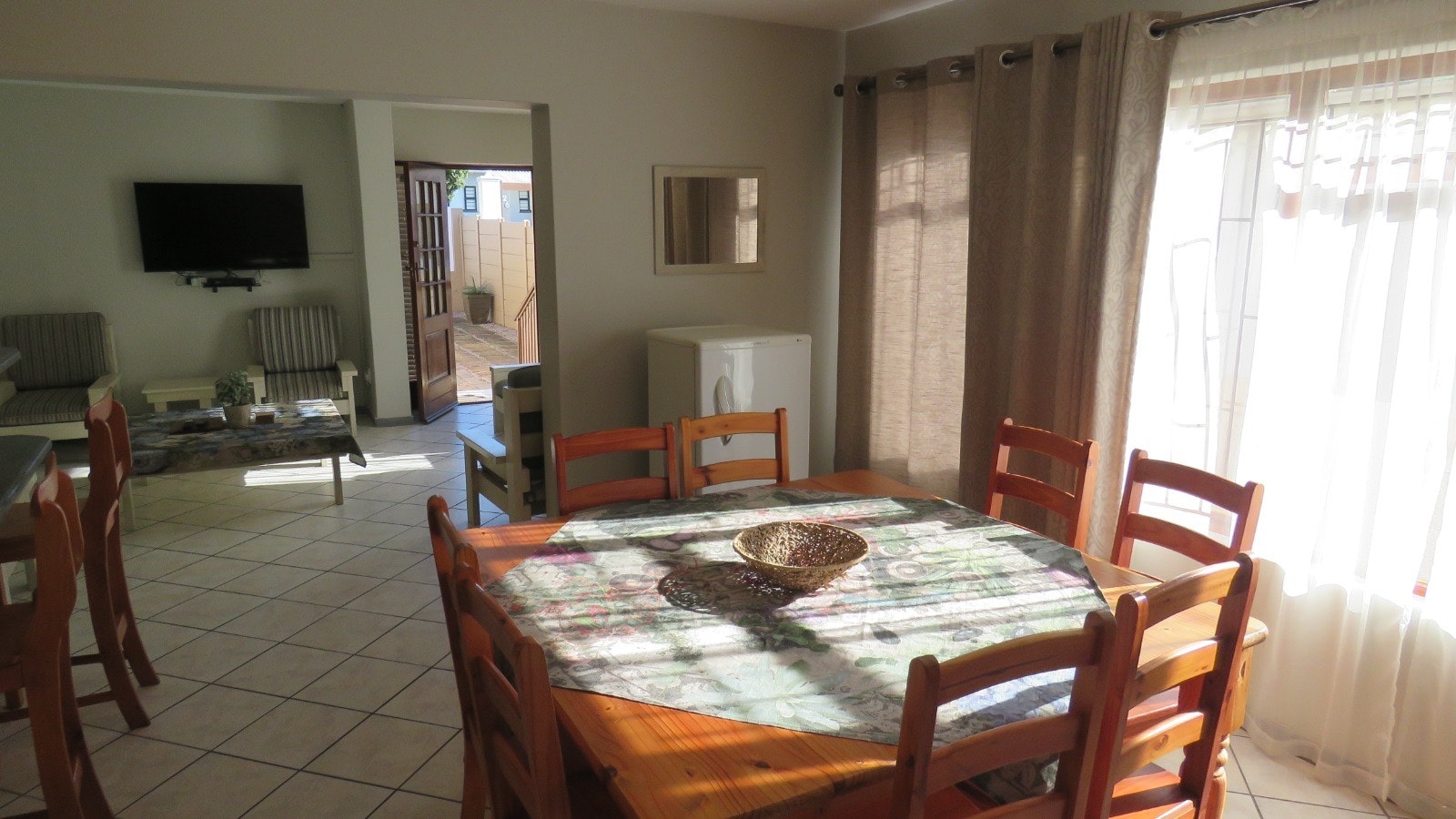 Accommodation is divided into three units. The Front House has 3 bedrooms and a full bathroom with a bath, shower, toilet, and basin, plus an additional toilet and basin. The first bedroom has a double bed, while the second and third bedrooms each have 2 single beds. The kitchen is equipped with a fridge, freezer, microwave, stove with oven, and pantry. The lounge has a TV with selected DStv channels and free Wi-Fi. A braai is available.