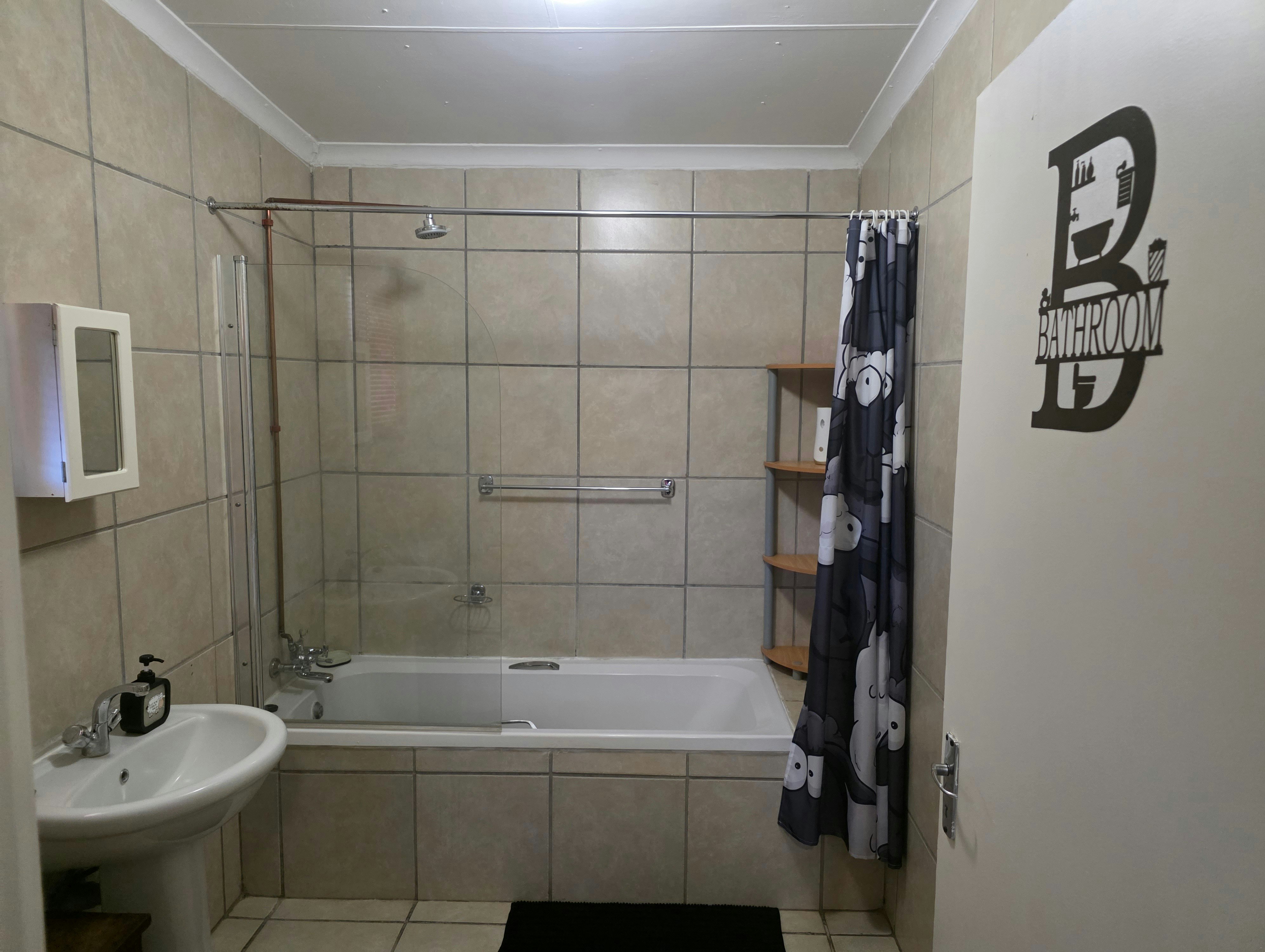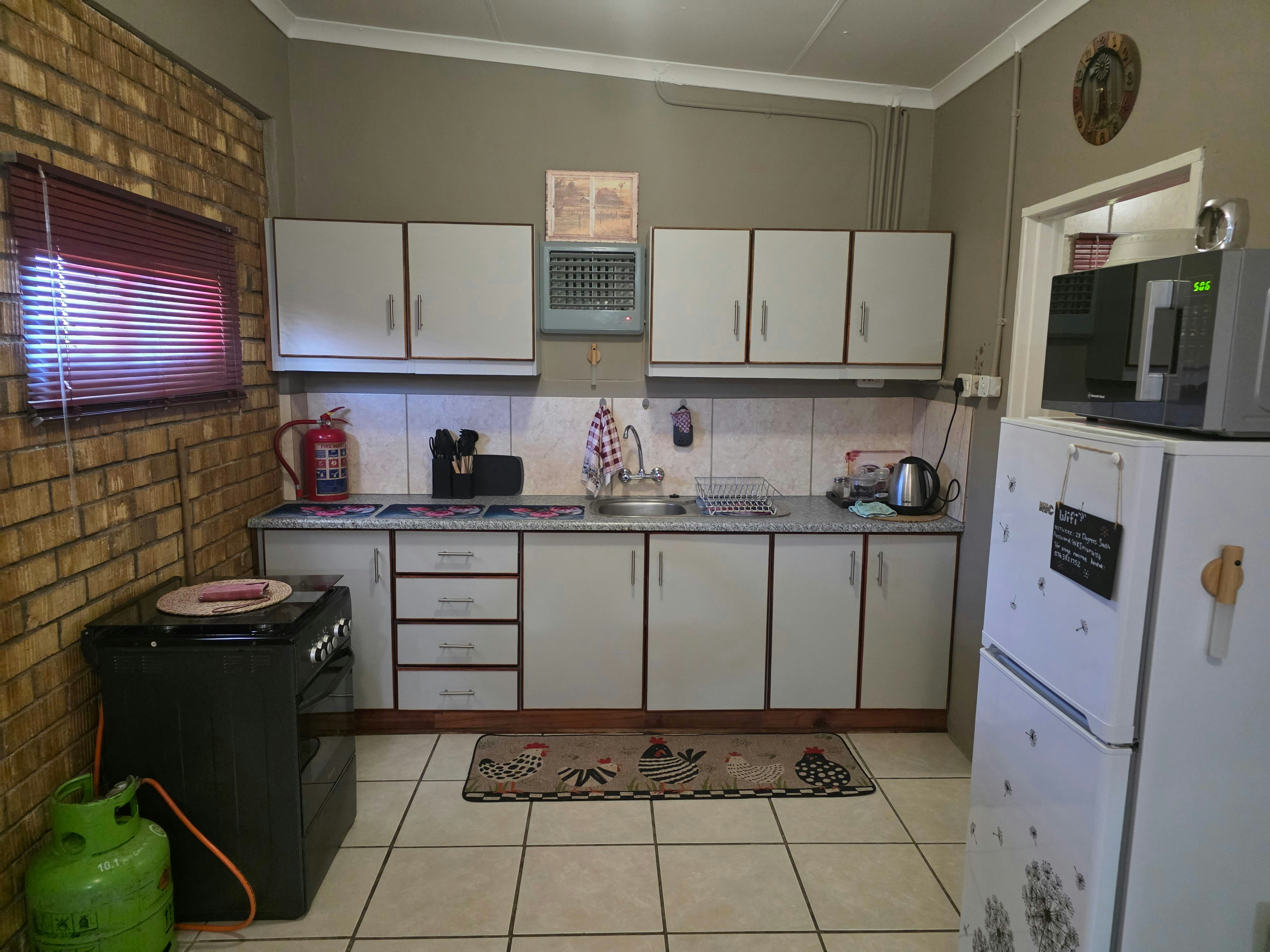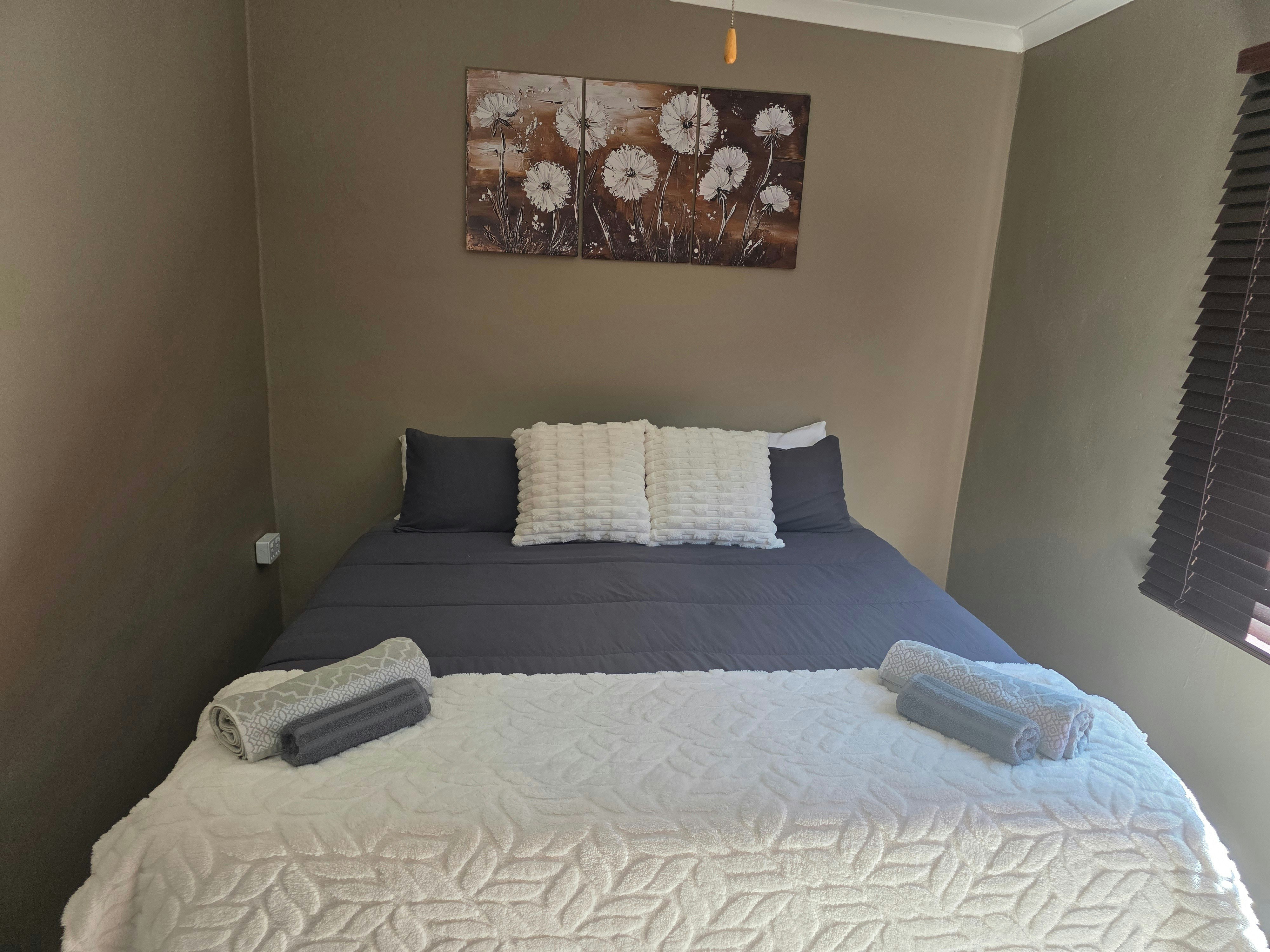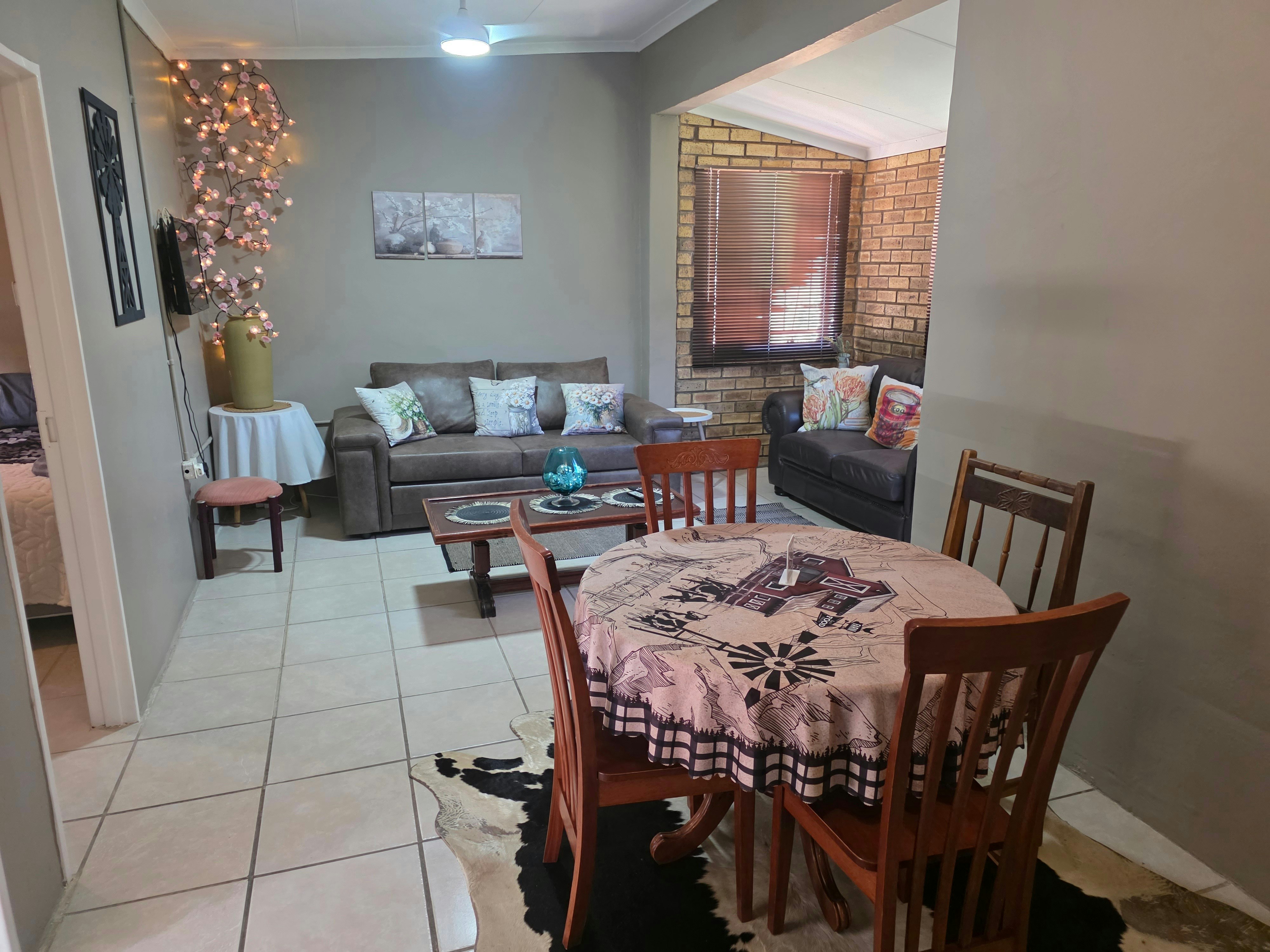 The kitchen is equipped with a gas stove, fridge-freezer, microwave, and all necessary crockery and cutlery. The dining area provides seating for four guests, and the lounge features a flat-screen TV with an MI TV stick for Netflix. Please note that DStv is not available.