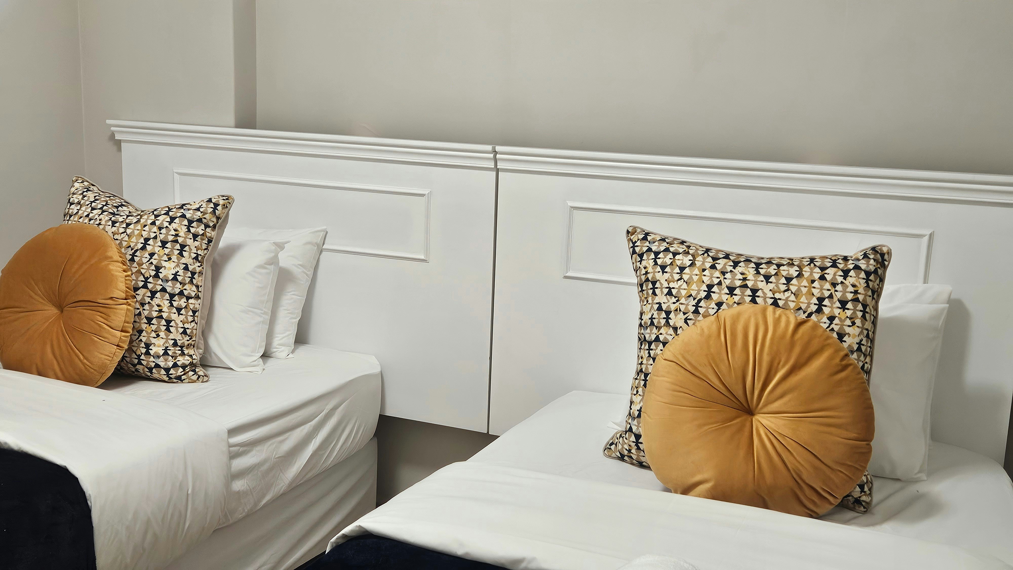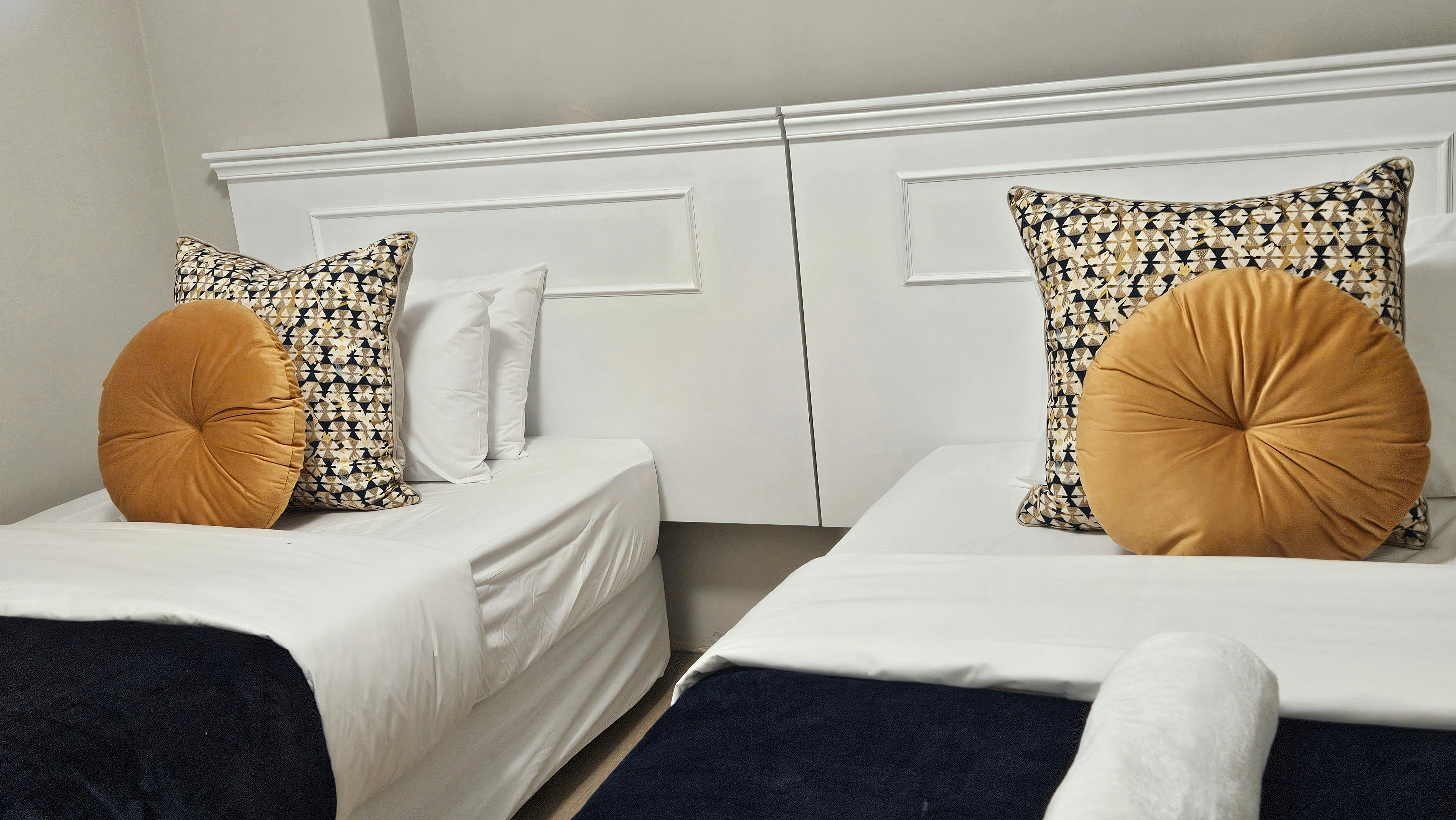 The unit comprises 3 bedrooms, 2 of which are each furnished with queen-size beds, and the third bedroom is furnished with 2 three-quarter beds. The 2 shared bathrooms are each fitted with a shower, toilet, and basin.