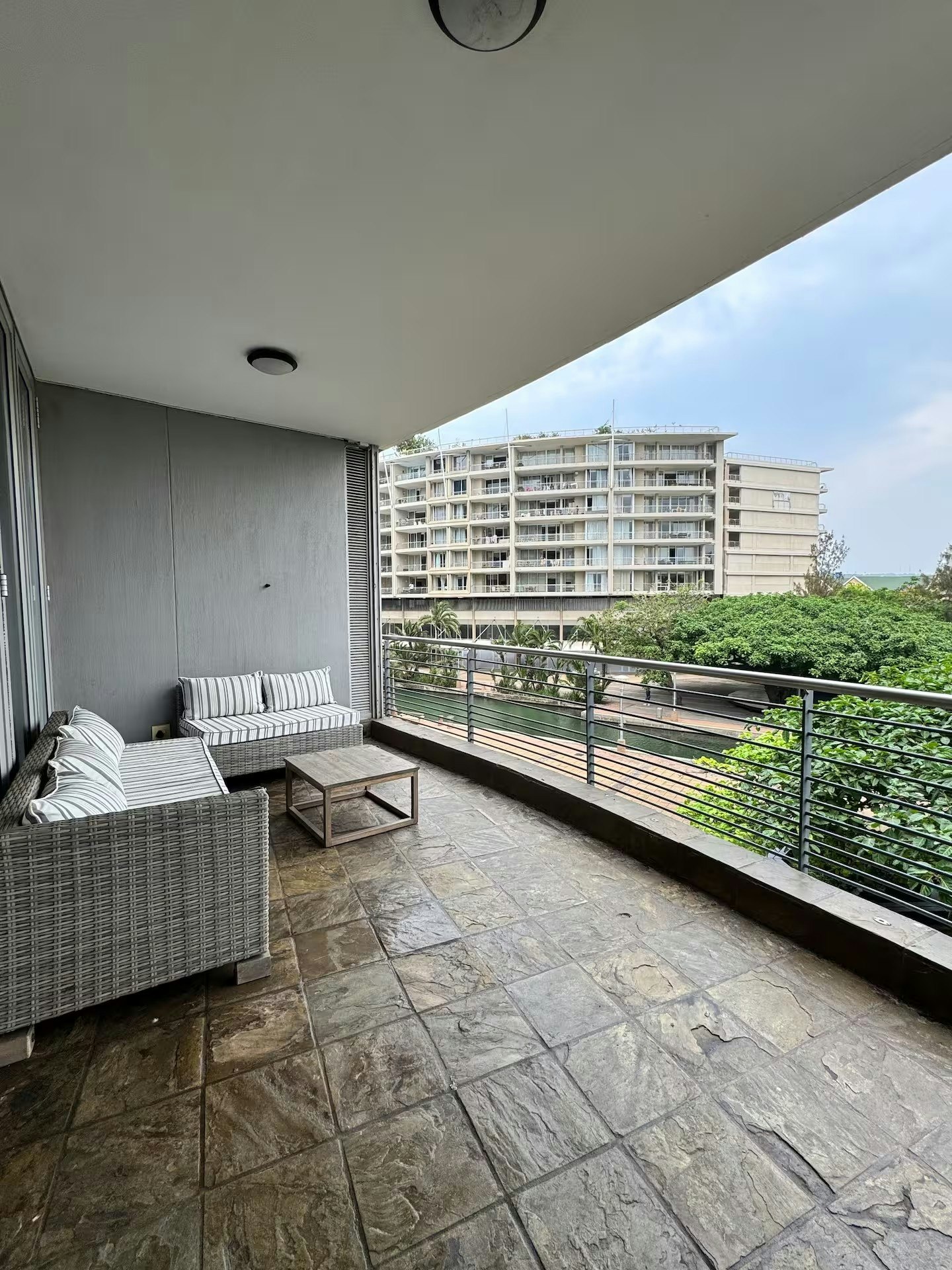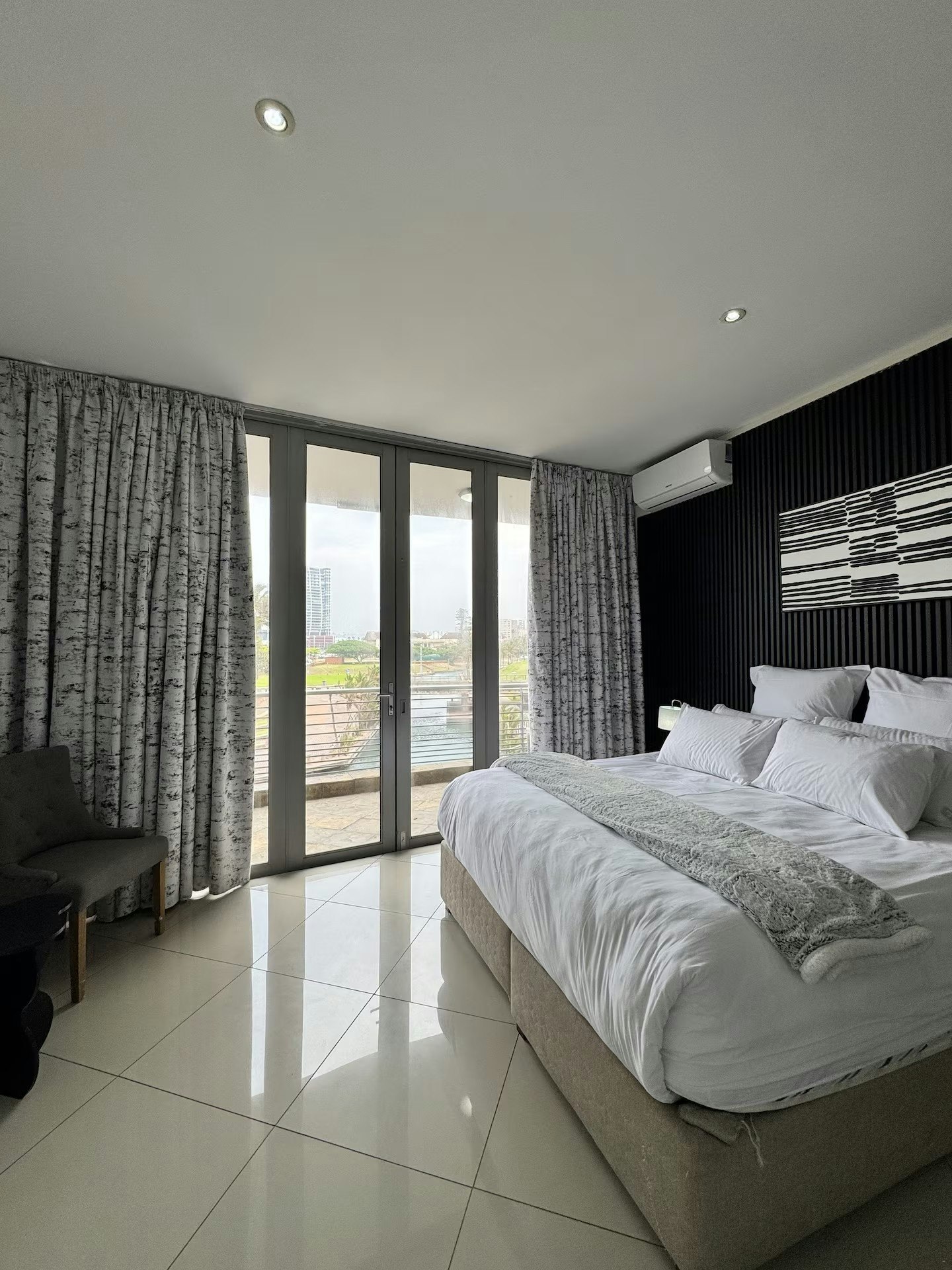 Die woonstel bied 'n ontspannende atmosfeer met stylvolle meubels en pragtige uitsigte oor die kanaal wat na uShaka Marine World lei. Skuifdeure maak oop na 'n groot balkon met 'n braai, wat 'n ideale ruimte bied vir vermaak of om die waterfront-uitsig te geniet. Bykomende geriewe sluit in 24-uur-sekuriteit en onbeperkte WiFi, wat die woonstel geskik maak vir beide ontspannings- en sakeverblyf.