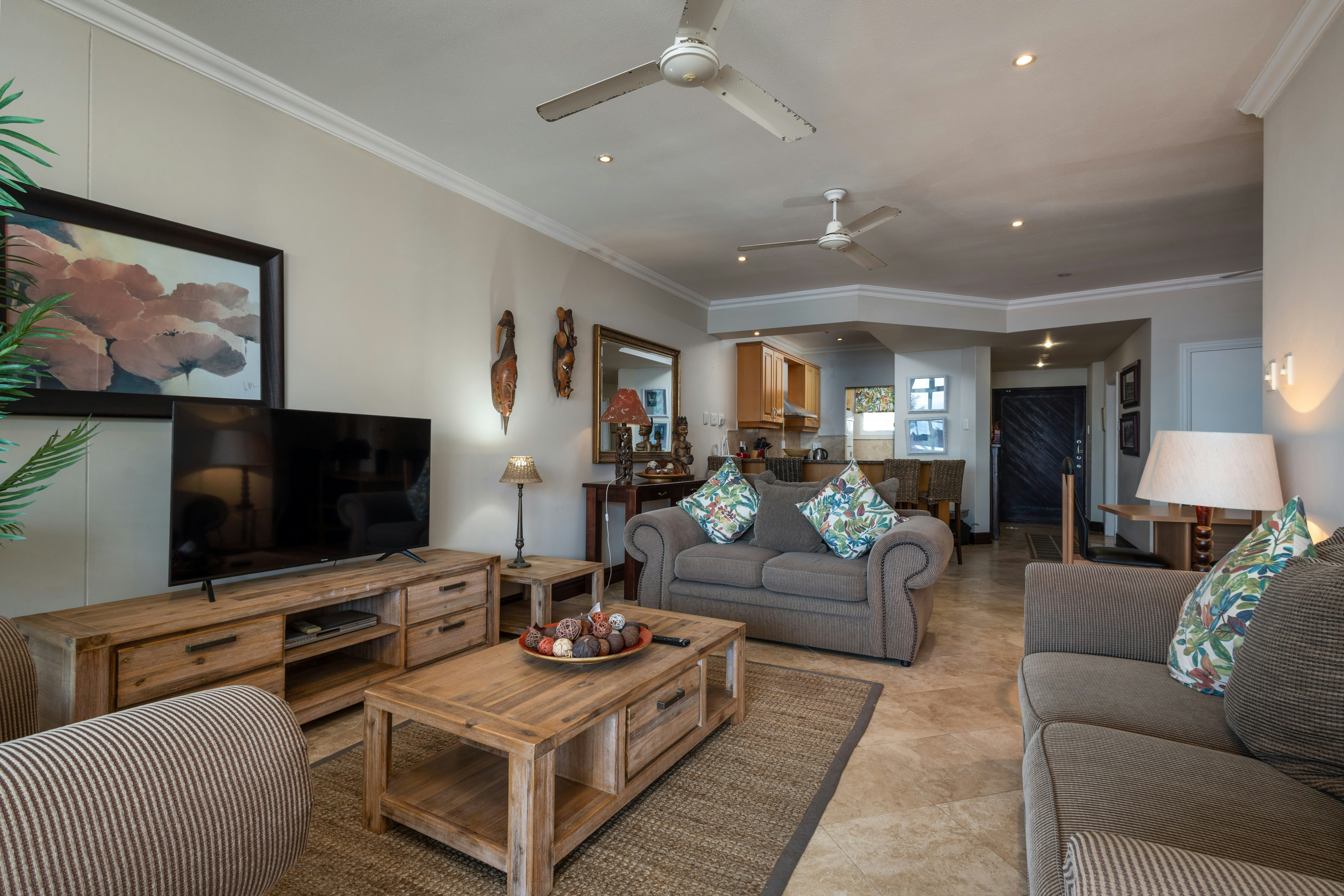 Die sitkamer het deure wat op 'n groot onderdakstoep met buitemeubels, lieflike see-uitsigte en uitsigte oor die tuine en die Oyster Box Hotel.