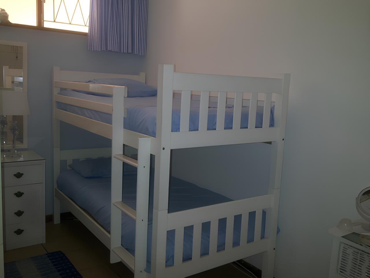 The modern self-catering unit comfortably sleeps 6 people and comprises 2 bedrooms, a fully equipped kitchen, lounge, and bathroom. The main bedroom is furnished with a double bed and the second bedroom has 2 bunk beds. The bathroom has floor-to-ceiling tiles and is fitted with a toilet, basin, bath, and shower. Towels are not provided and guests need to provide their own. The kitchen is equipped with a fridge, microwave, under-counter oven, ceramic hob, cutlery and crockery. Other features include fans, a smart, flat-screen TV with all OpenView channels and a private patio leading to a luscious tropical garden with direct access to the beach.