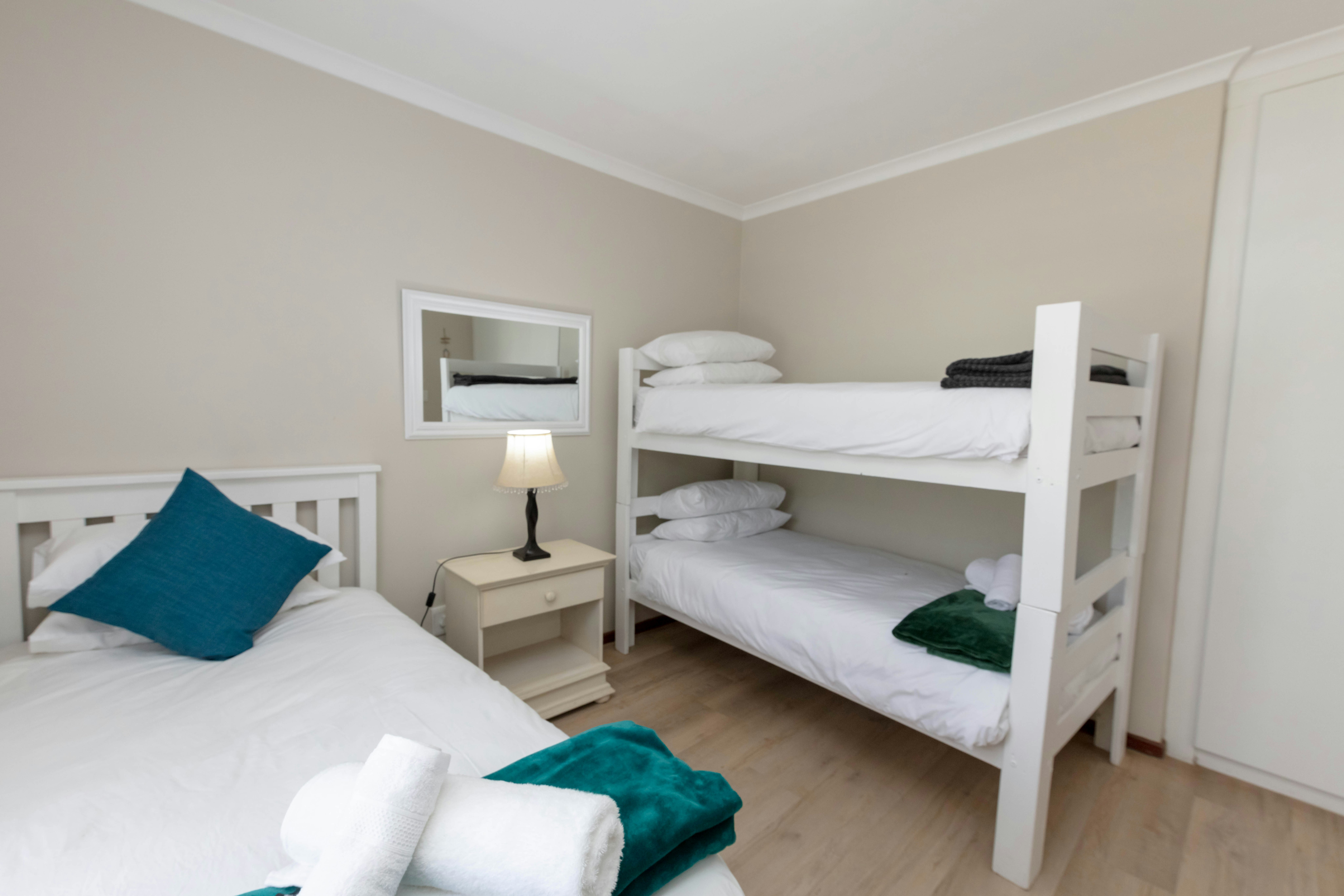 This first-floor unit can accommodate 5 guests at a time and comprises 2 bedrooms and 2 bathrooms. The first bedroom is furnished with a single bed and a bunk bed, while the second bedroom contains 2 single beds. The second bedroom features an en-suite bathroom fitted with a shower-over-bath. A shower is available in the second bathroom. All linen and bath towels are provided; however, guests are required to bring their own swimming towels.