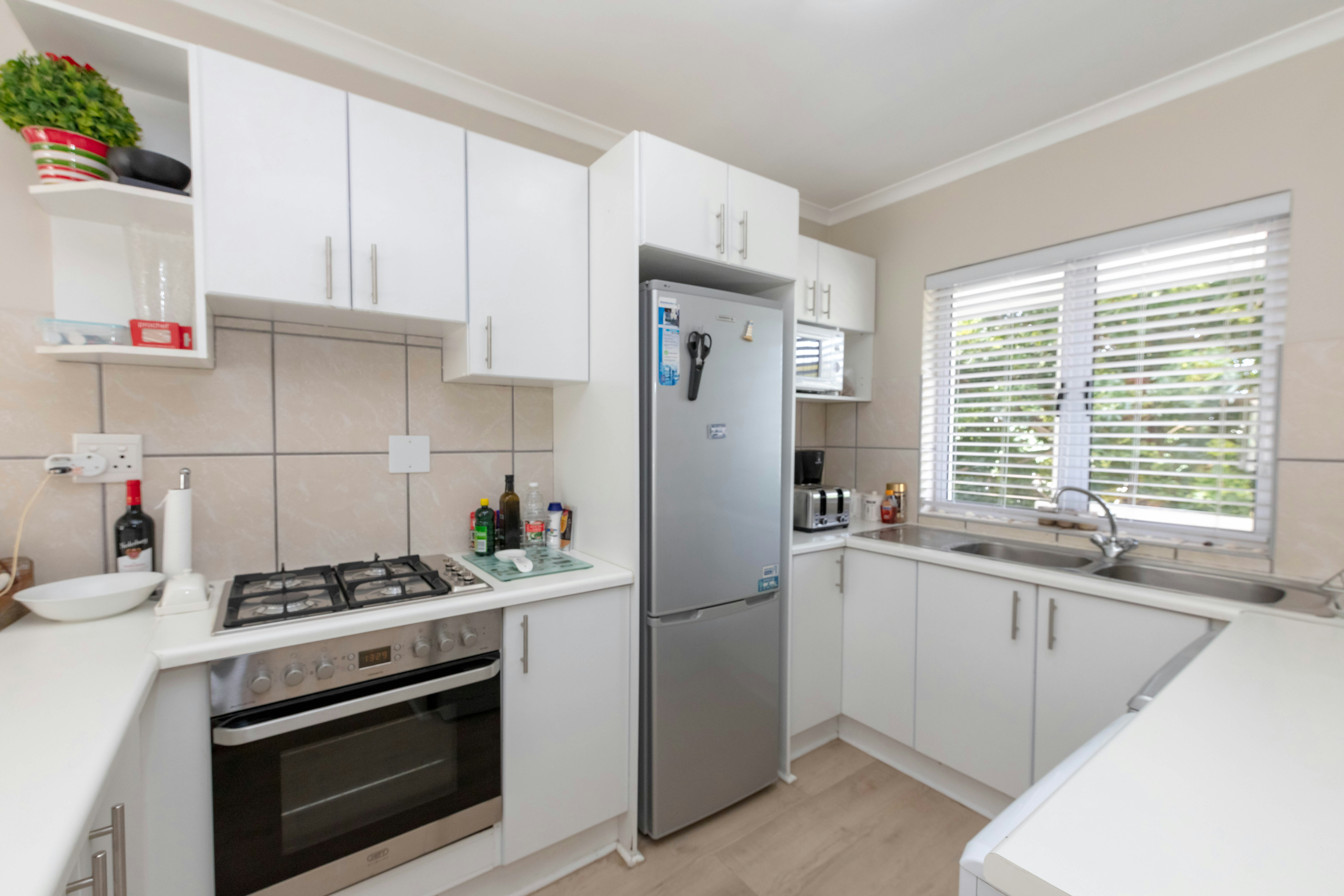 Through the double doors, there is a covered balcony with an outdoor dining table and a Weber braai. The River Club has communal facilities such as a swimming pool, a river, tennis courts and squash courts.