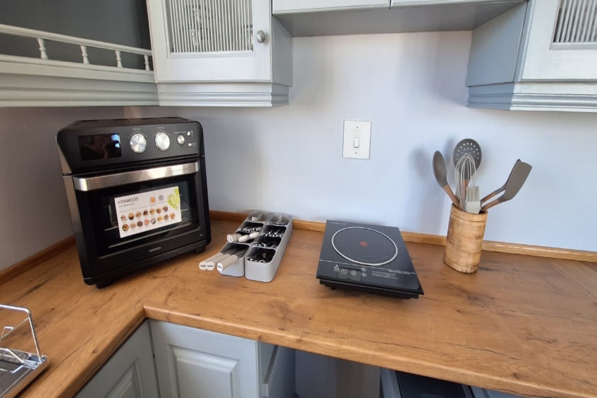 The unit features a well-equipped kitchen that includes a 1-plate induction hob, microwave, air fryer, kettle, cutlery, crockery, fridge-freezer, and a breakfast bar with stools. The lounge is furnished with comfortable couches, and for guest entertainment, a smart TV and free Wi-Fi are available.