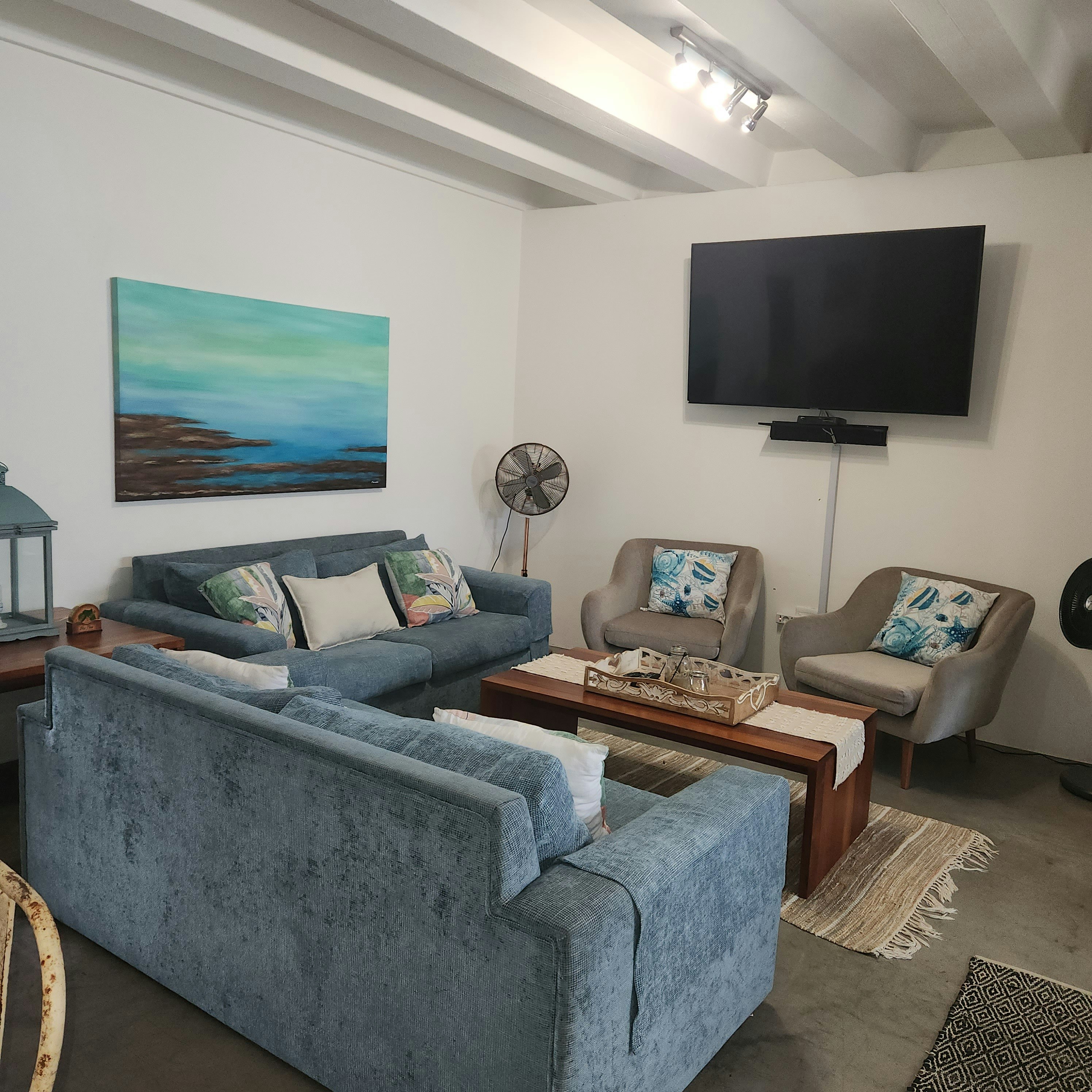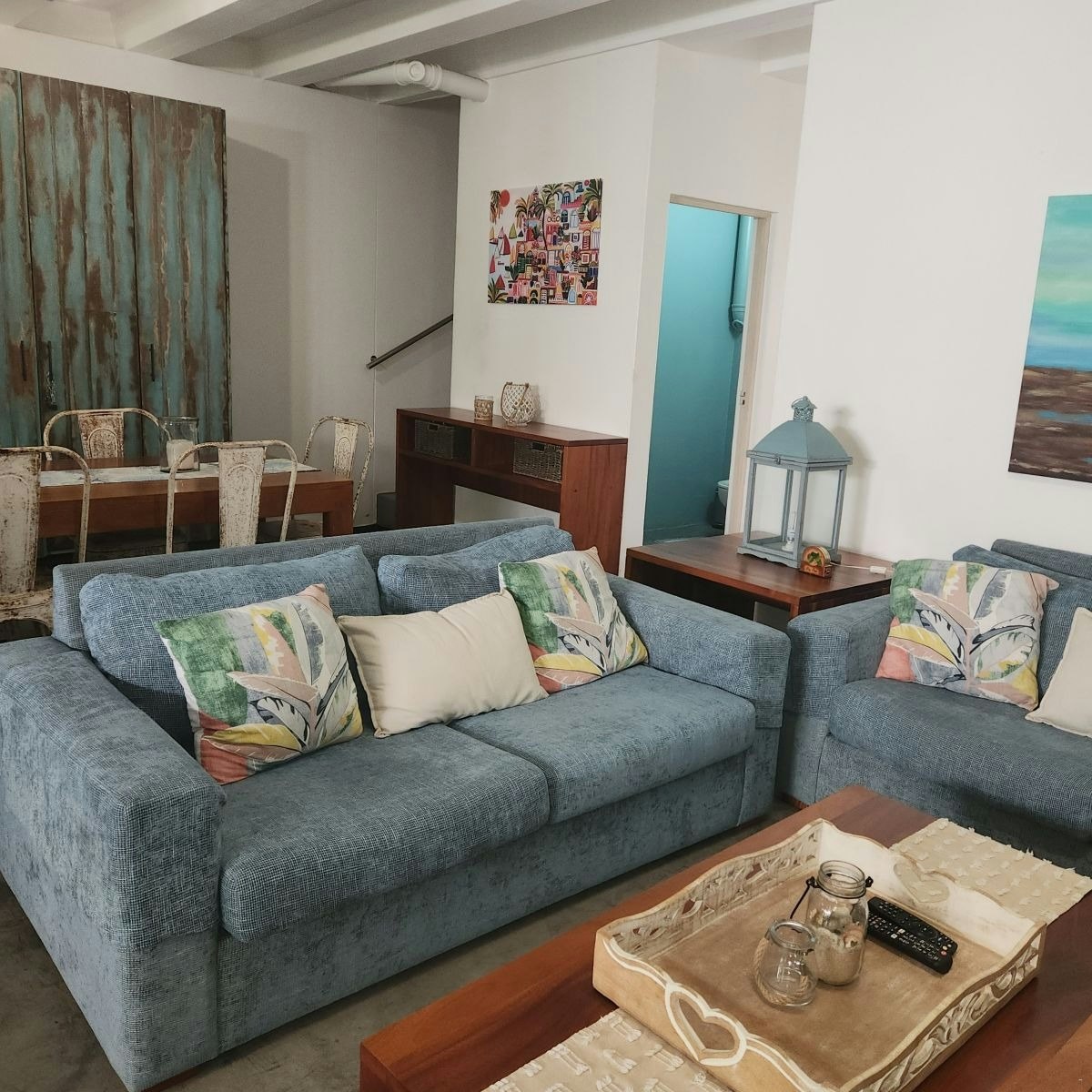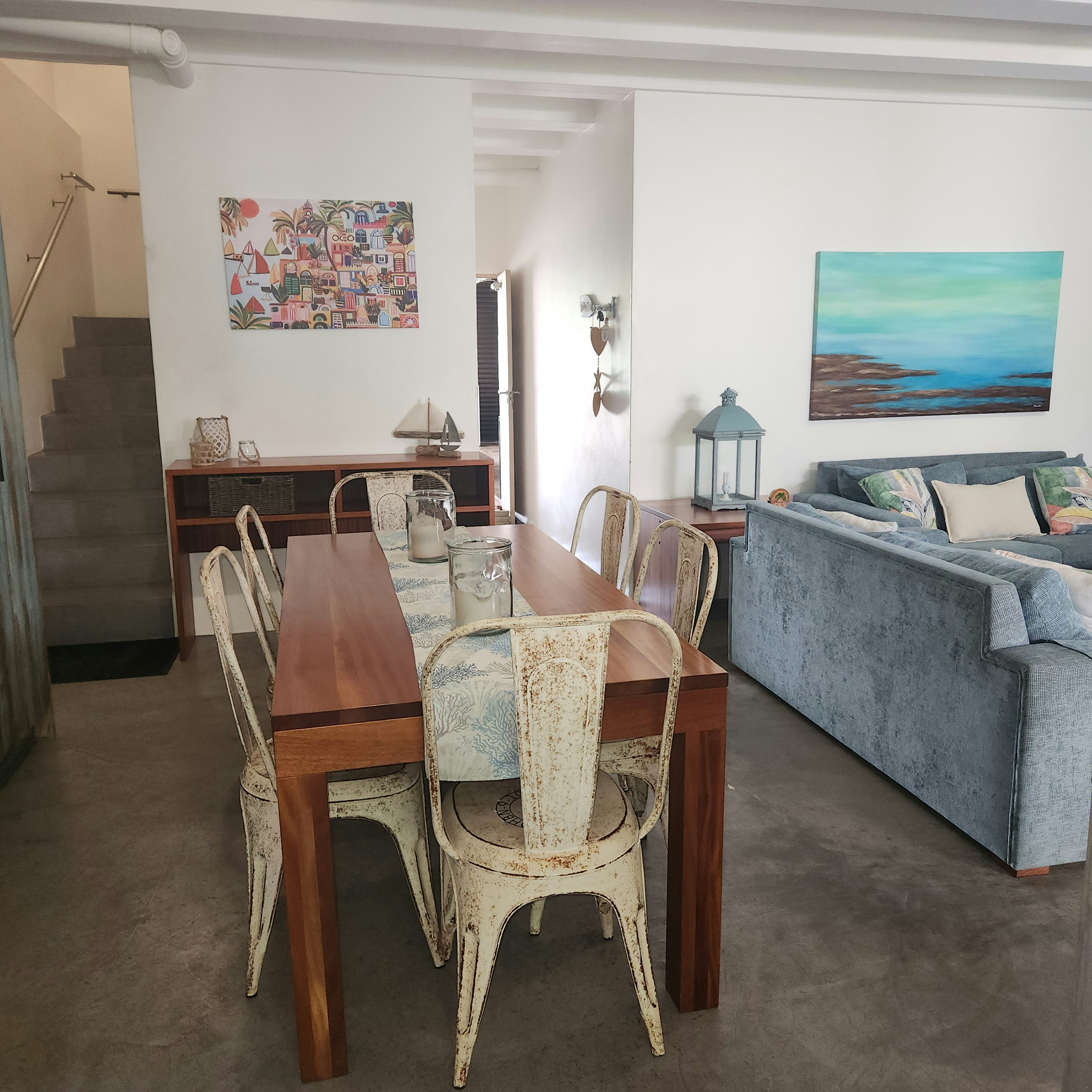 The open-plan living area offers a fully equipped kitchen with a stove, oven, cutlery, crockery, utensils, kettle, microwave, fridge-freezer, toaster, and a washing machine, and leads to the dining table that can accommodate 6 guests. The lounge flows from the dining area and is furnished with comfortable seating and a TV with Wi-Fi for your entertainment.