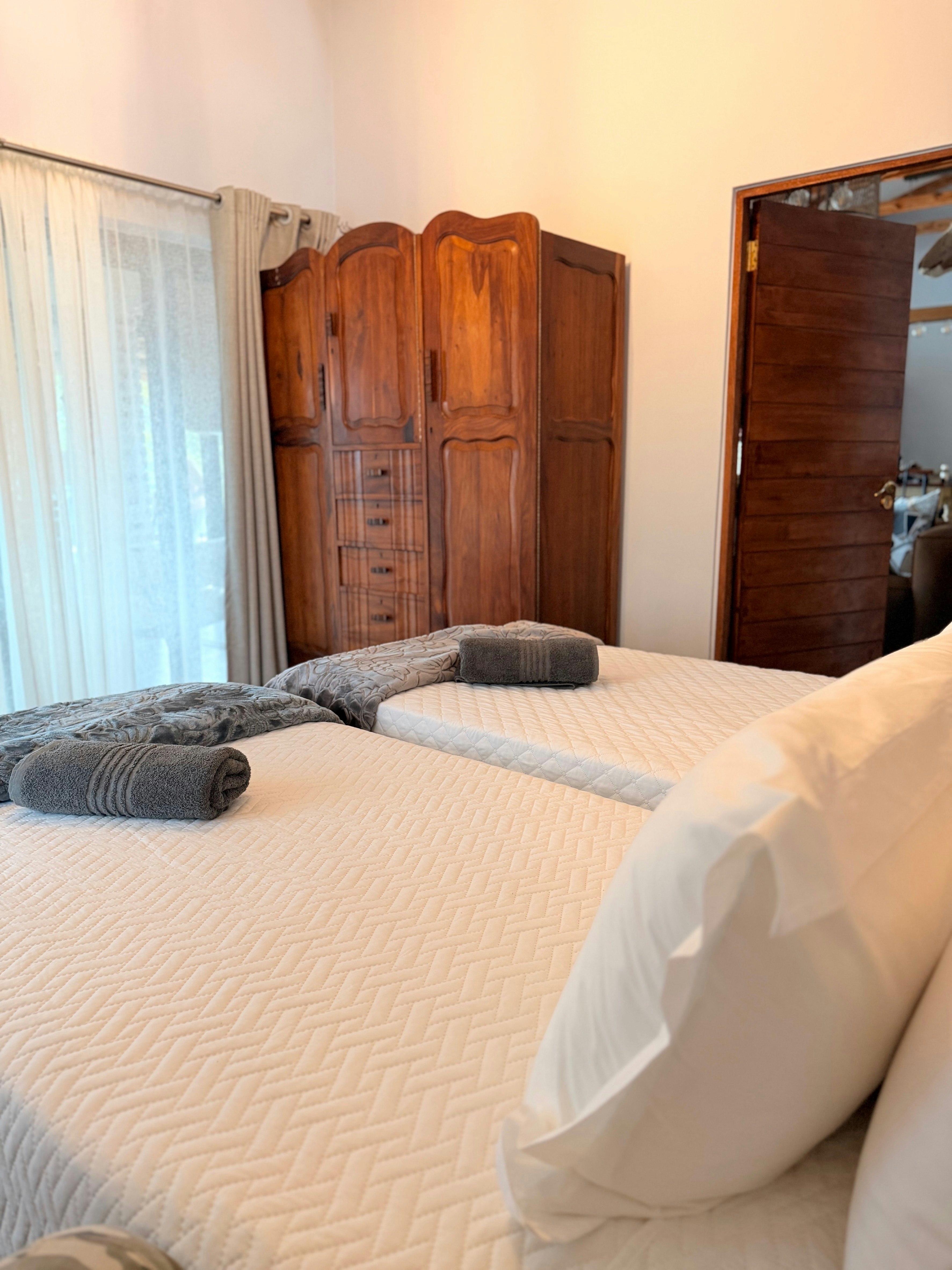 The house can accommodate 6 guests and comprises 3 bedrooms and 2 bathrooms and an outside shower. The main bedroom is furnished with a king-size bed and features an en-suite bathroom fitted with a bath, toilet and the outside shower. The second bedroom is furnished with a king-size bed, while the third bedroom contains a queen-size bed. The remaining bathrooms is fitted with a shower and toilet. Bed linen, bath towels and swimming towels are provided.