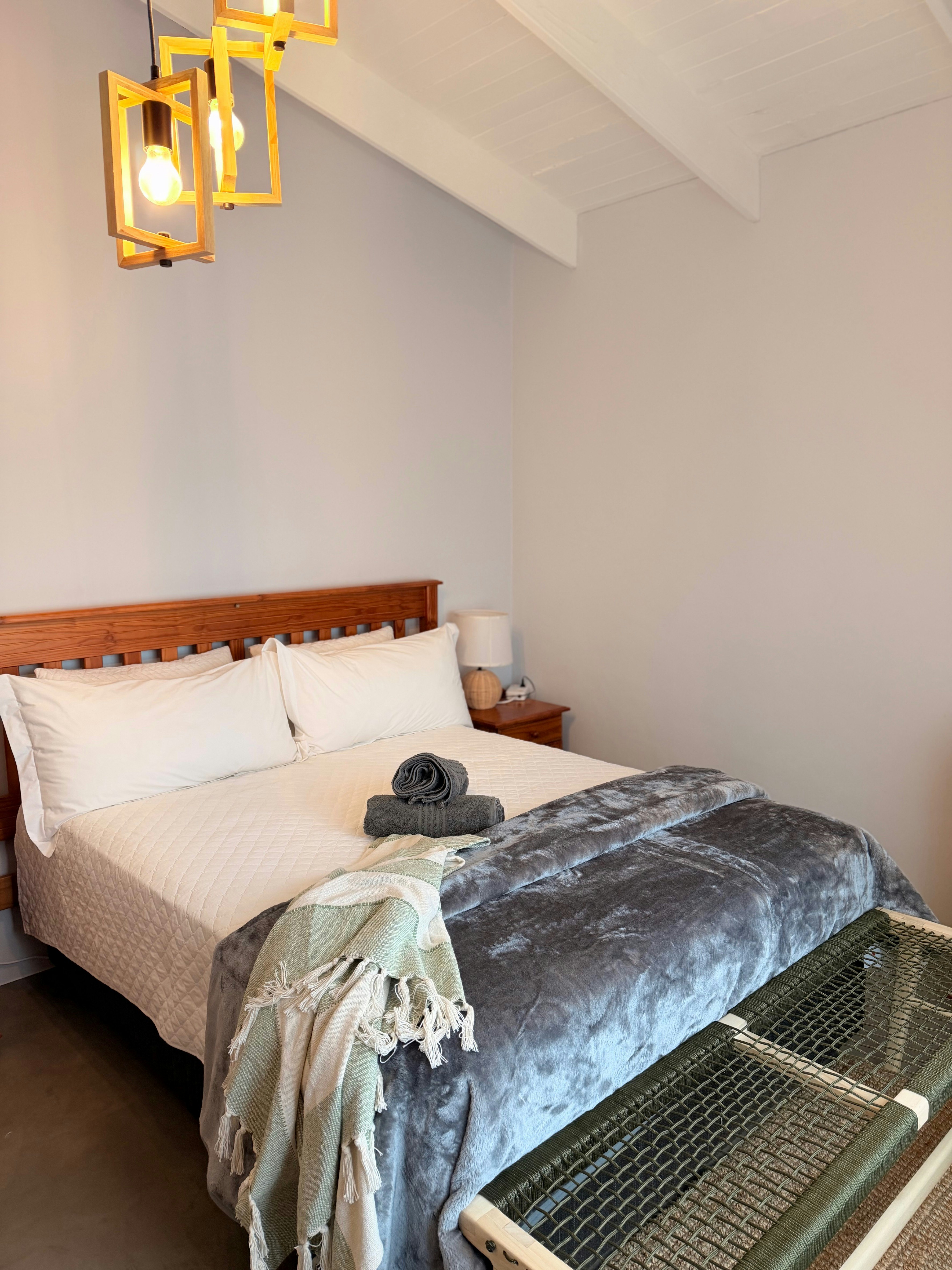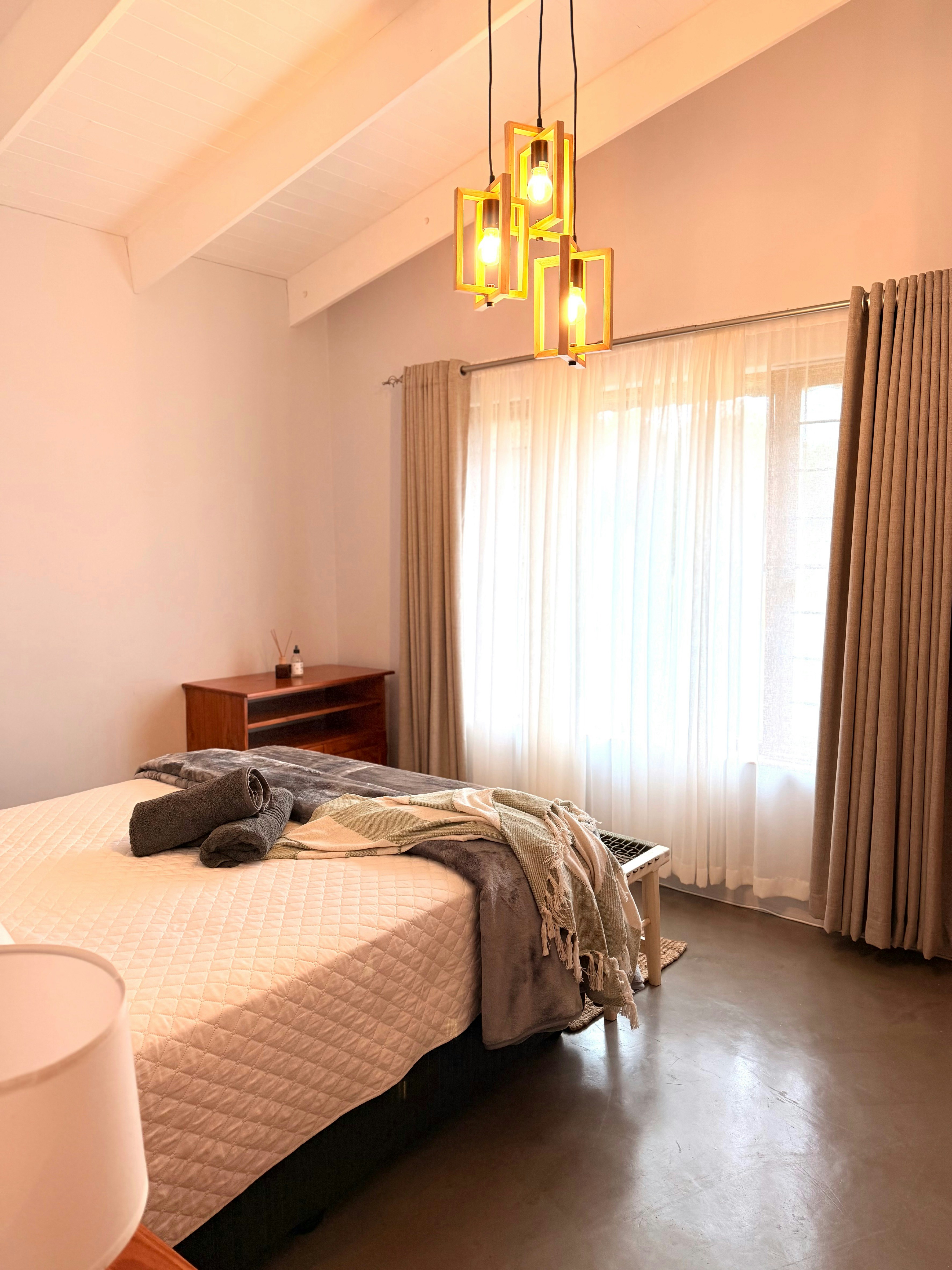 The kitchen is fully equipped for self-catering and includes a fridge-freezer, gas stove, oven, microwave, kettle, tea- and coffee-making facilities, and a washing machine. The open-plan living area includes comfortable seating spaces, a Smart TV with streaming services and stunning views overlooking into the mountains. Guests can enjoy a fireplace and an indoor braai area. Wi-Fi is provided.