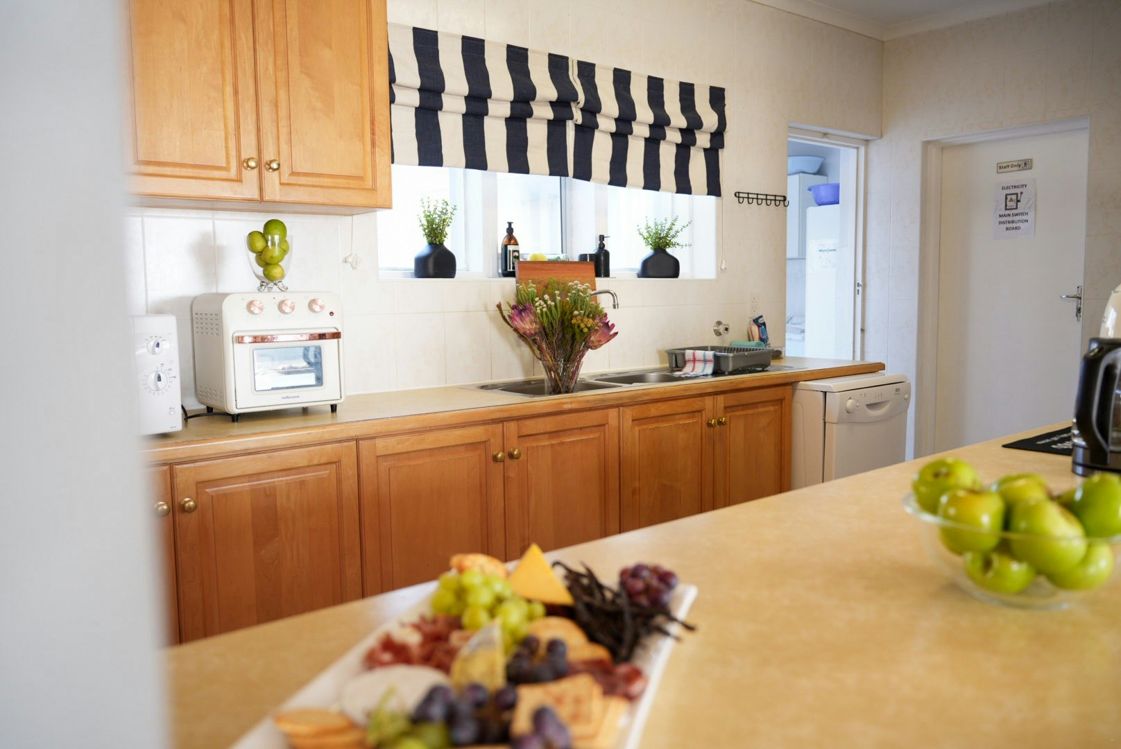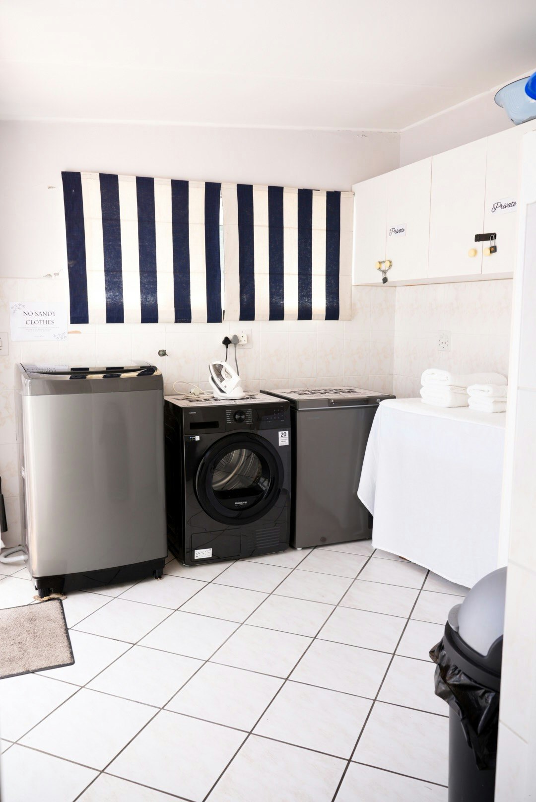 At the heart of the home is the open plan kitchen, dining and living area. The kitchen is fully equipped for self-catering and includes a gas stove, oven, microwave, fridge freezer, dishwasher, ice machine, coffee machine, kettle and toaster. A separate laundry room features a washing machine, tumble dryer and an additional gas stove, making the home well-suited for longer stays.