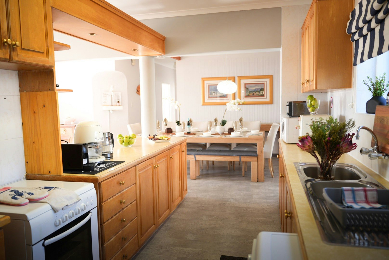 The living room offers comfortable seating and a flat screen TV, ideal for unwinding after a day exploring Yzerfontein. Sliding doors lead to the front of the house, where guests can enjoy uninterrupted ocean views and the soothing sound of the waves. The dining area, with its large 10-seater table, flows into the indoor braai area and second lounge, creating an inviting space for gatherings throughout the year.