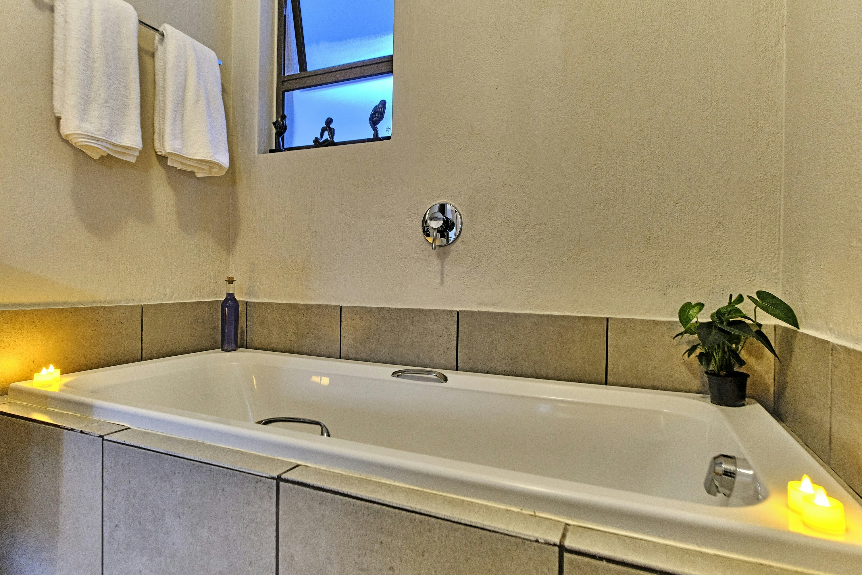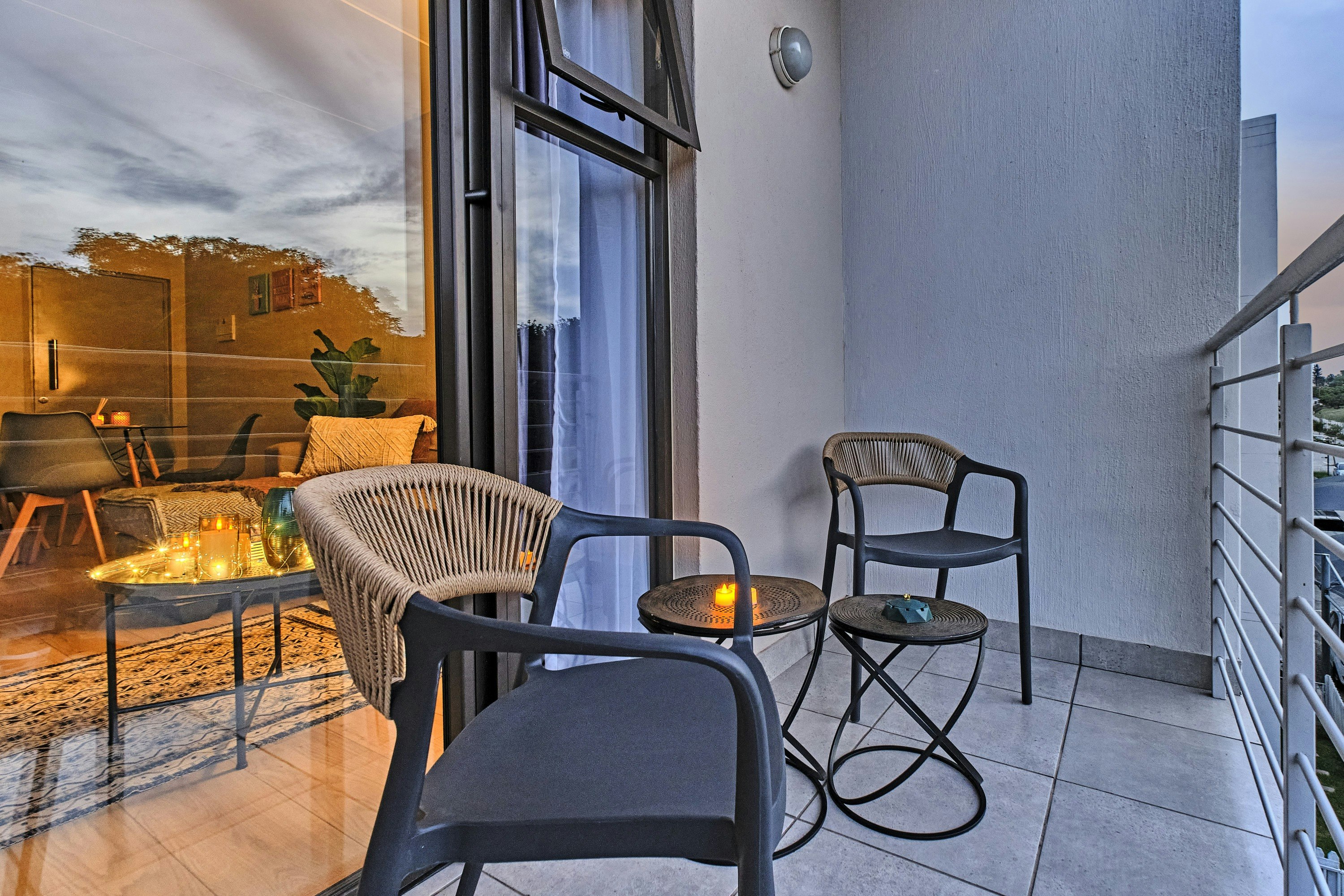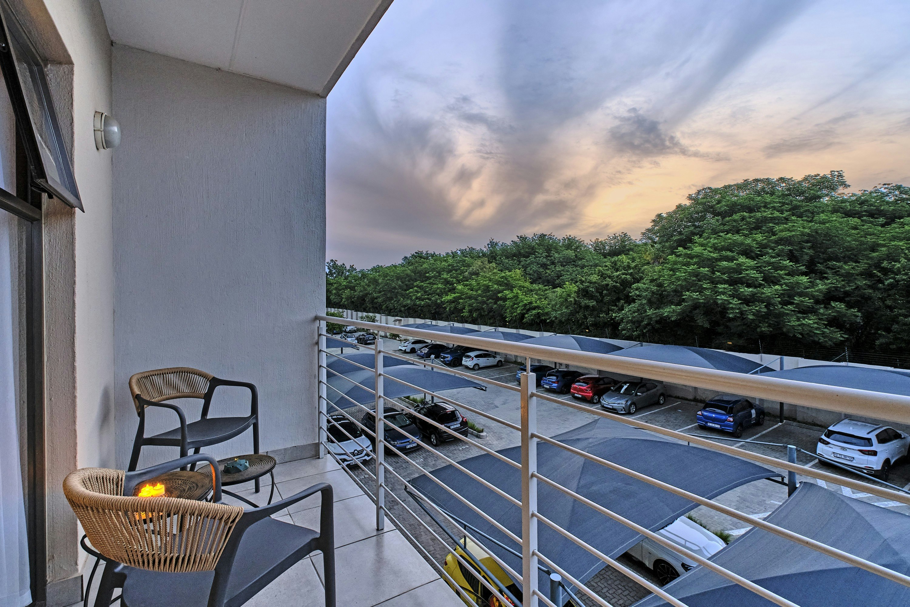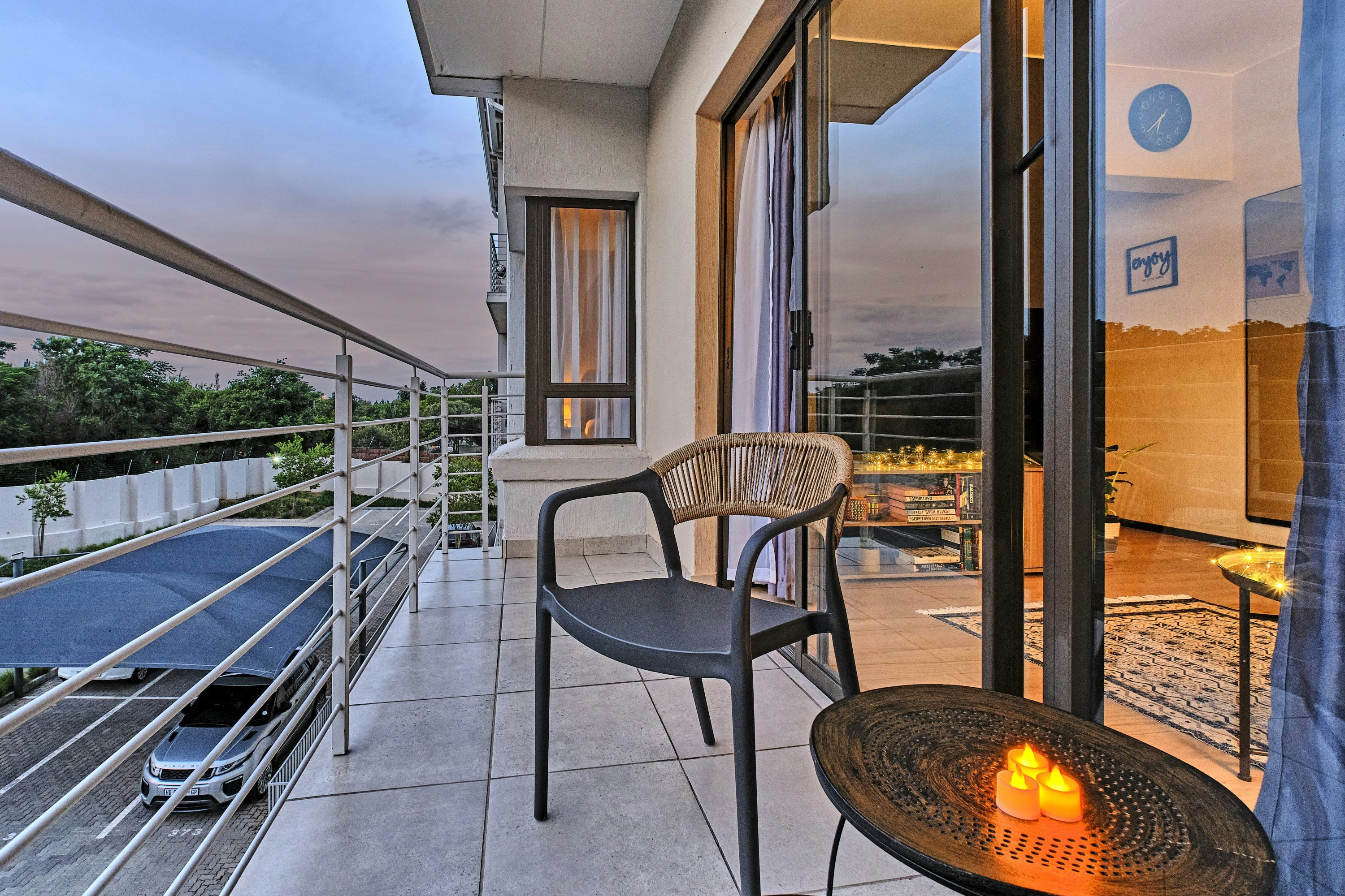 Guests can relax on the balcony with outdoor seating, ideal for sundowners. During hot summer days, guests have access to the complex swimming pool for a refreshing break.
