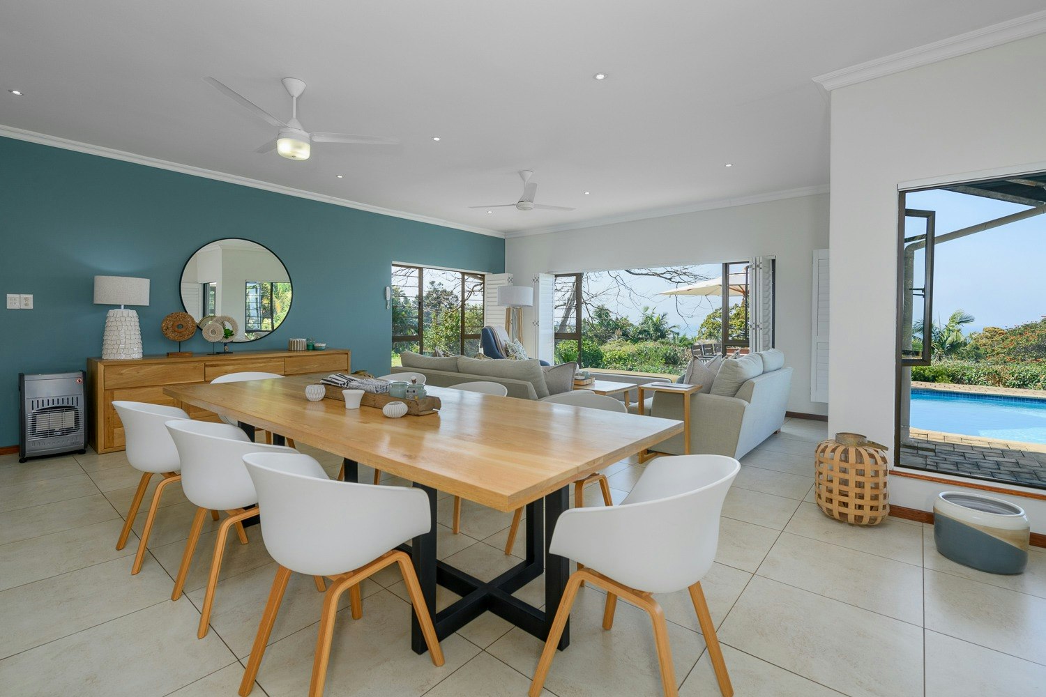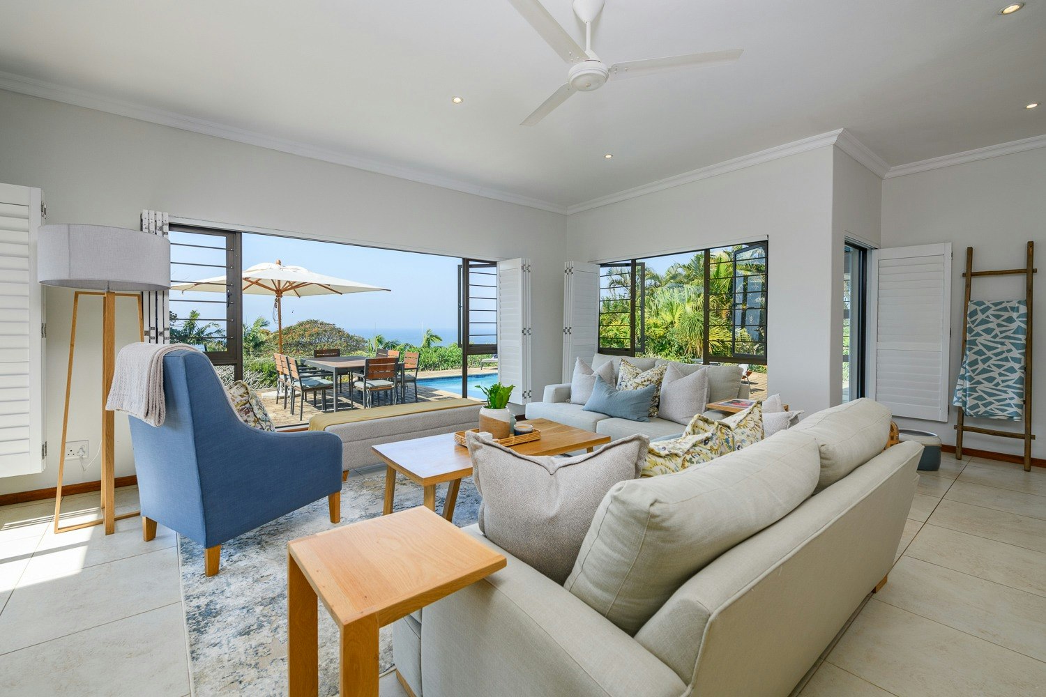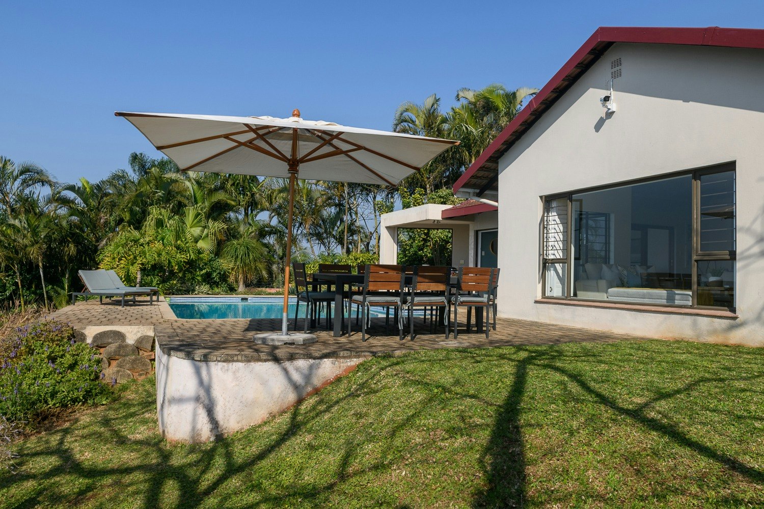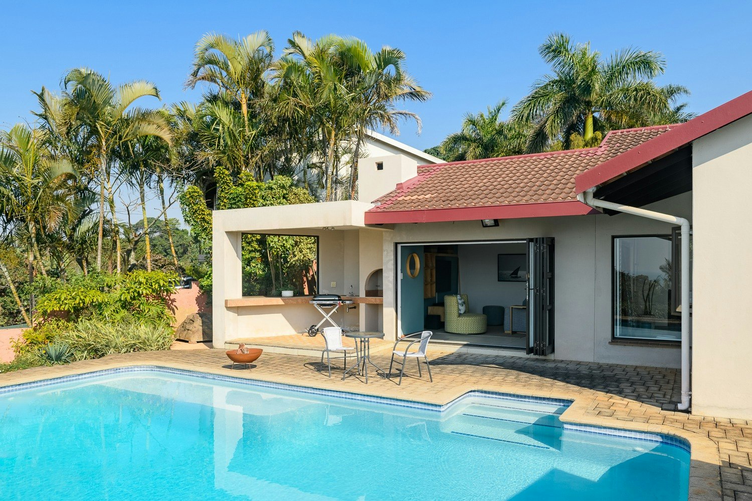 Guests can enjoy an undercover patio with a braai, a swimming pool and outdoor furniture. An inverter, solar system, back-up water tanks and secure parking is available on the premises. This property is approximately 1.3 km away from Umkombi Beach, with local amenities like shops and restaurants being within close proximity.