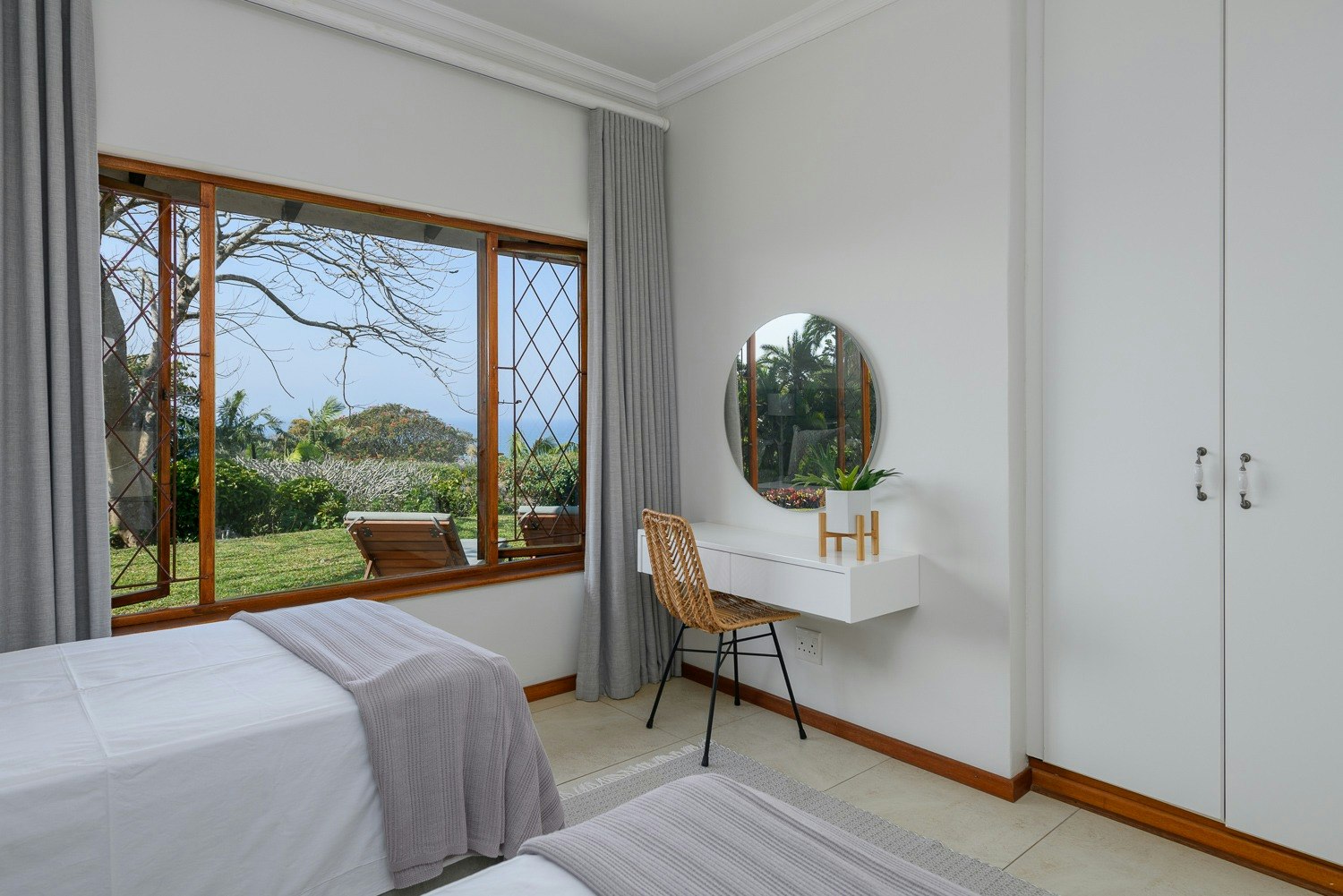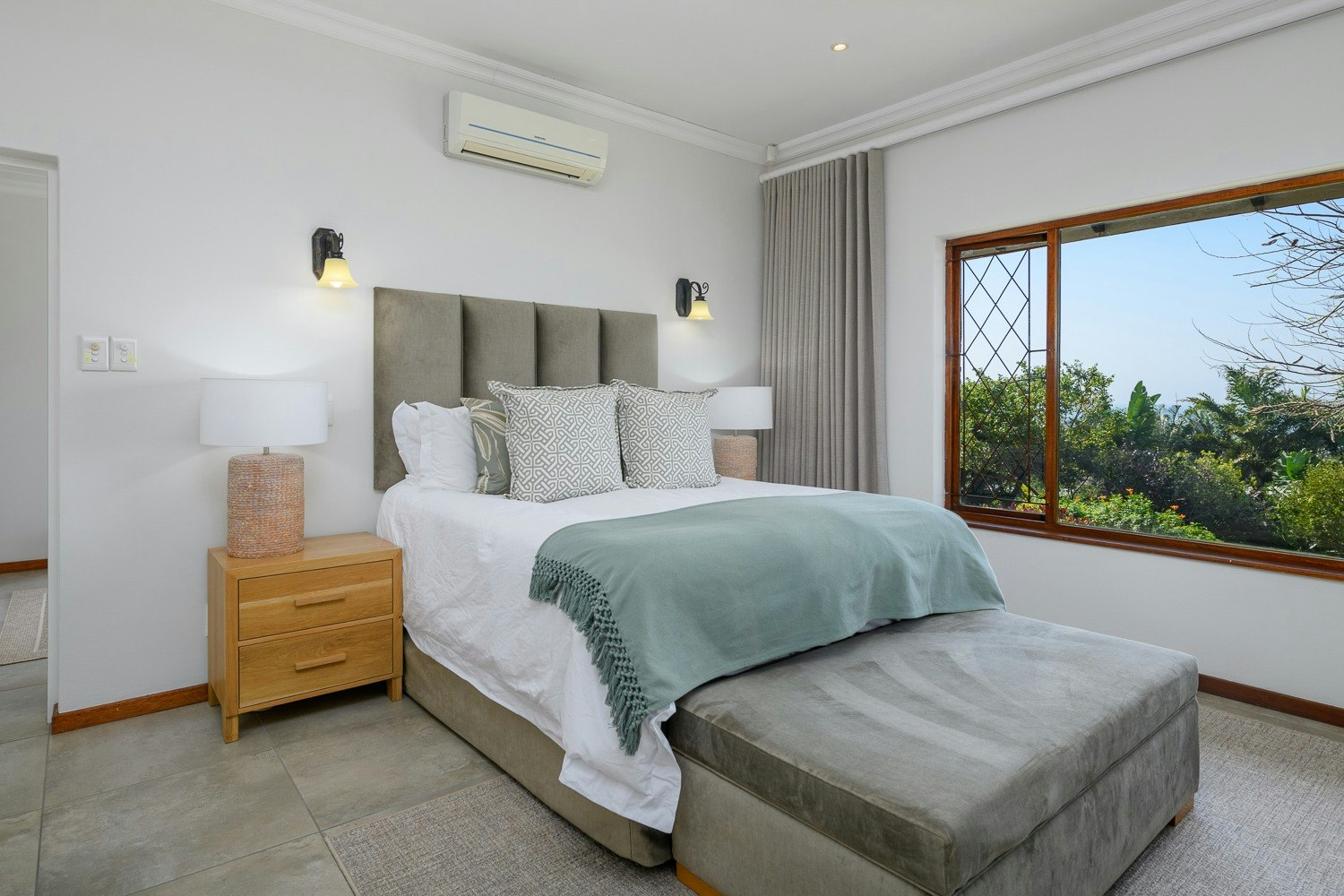 The home can accommodate up to 8 guests in 4 bedrooms and 2 bathrooms. Two of the bedrooms are furnished with a queen-size bed, while the other two bedrooms each contain 2 single beds. The first bedroom has access to an en-suite bathroom, while the other bedrooms share a bathroom. Both of these bathrooms are each fitted with a bath, shower, washbasin and toilet. Linen and bath towels are provided, however guests are required to bring their own swimming towels.