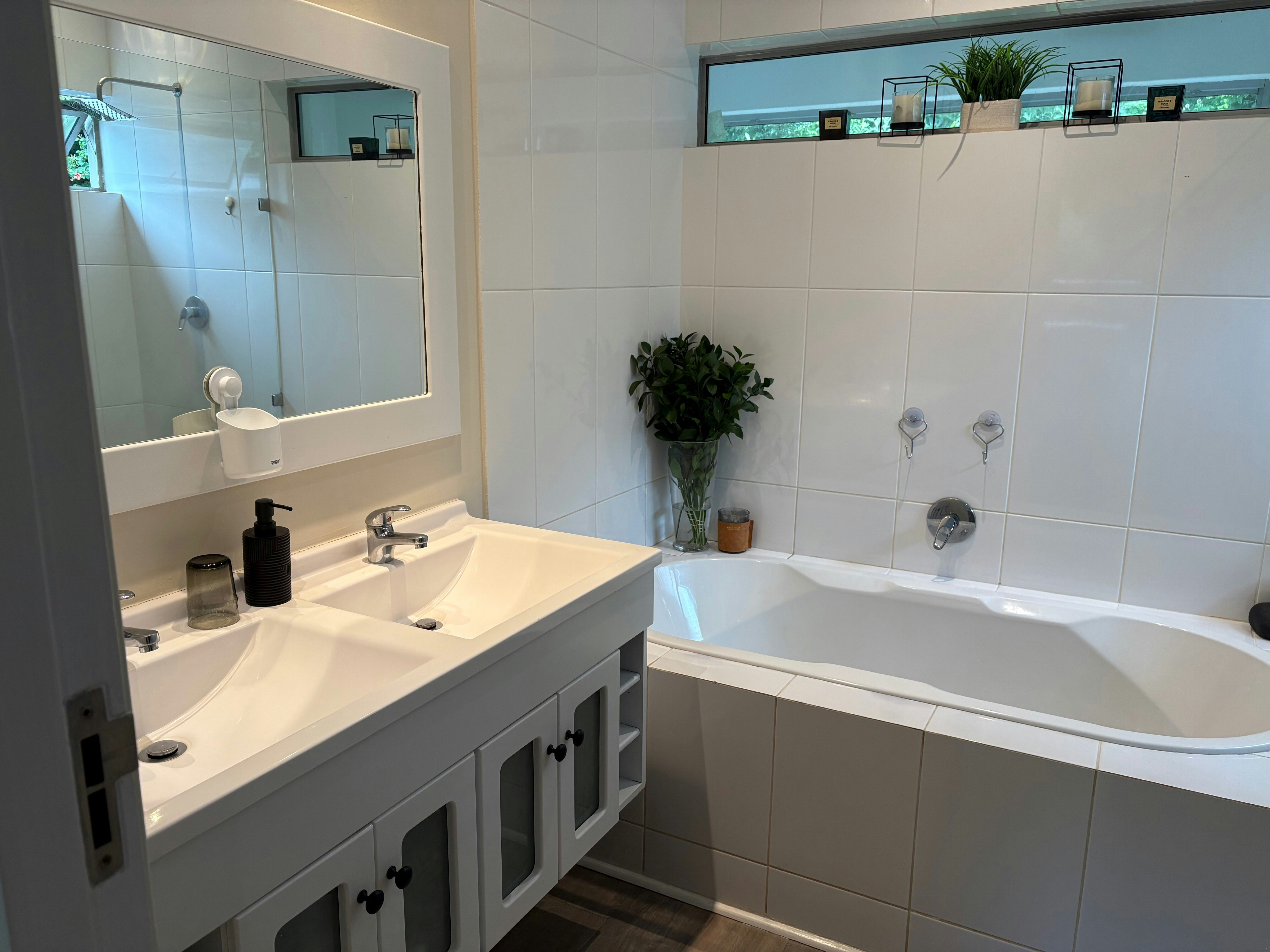 Outside, guests can enjoy a beautiful garden with a trampoline and a swing. There is a built-in braai and outside lounge. The jungle gym is just beyond the garden hedge on the cul-de-sac driveway. The estate offers a range of amenities, including swimming pools, padel courts, boules, dog parks, fishing dams, and scenic golf course strolls after hours.